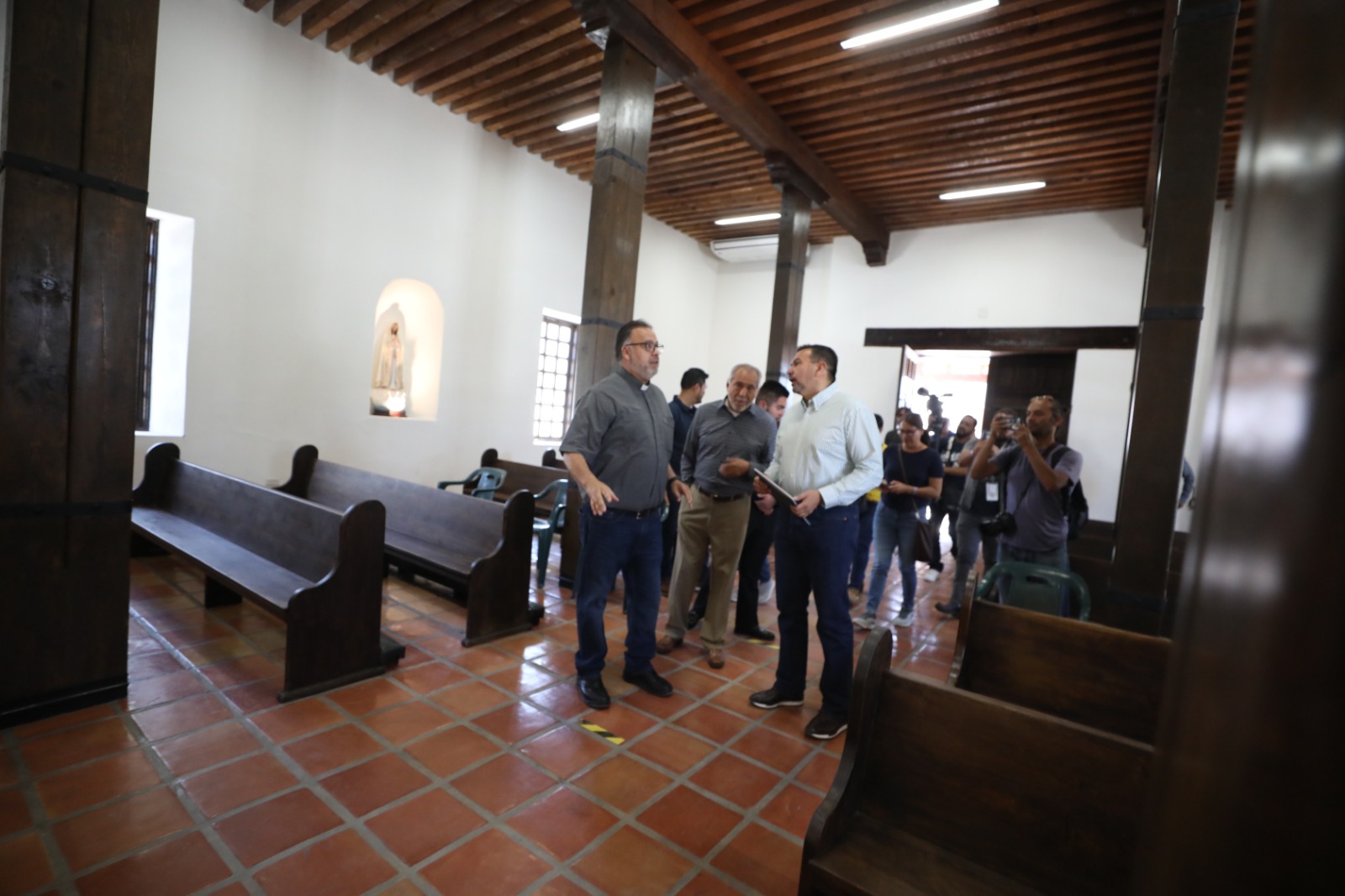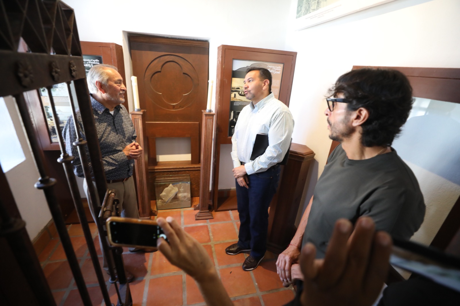 Durante el recorrido, el edil observó la capilla restaurada, mientras que Frausto Ojeda, también historiador, le narraba la historia del lugar.