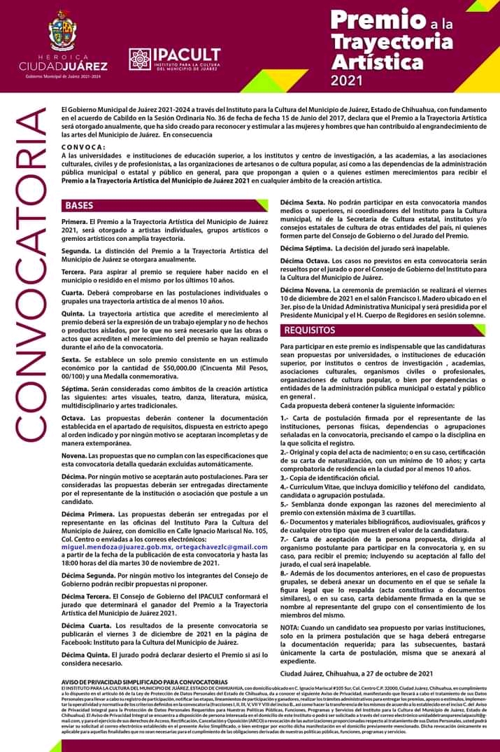 Las candidaturas se estarán recibiendo virtual o presencialmente hasta las 19:00 hrs. de hoy en las oficinas del IPACULT, o a través de los correos electrónicos miguel.mendoza@juarez.gob.mx y ortegachavezlc@gmail.com con límite de tiempo hasta la hora marcada para ser aceptada.