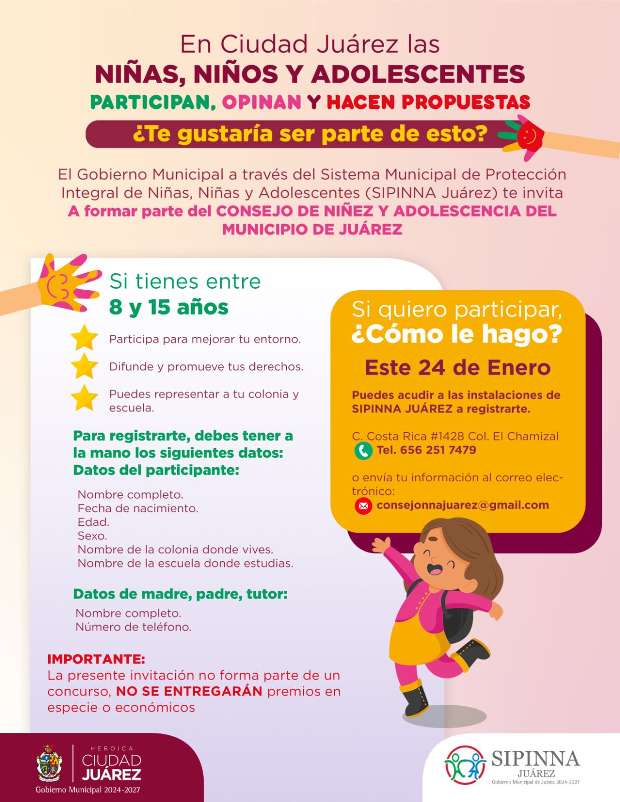 El Gobierno Municipal, a través del Sistema Municipal de Protección Integral de Niñas, Niños y Adolescentes (SIPINNA Juárez), amplió el plazo de la convocatoria para que niñas, niños y adolescentes participen en el Consejo de Niñez y Adolescencia del Municipio de Juárez.
