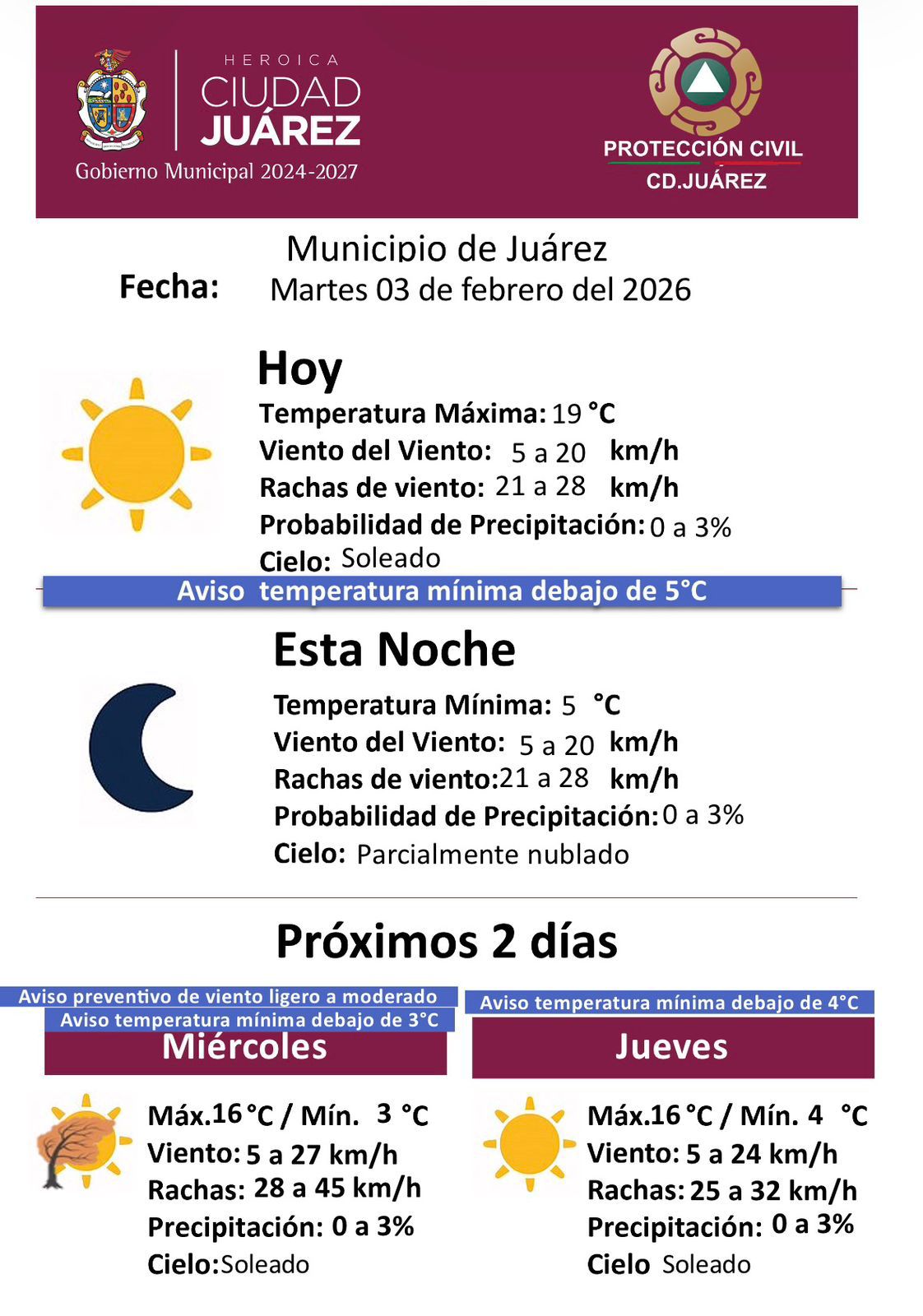 La probabilidad de precipitación continuará baja, entre 0 y 3 por ciento, con aviso preventivo por temperatura mínima por debajo de los 4 grados centígrados.