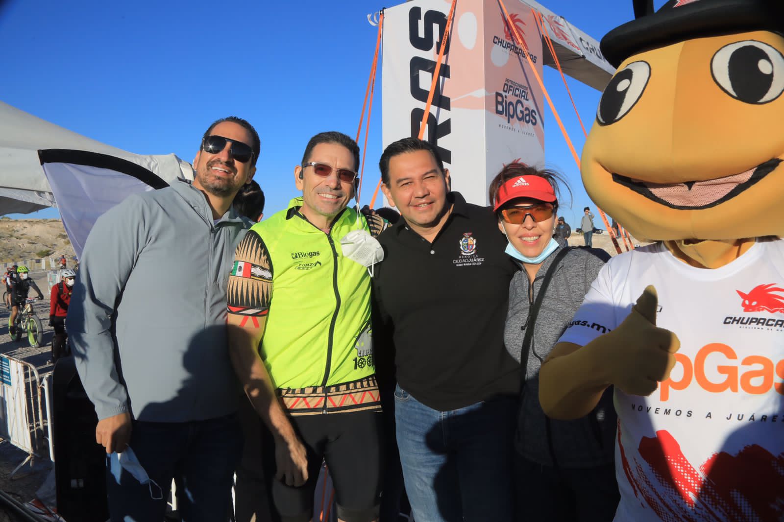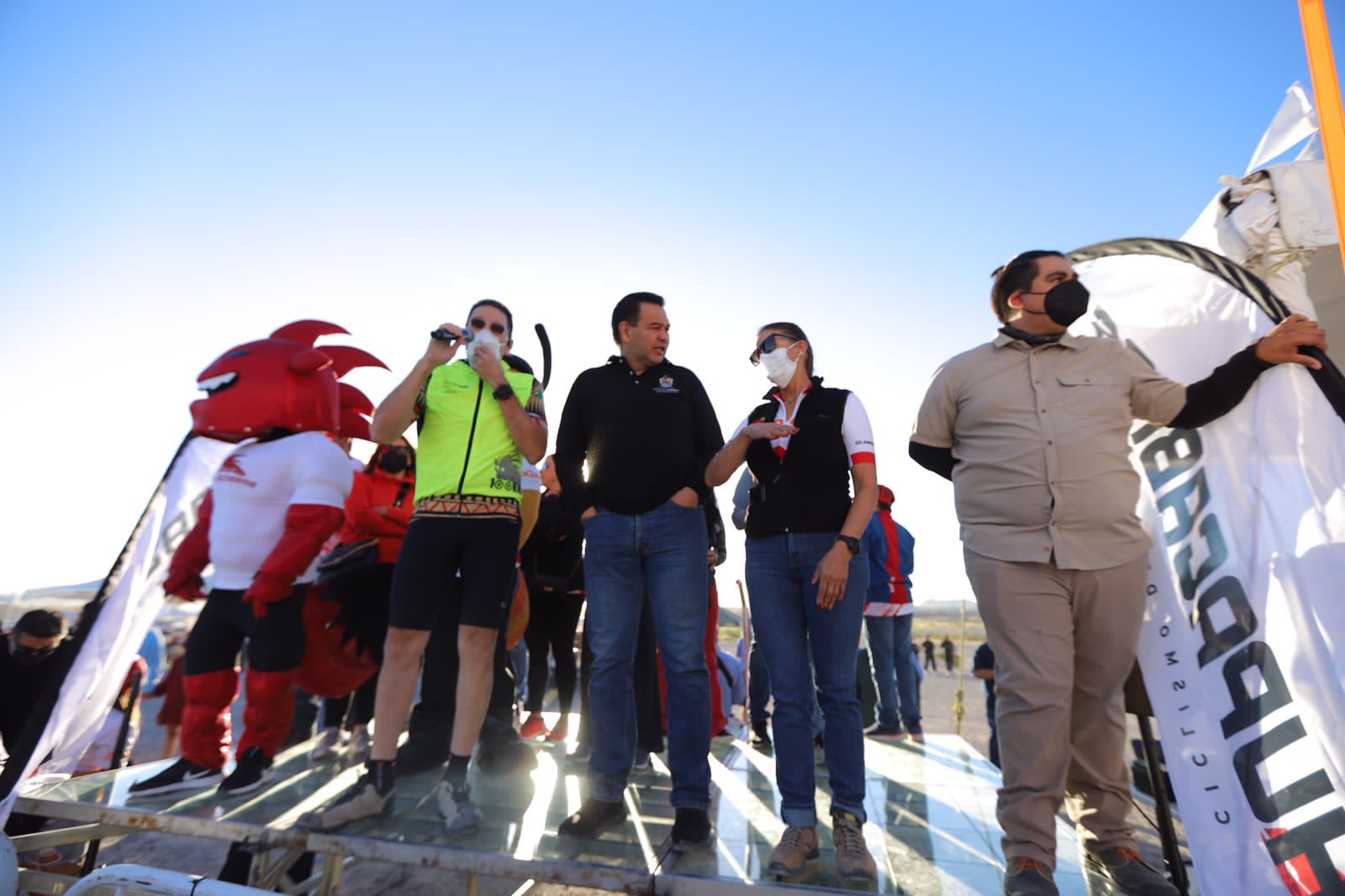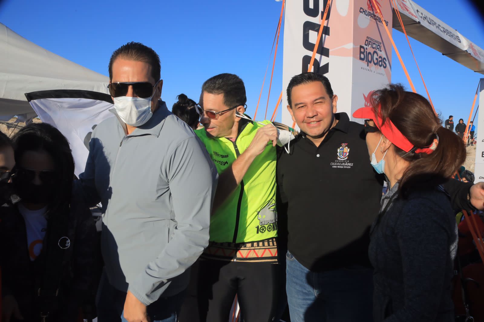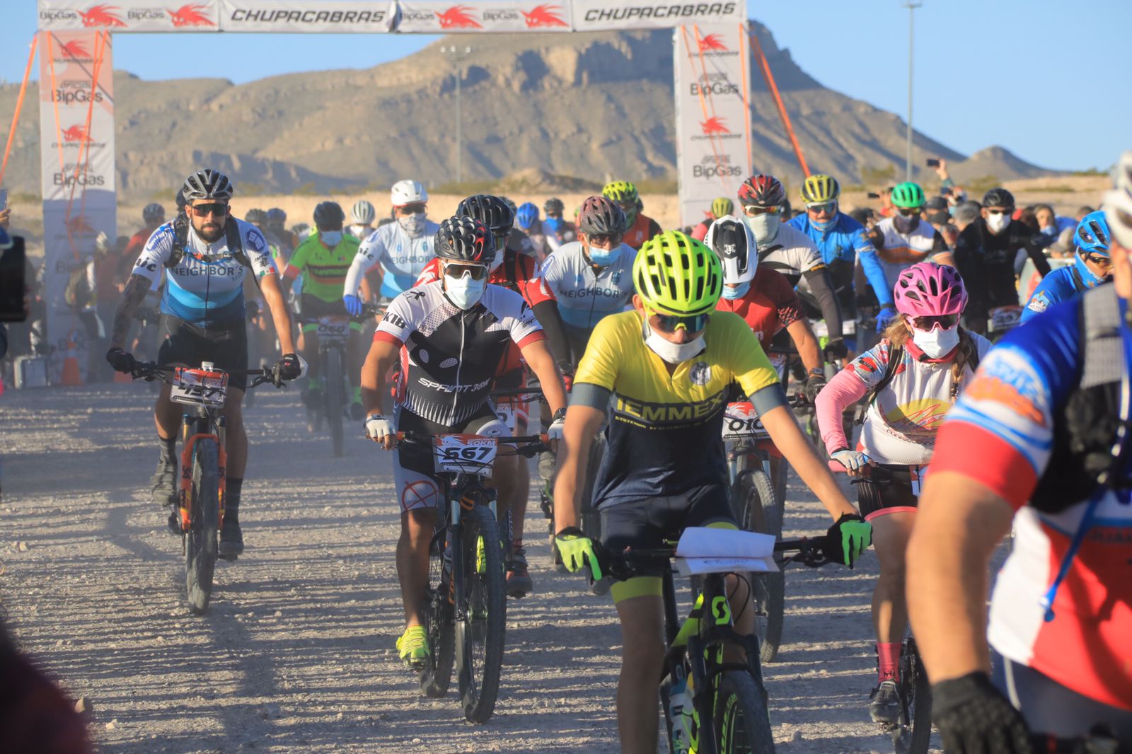 El Presidente Municipal Cruz Pérez Cuéllar dio el banderazo de salida a los ciclistas que participan en la tradicional Carrera Chupacabras 2021, que se lleva a cabo este domingo en la pista de Don Rayo, al poniente de la ciudad.