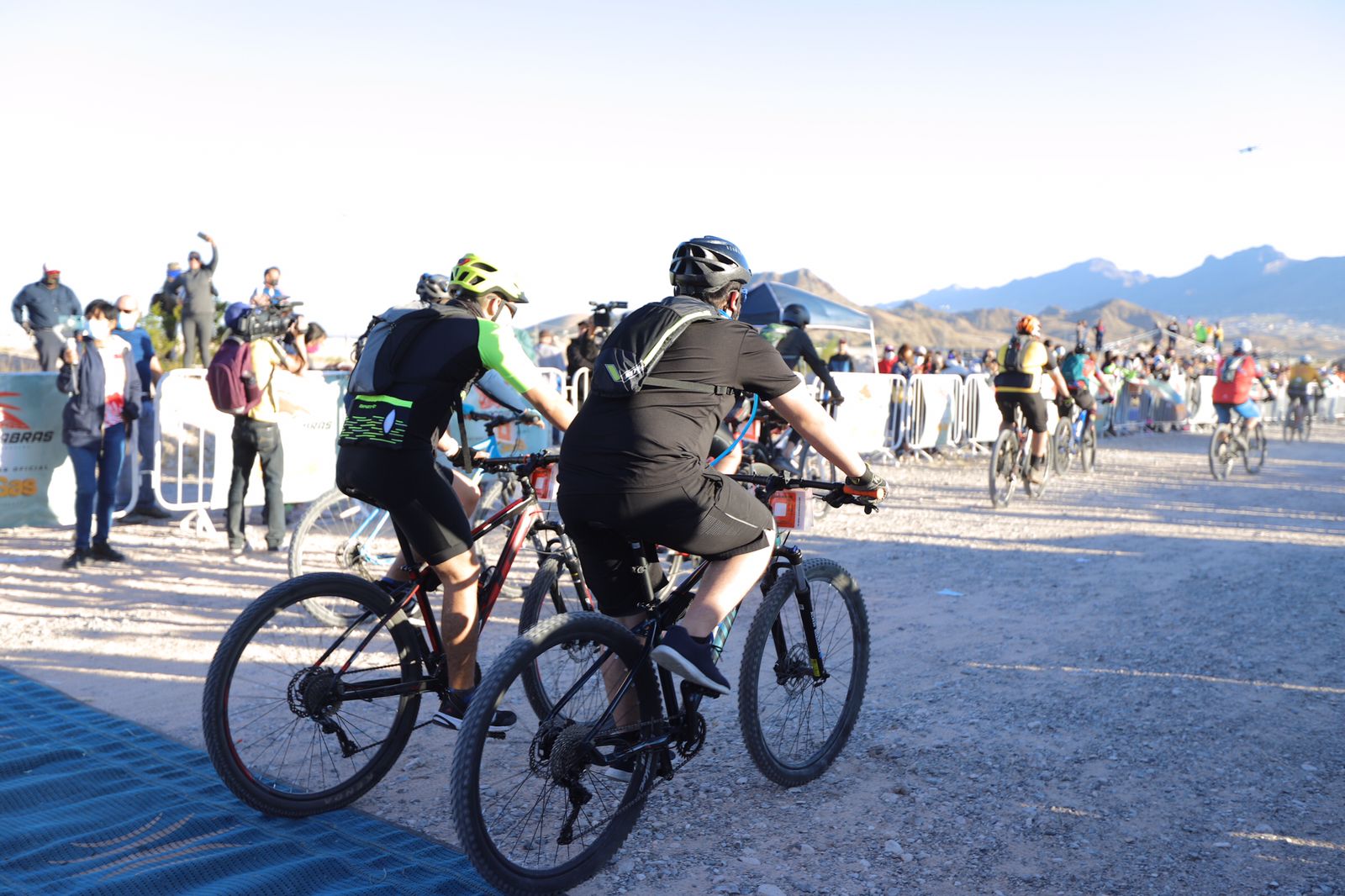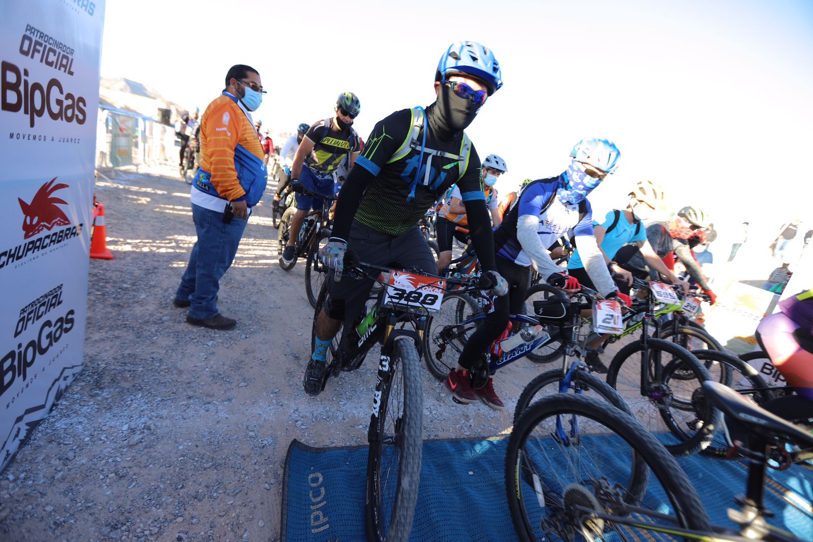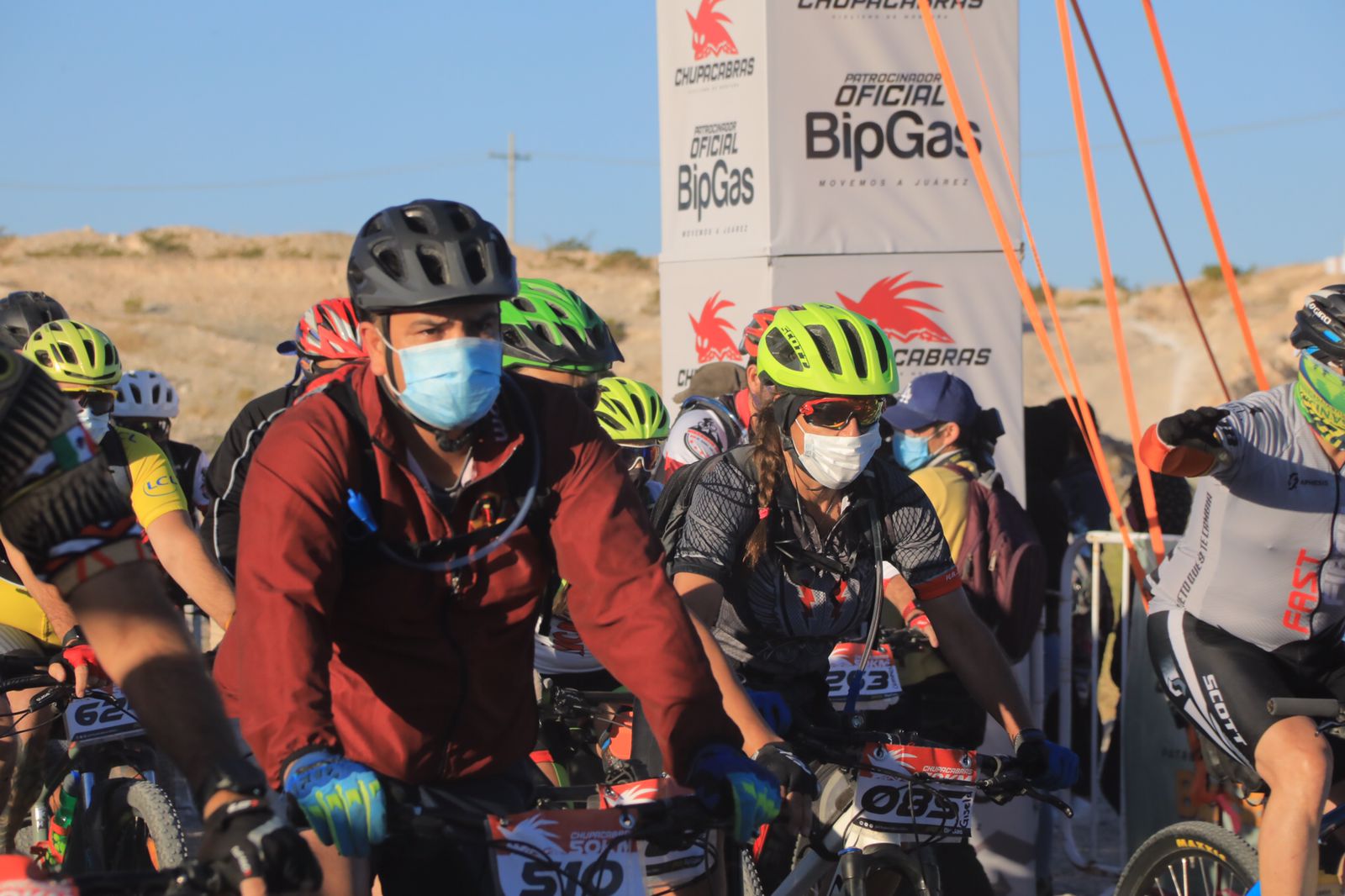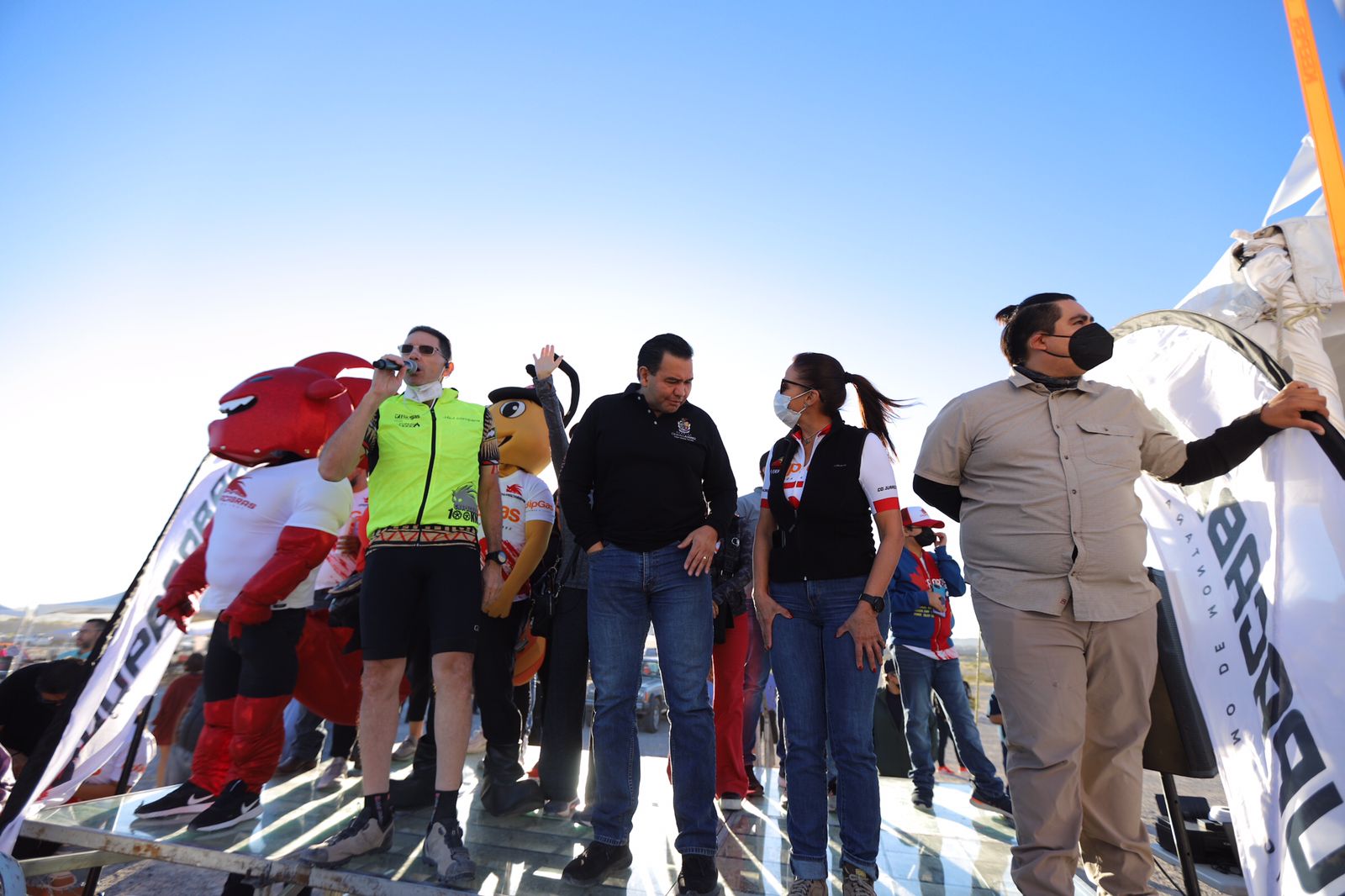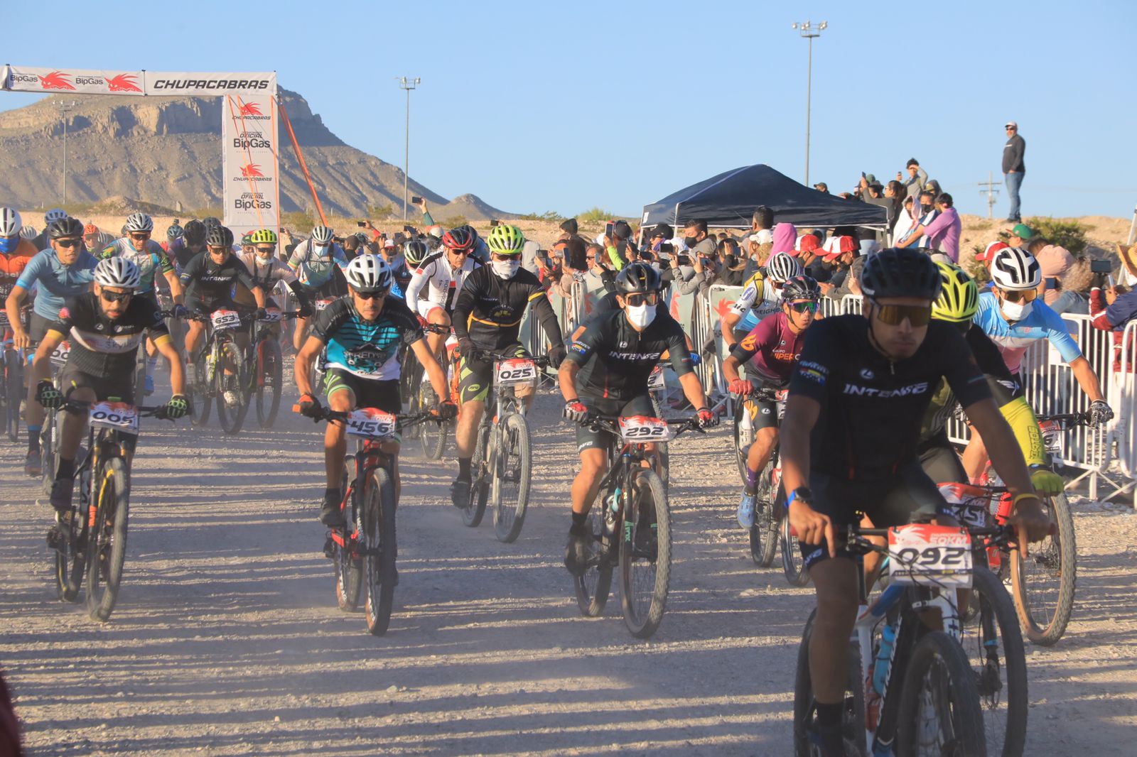 El Presidente Municipal Cruz Pérez Cuéllar dio el banderazo de salida a los ciclistas que participan en la tradicional Carrera Chupacabras 2021, que se lleva a cabo este domingo en la pista de Don Rayo, al poniente de la ciudad.