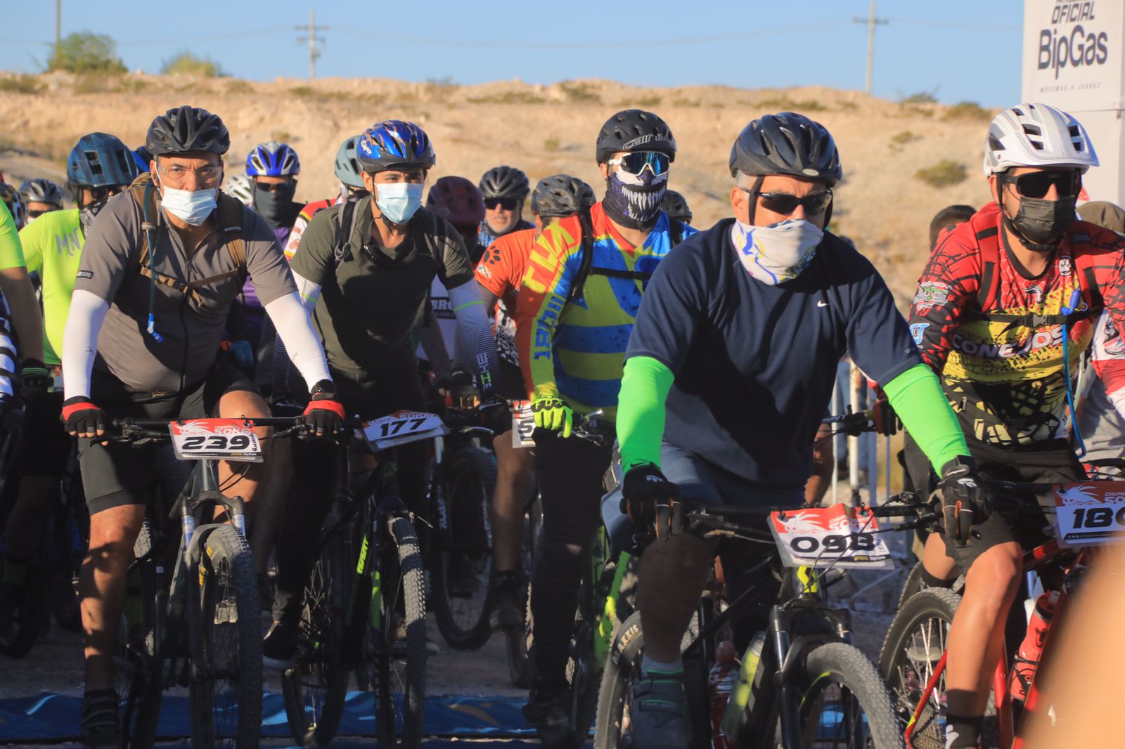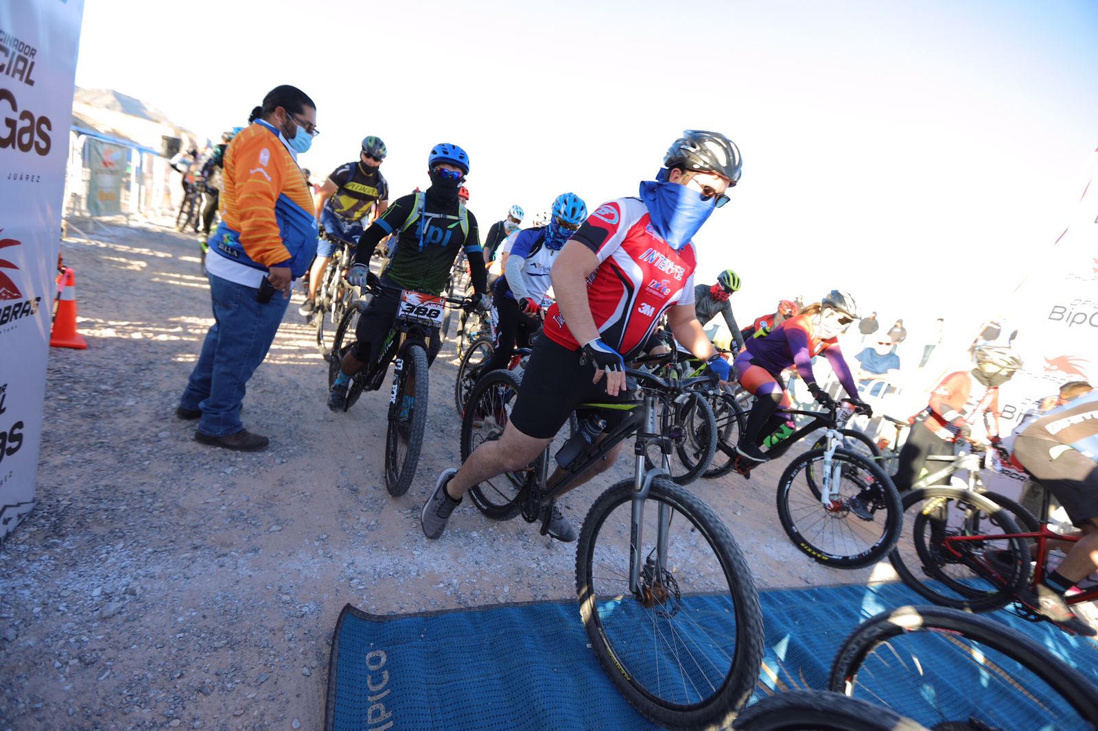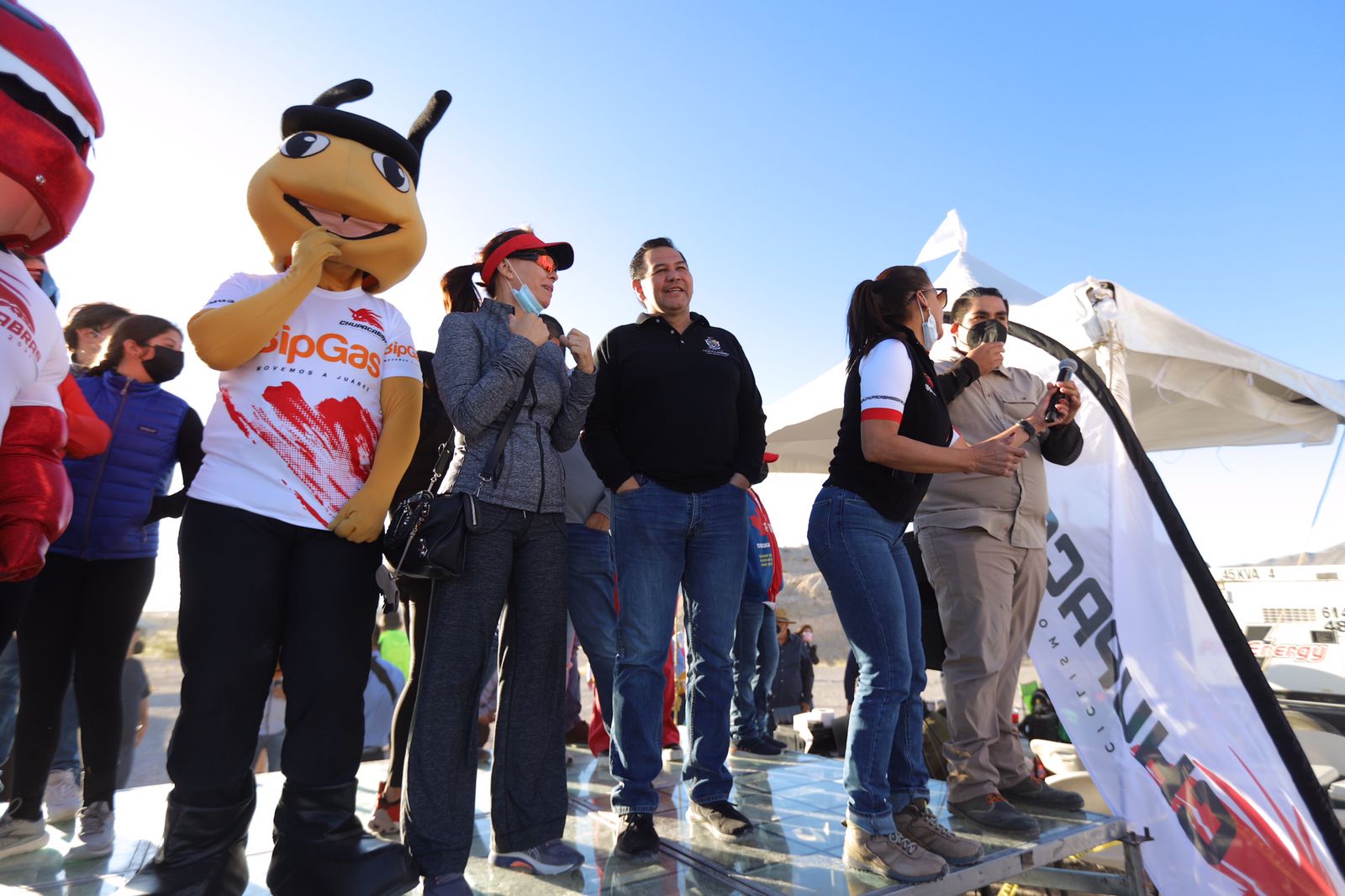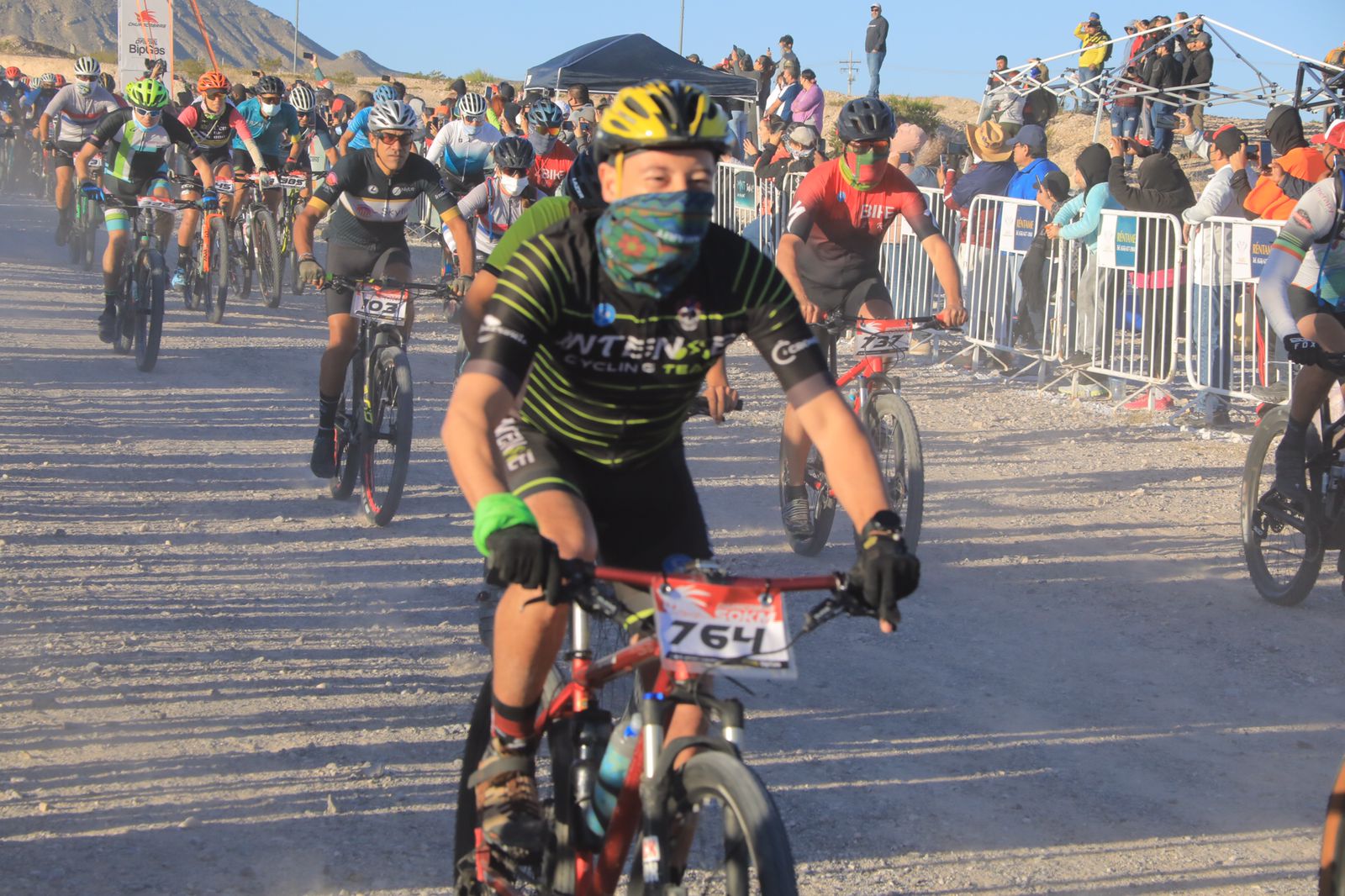 El Presidente Municipal Cruz Pérez Cuéllar dio el banderazo de salida a los ciclistas que participan en la tradicional Carrera Chupacabras 2021, que se lleva a cabo este domingo en la pista de Don Rayo, al poniente de la ciudad.