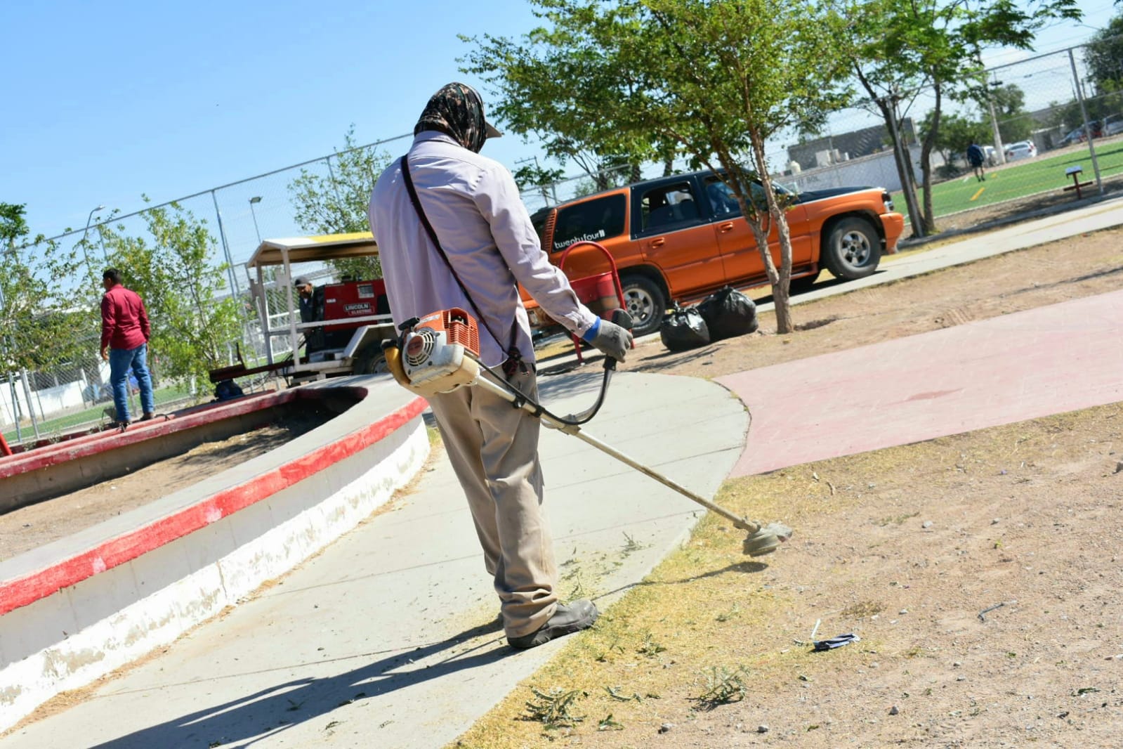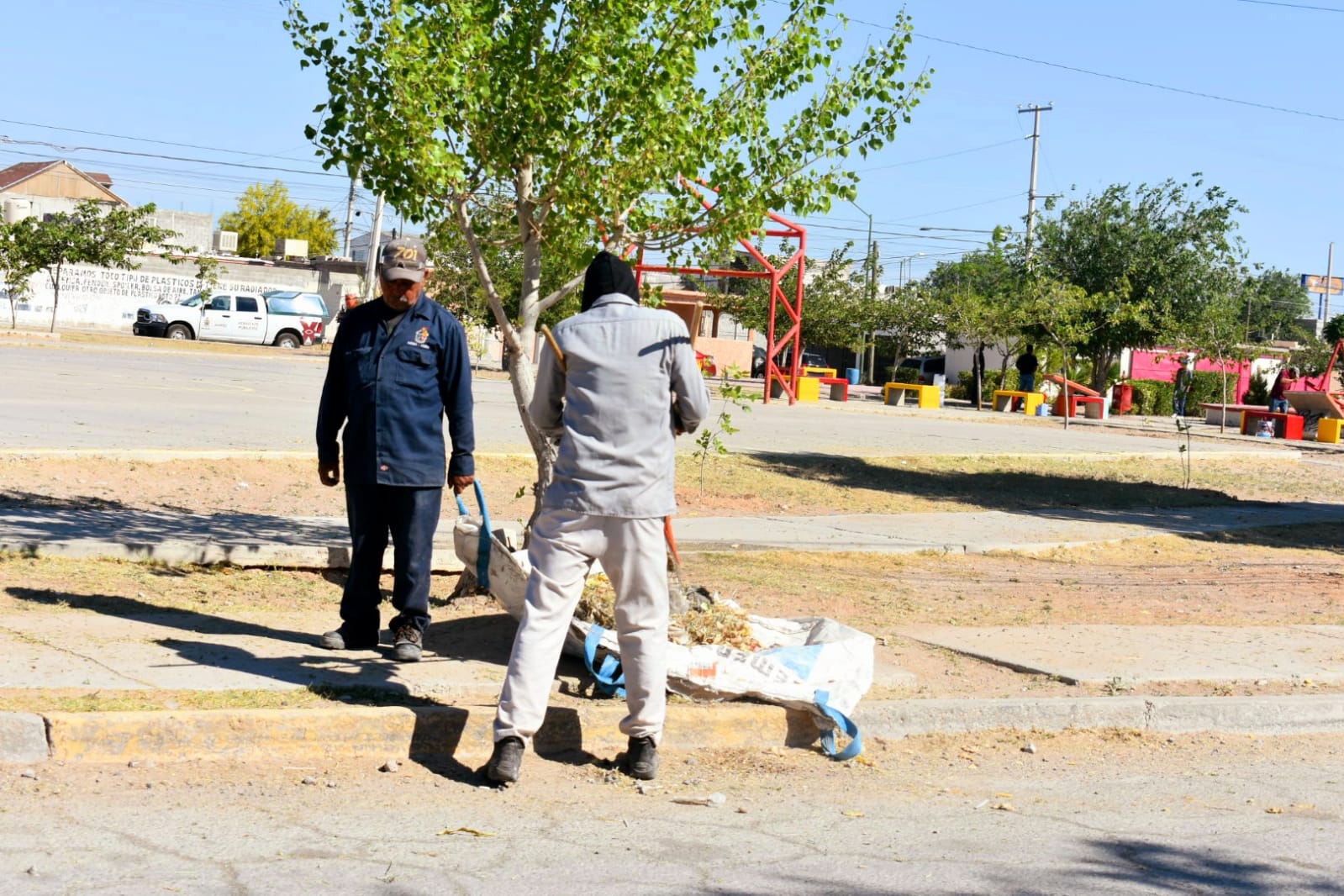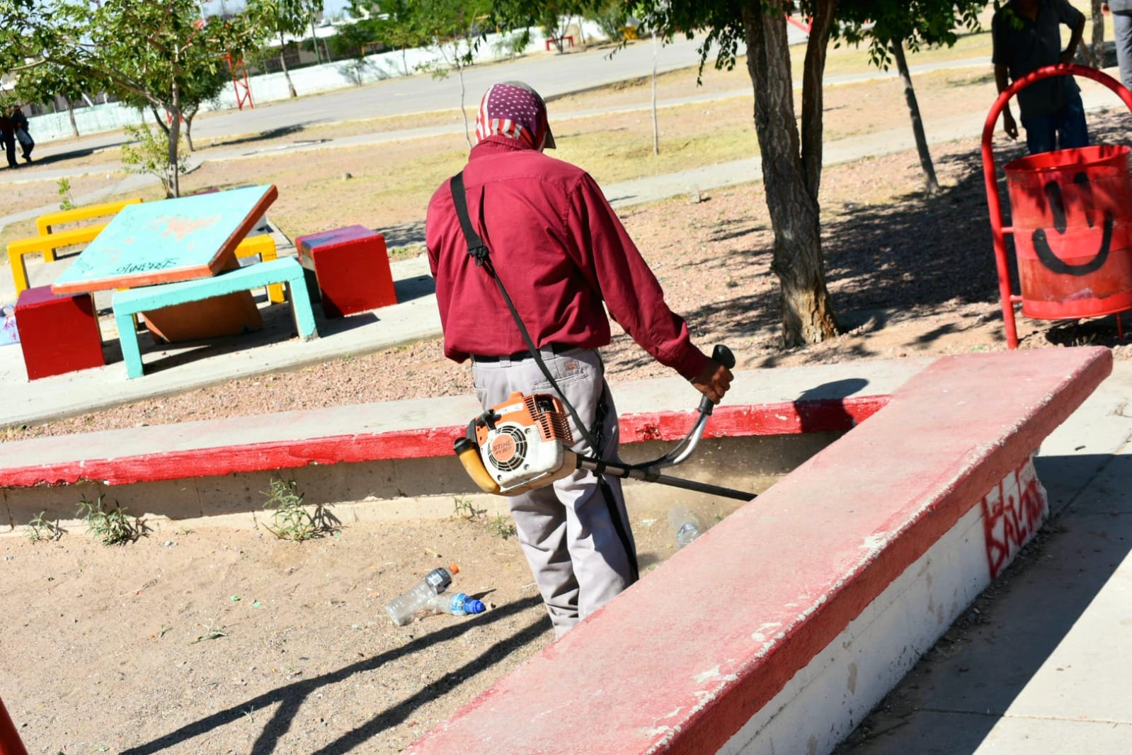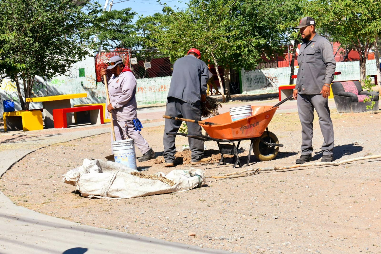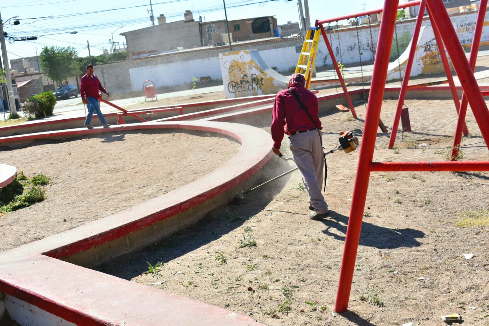 Como parte de las acciones para darle mantenimiento a las áreas verdes en distintos puntos de la ciudad, personal de la Dirección de Parques y Jardines realiza trabajos en el parque Pradera del Palmarejo de la colonia Pradera de la Sierra.