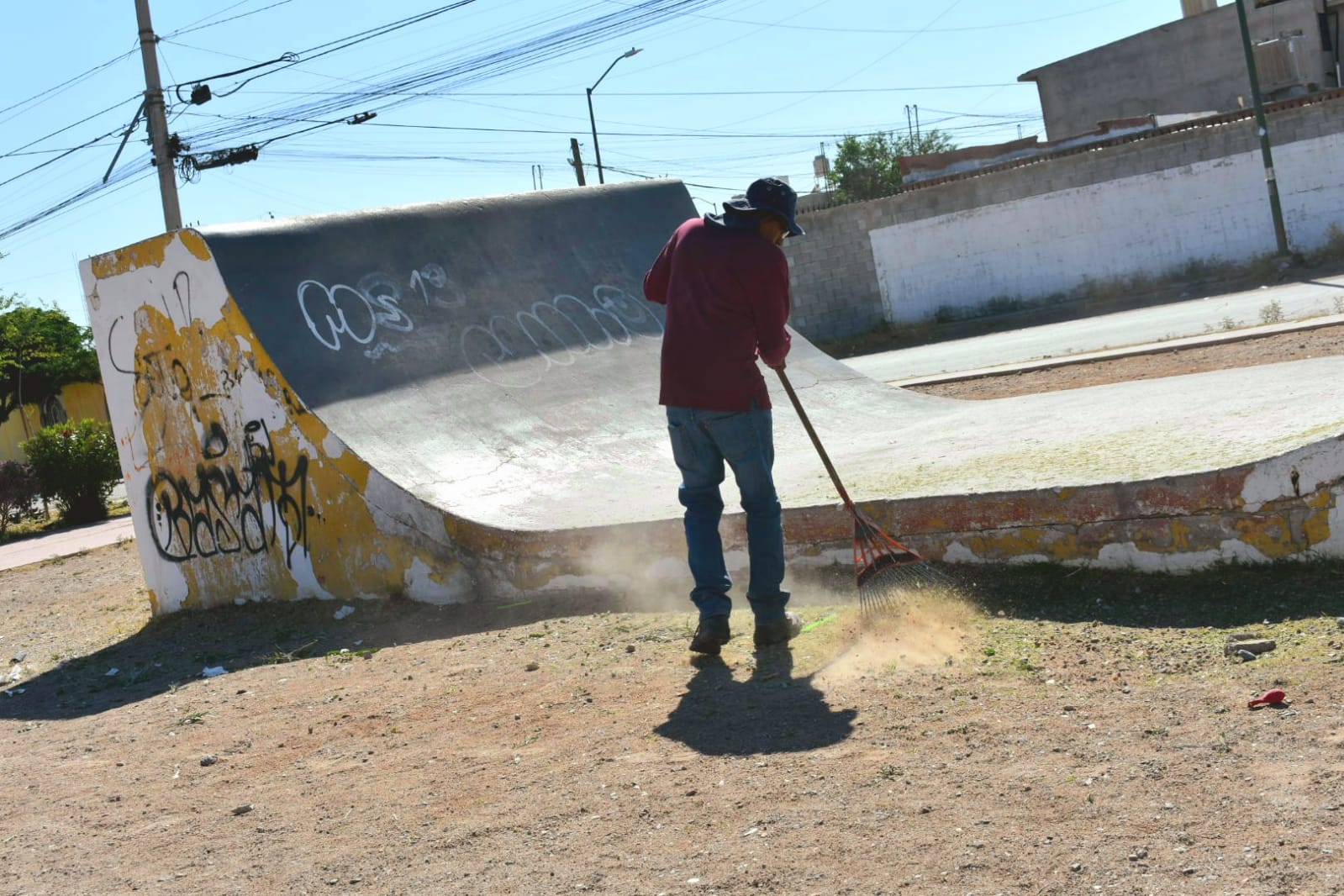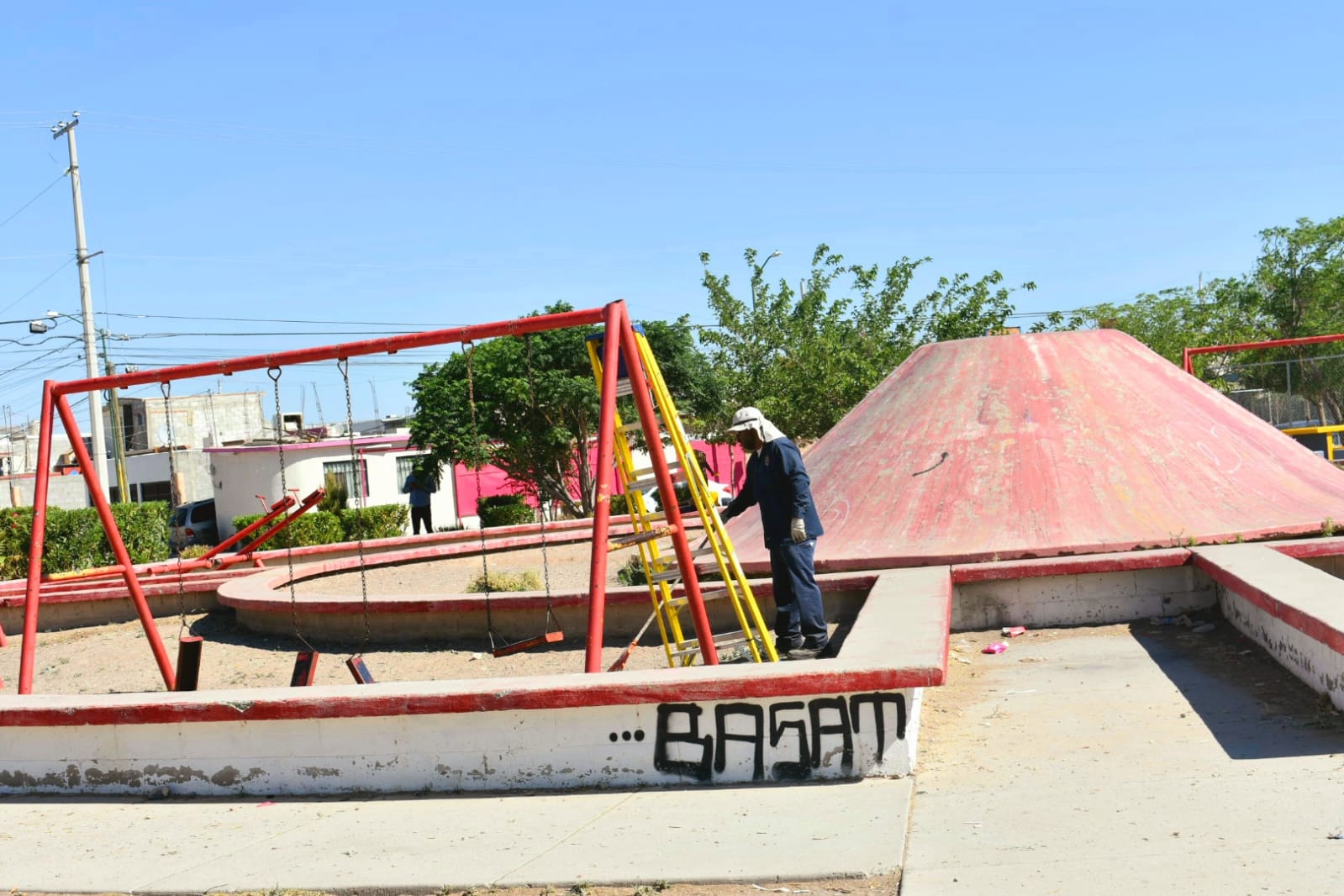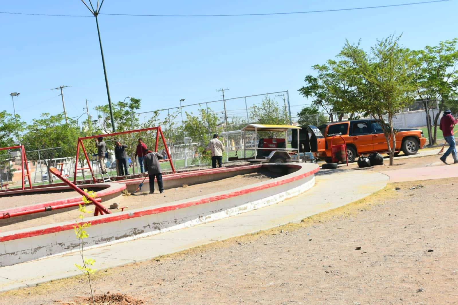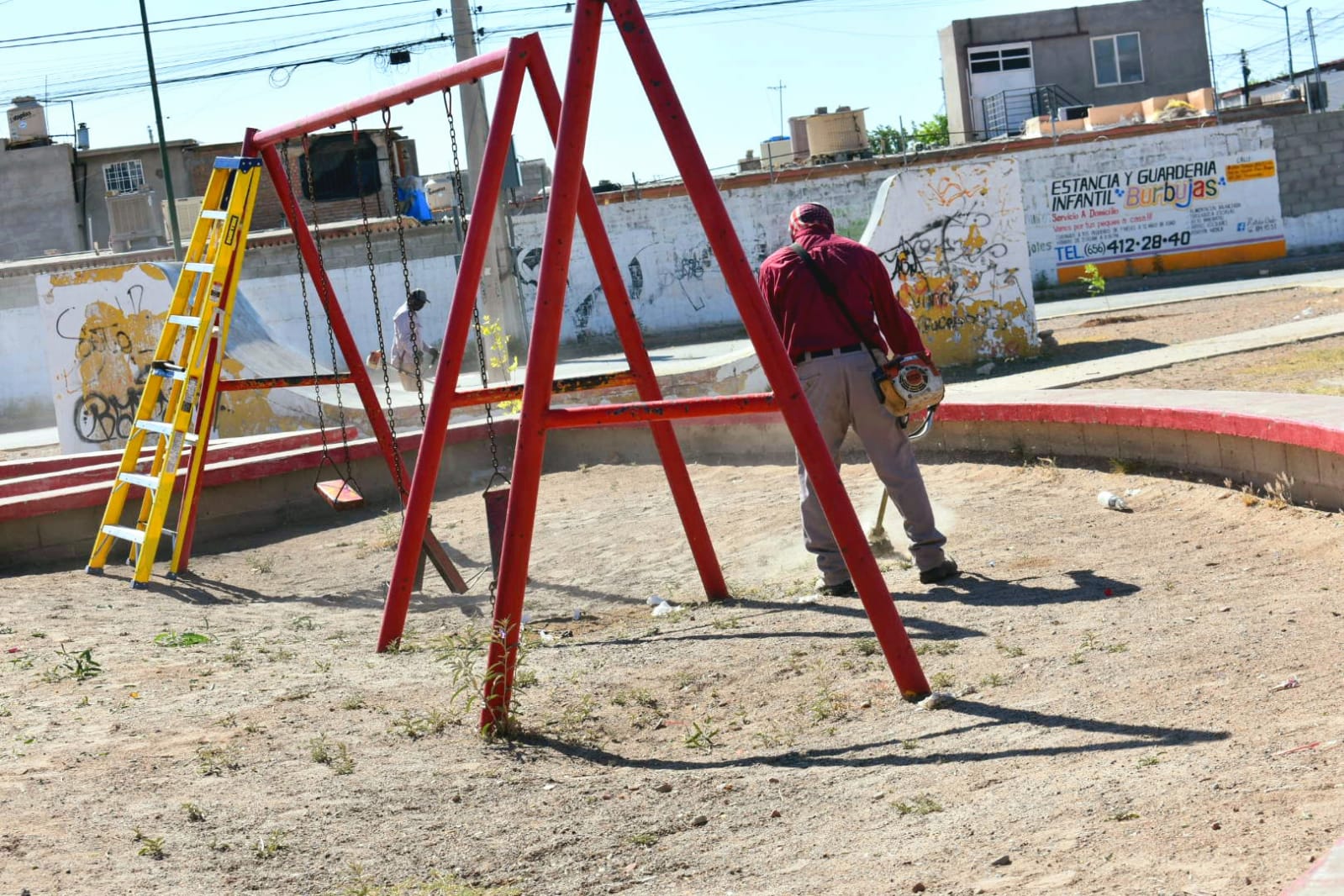 Como parte de las acciones para darle mantenimiento a las áreas verdes en distintos puntos de la ciudad, personal de la Dirección de Parques y Jardines realiza trabajos en el parque Pradera del Palmarejo de la colonia Pradera de la Sierra.
