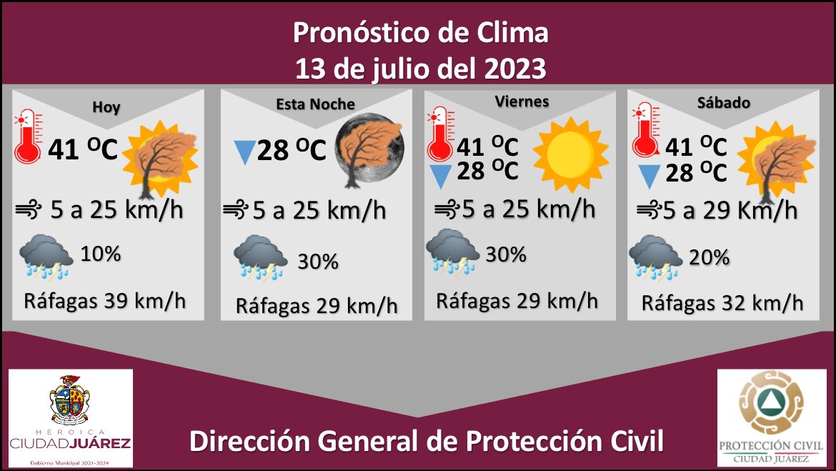 Roberto Briones Mota, titular de la dependencia, dijo que para este día se espera una temperatura máxima de 41 °C y mínima de 28 °C, la velocidad del viento oscilará de 5 a 25 kilómetros por hora.