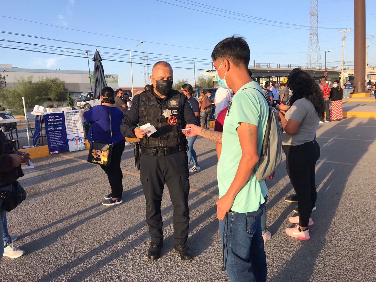 A 21 de septiembre del 2021.- Elementos de la Secretaría de Seguridad Pública Municipal adscritos a la Dirección de Prevención Social entregaron información a la ciudadanía a través de trípticos acerca de los números comunitarios de las siete estaciones de policía que se encuentran en la ciudad.