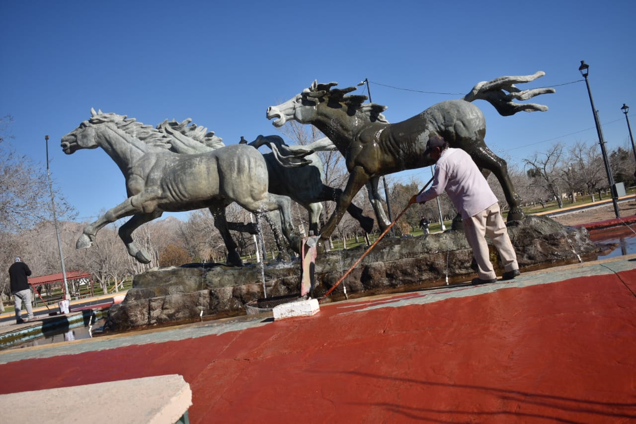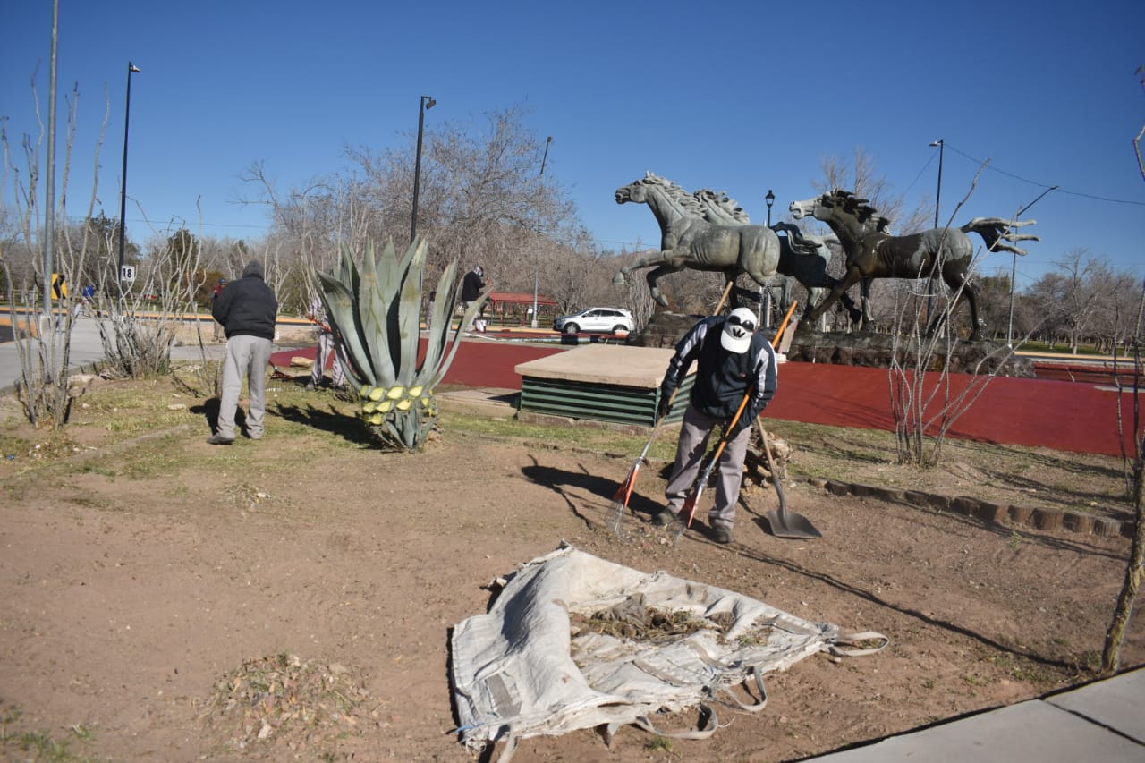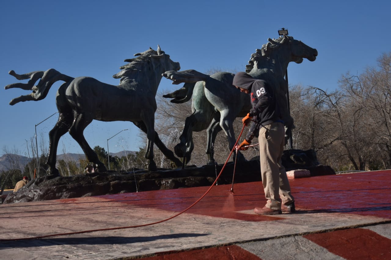 Personal de Parques y Jardines trabaja este viernes en la limpieza y mantenimiento del monumento Los Indomables, ubicado sobre la avenida De Las Américas a la altura del parque El Chamizal, dio a conocer Daniel Iván Zamarrón Saldaña, titular de la dependencia.