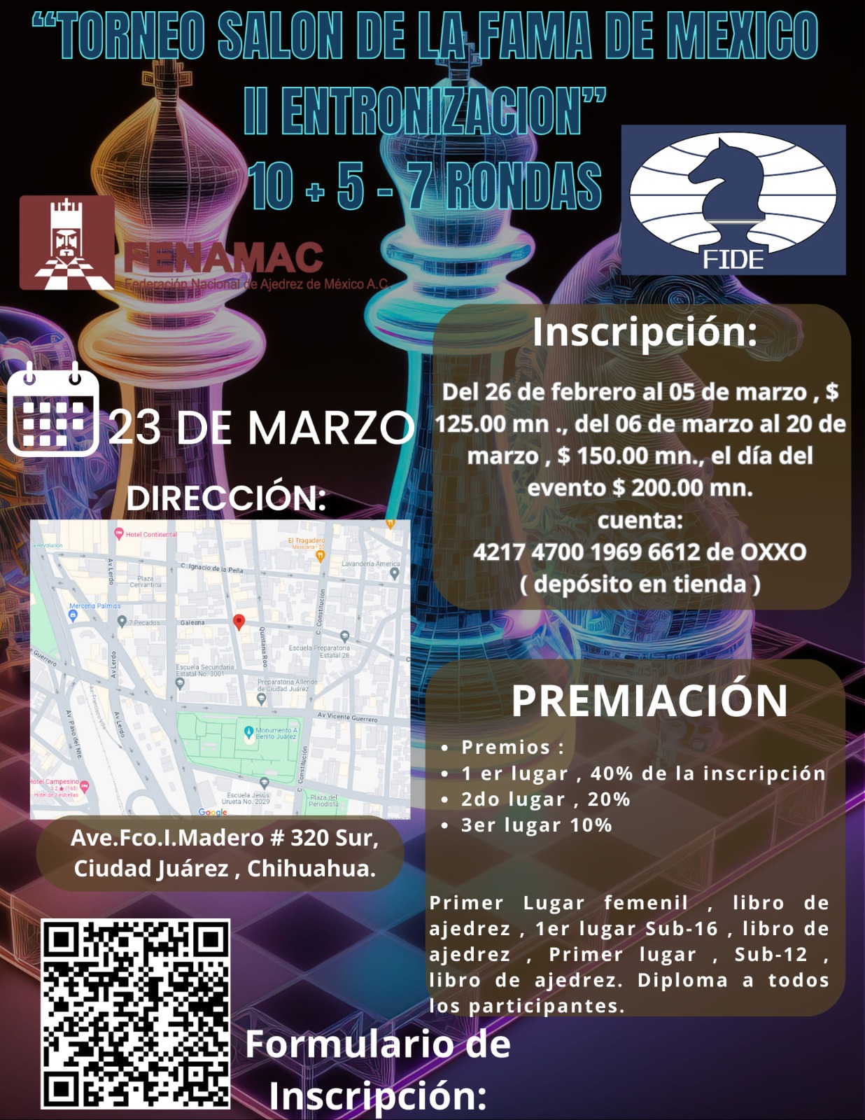 El evento se realizará el próximo sábado 23 de marzo, a las 10:45 de la mañana, en las instalaciones del Salón del Ajedrez, ubicado en la calle Francisco I. Madero 320 sur, cerca de la Plaza Benito Juárez, dio a conocer el presidente del Salón de la Fama, Gustavo Maass.