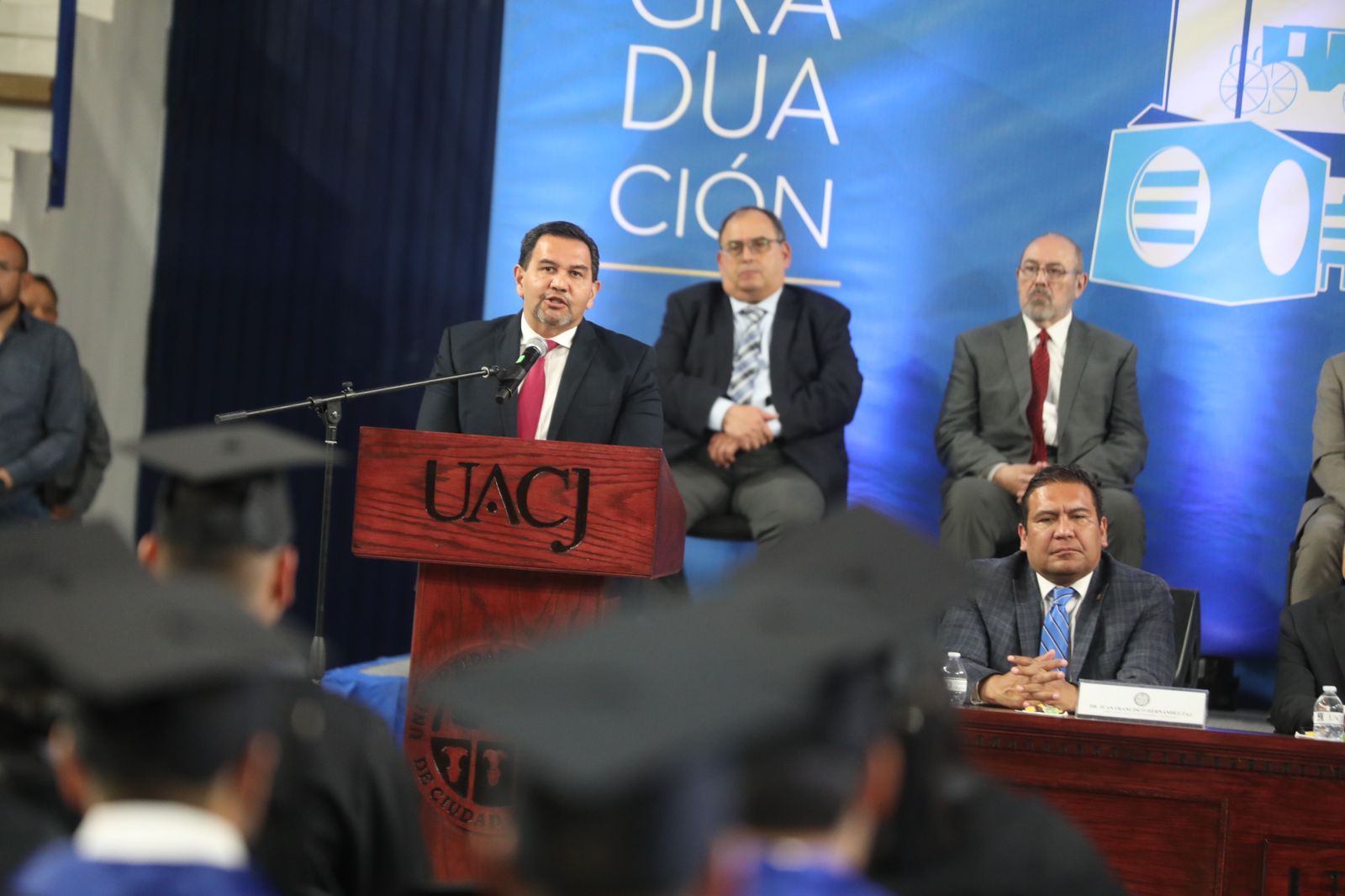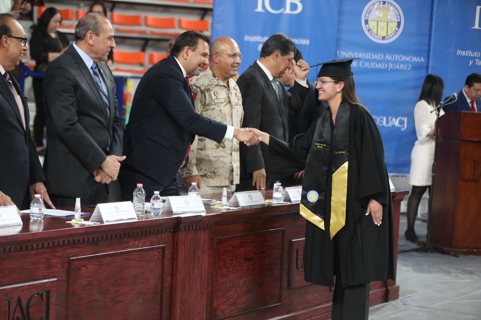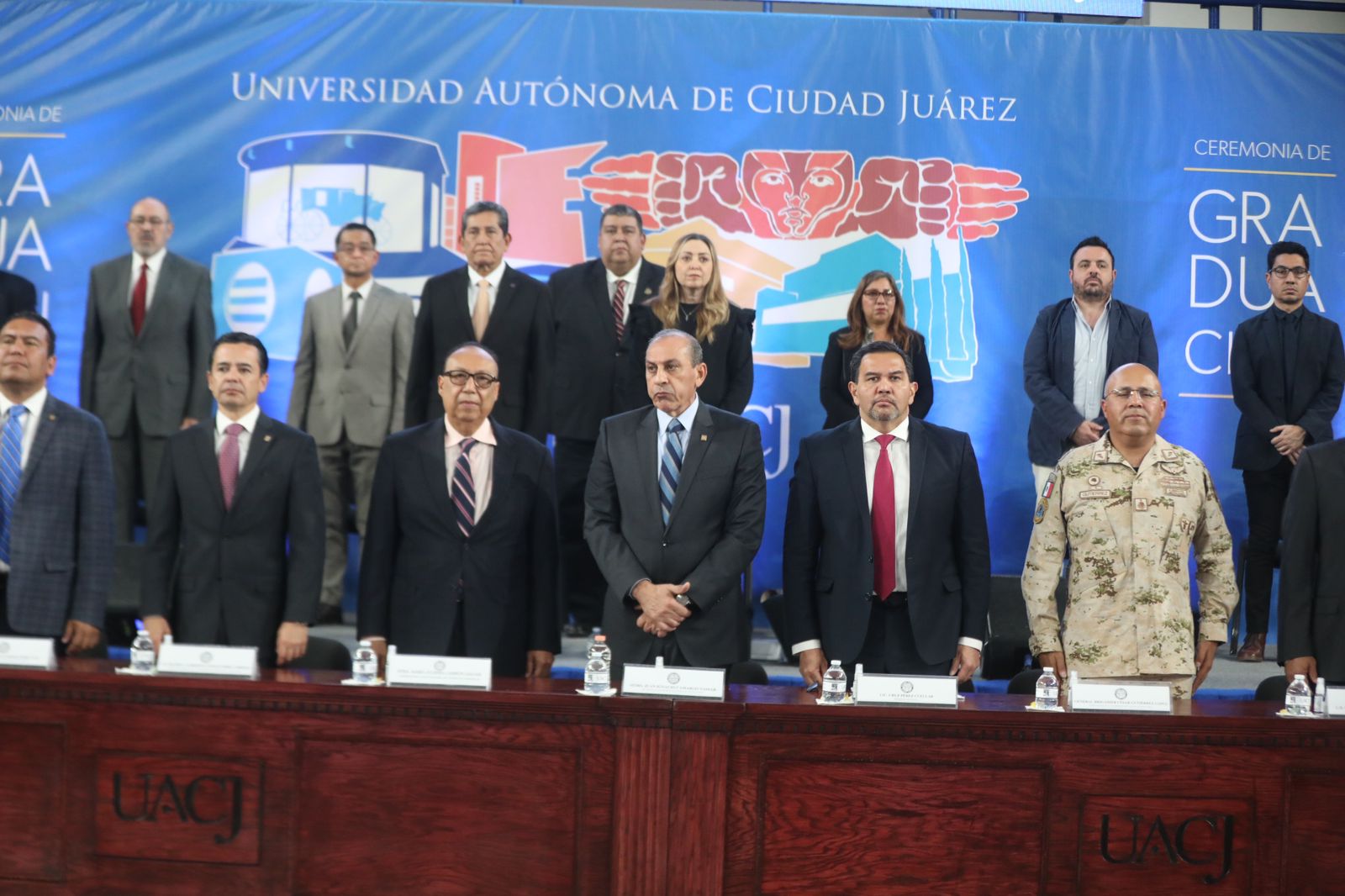 En la ceremonia de graduación estuvieron Juan Francisco Hernández Paz, director del Instituto de Ingeniería y Tecnología; Salvador David Nava Martínez, director del Instituto de Ciencias Biomédicas; Daniel Constandse Cortez, secretario general de la UACJ; el General Brigadier César Gutiérrez López, comandante de la Guarnición Militar de Ciudad Juárez y Felipe Rocha Ramírez, director de profesiones de la subsecretaría de Educación Zona Norte.