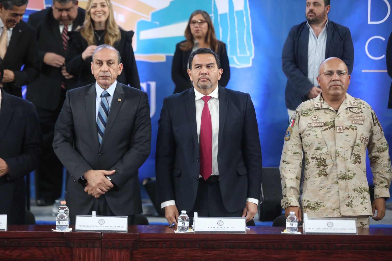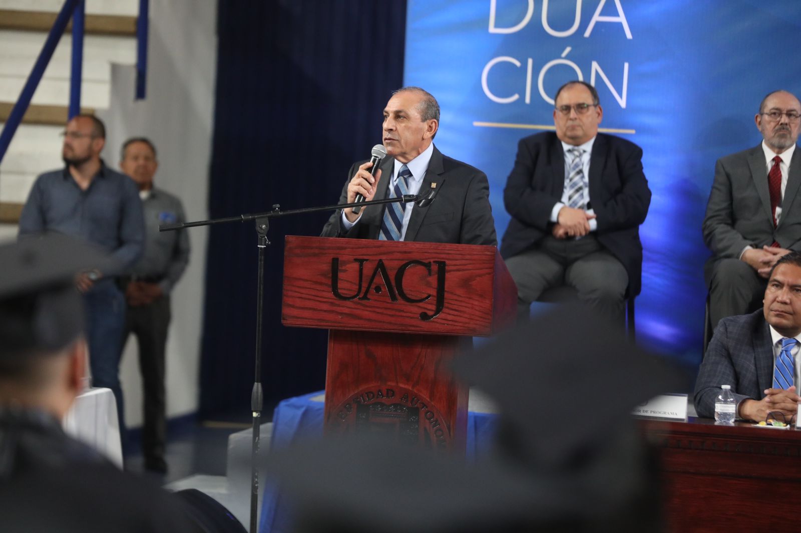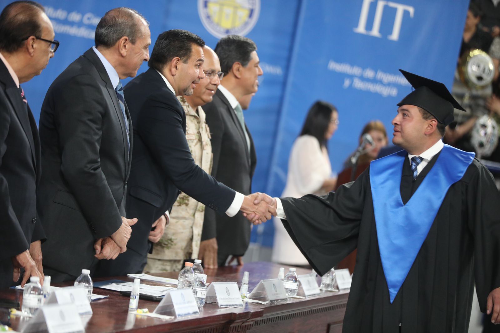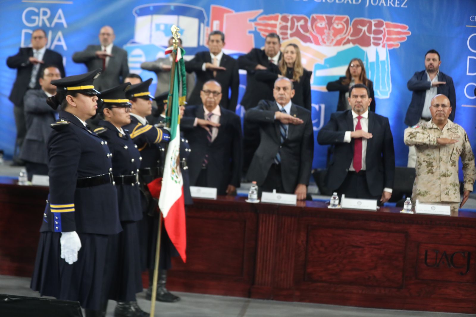 En la ceremonia de graduación estuvieron Juan Francisco Hernández Paz, director del Instituto de Ingeniería y Tecnología; Salvador David Nava Martínez, director del Instituto de Ciencias Biomédicas; Daniel Constandse Cortez, secretario general de la UACJ; el General Brigadier César Gutiérrez López, comandante de la Guarnición Militar de Ciudad Juárez y Felipe Rocha Ramírez, director de profesiones de la subsecretaría de Educación Zona Norte.