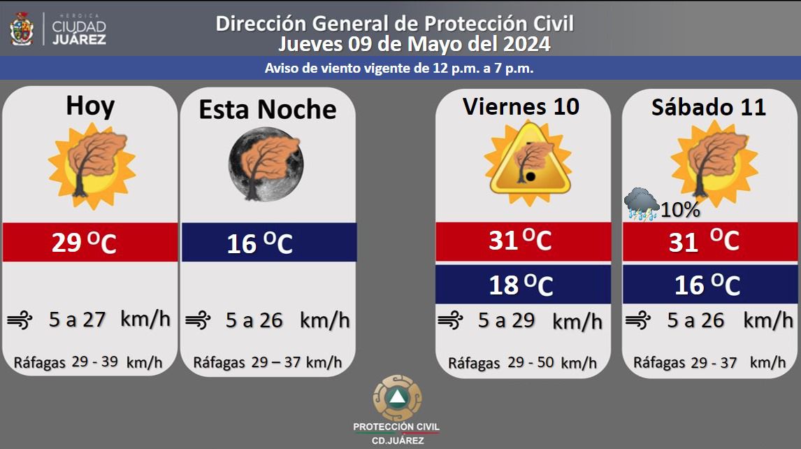 Para mañana viernes se prevé un aumento en la temperatura así como en la velocidad del viento, pues la máxima estará en 31 grados centígrados y el viento en 5 a 29 kilómetros por hora con ráfagas de hasta 50 kilómetros.