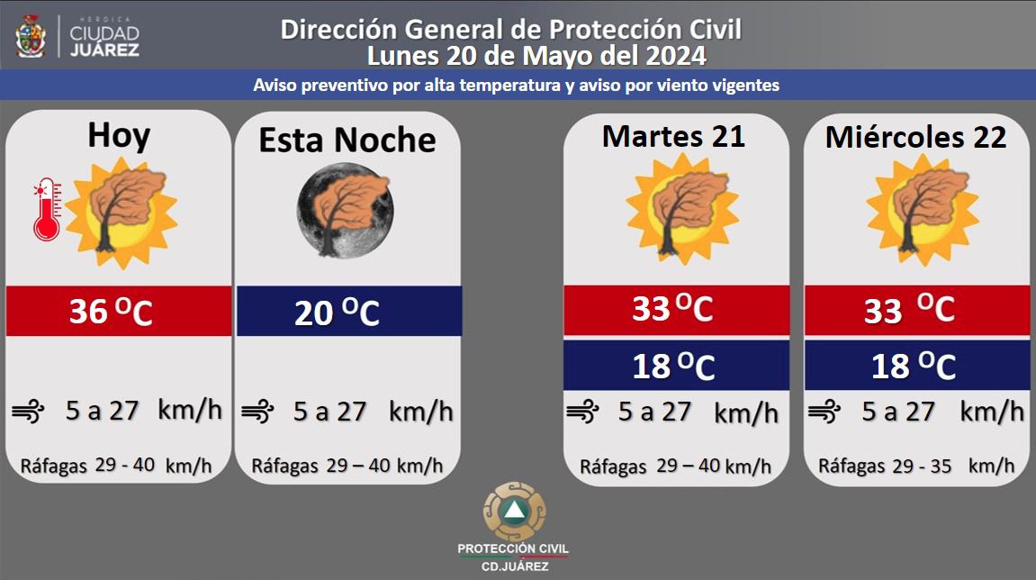 El calor continúa en aumento en Ciudad Juárez, este día el pronóstico está contemplado en una máxima de 36 grados Centígrados, mientras que por la noche, la mínima será de 20 grados, dio a conocer la Dirección General de Protección Civil.