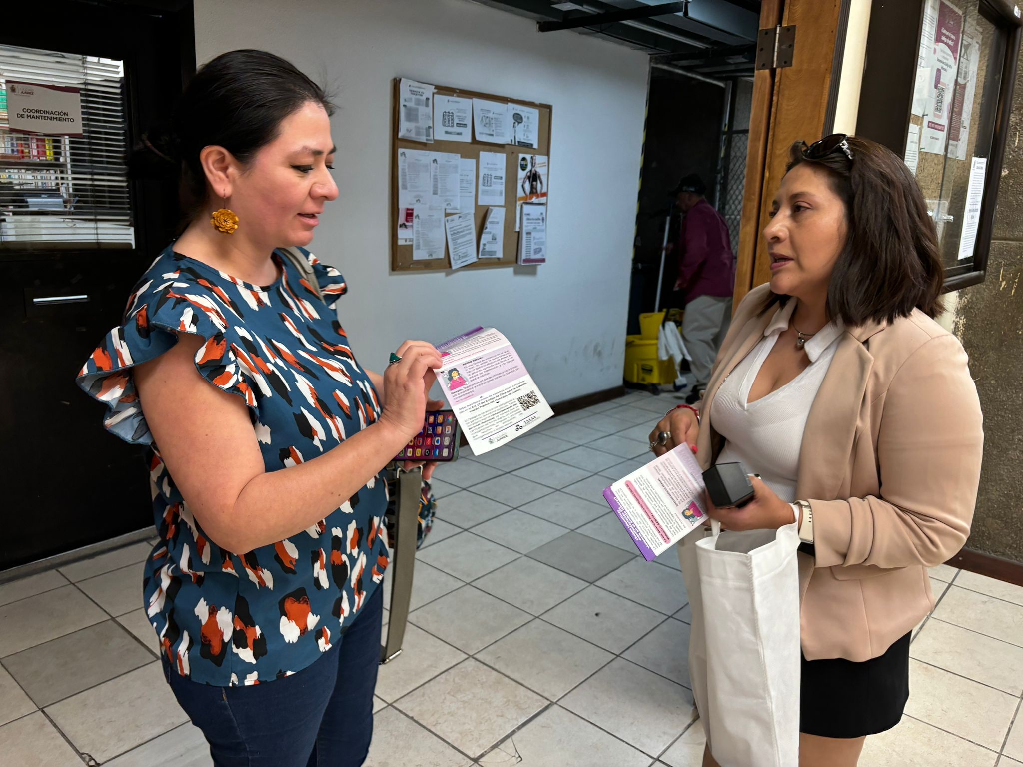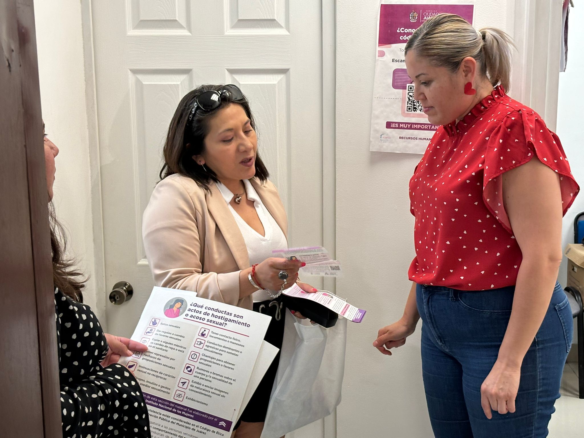 Con el objetivo de que empleadas de gobierno conozcan si son víctimas de violencia en el ámbito laboral, el Instituto Municipal de las Mujeres (IMM) acudió hoy a la presidencia municipal para distribuir folletos informativos.