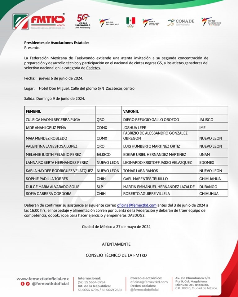 Los atletas con ranking cinta negra G5 deberán acudir al campamento que se realizará en la ciudad de Zacatecas del 6 al 9 de junio.