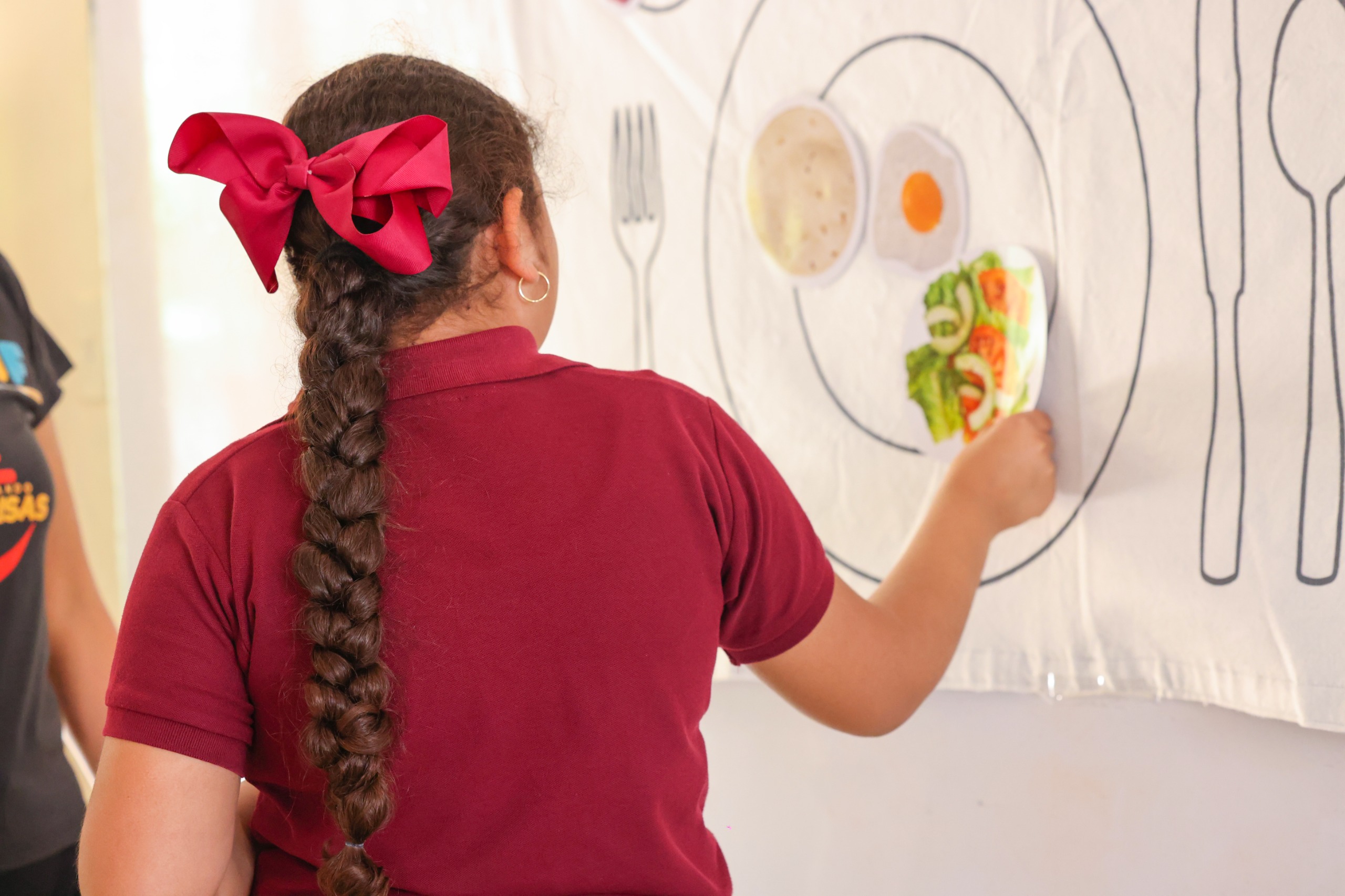 Las alumnas y alumnos conocieron el plato del buen comer y la forma adecuada en que deben alimentarse mediante el juego interactivo “Semáforo de la alimentación”, en el que armaron desayunos, comidas y cenas.