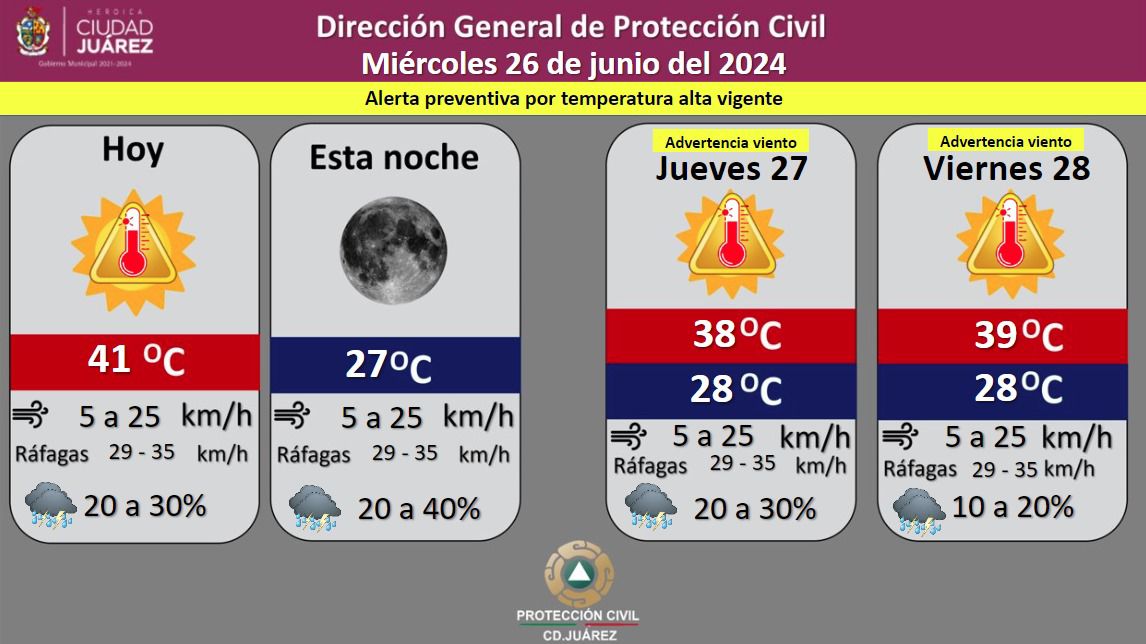 La Dirección General de Protección Civil, con base en informes del Servicio Meteorológico Nacional, pronostica un 40 por ciento de probabilidad de lluvia para la tarde de este miércoles, con una temperatura máxima de 41 grados Celsius, mientras que la mínima será de 27 °C para esta noche.