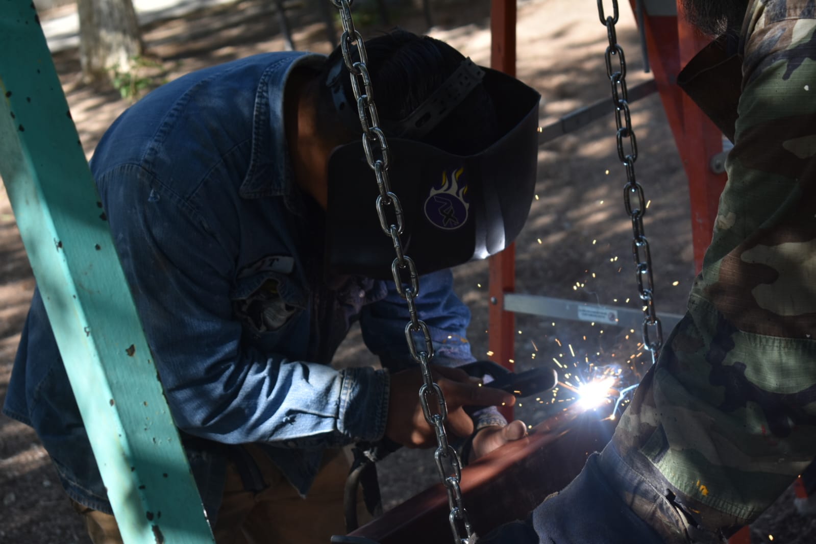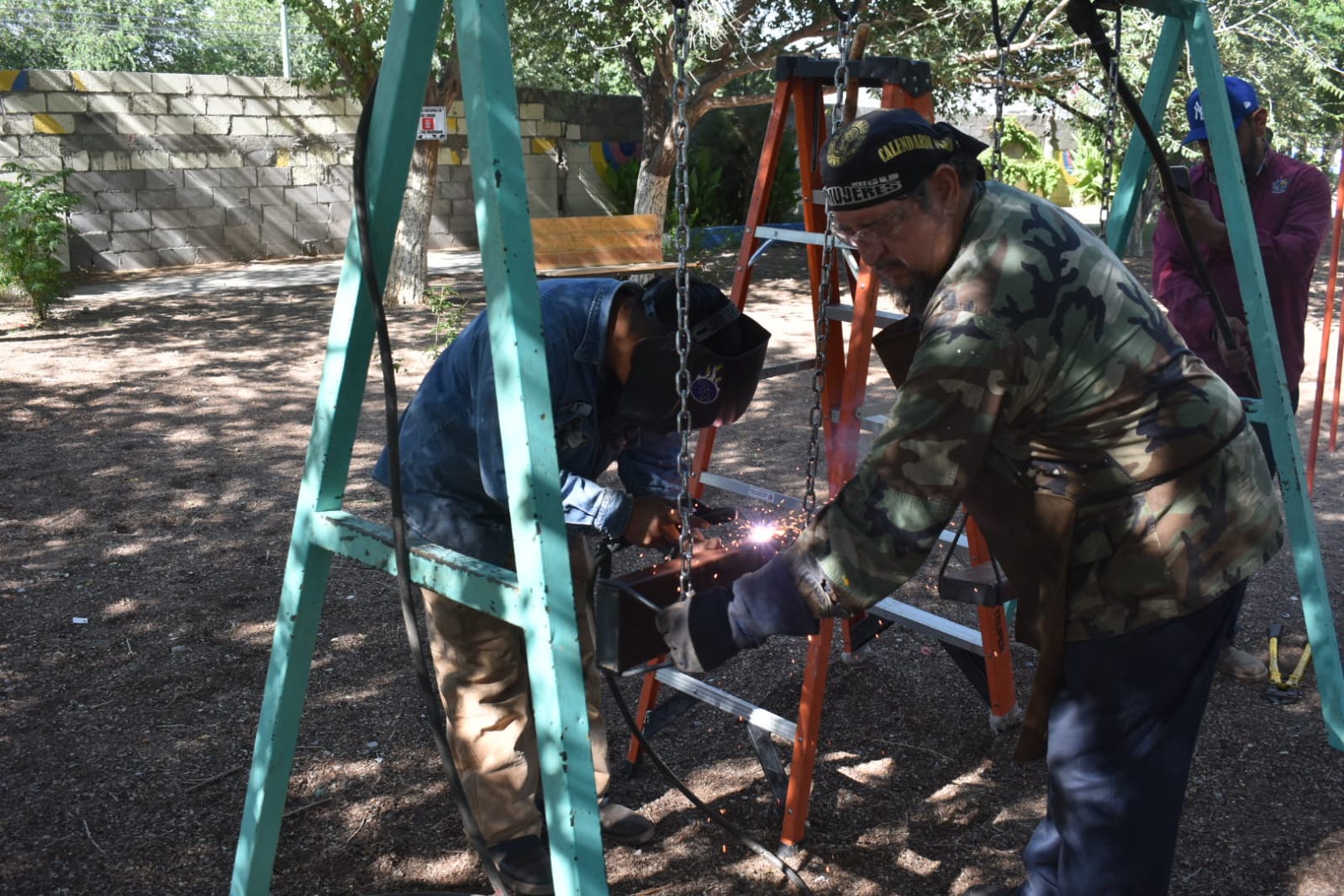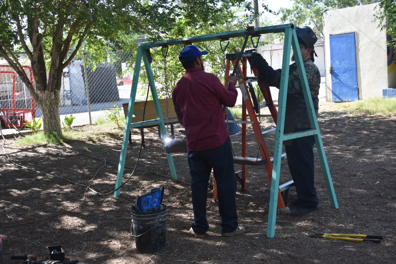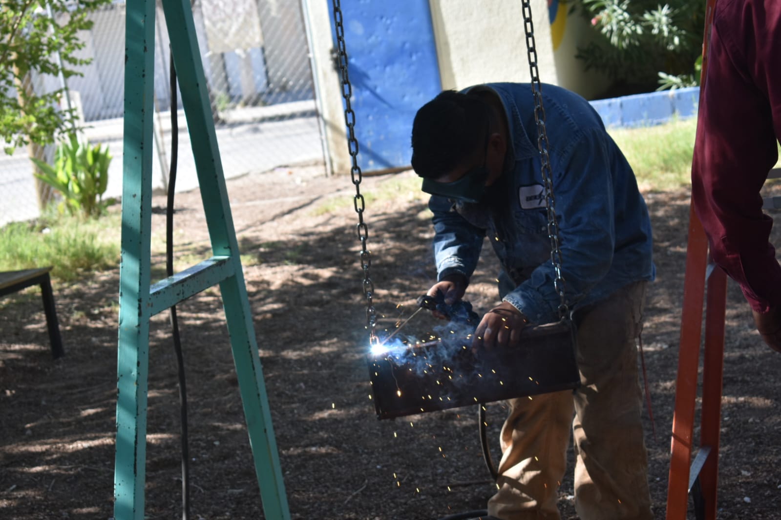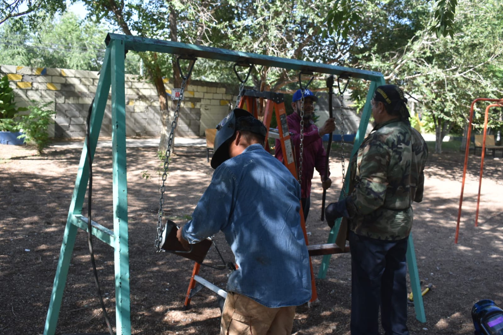 Personal de la Dirección de Parques y Jardines acudió al fraccionamiento Haciendas Universidad a fin de atender la infraestructura y rehabilitación de los juegos en una de las áreas verdes del sector.