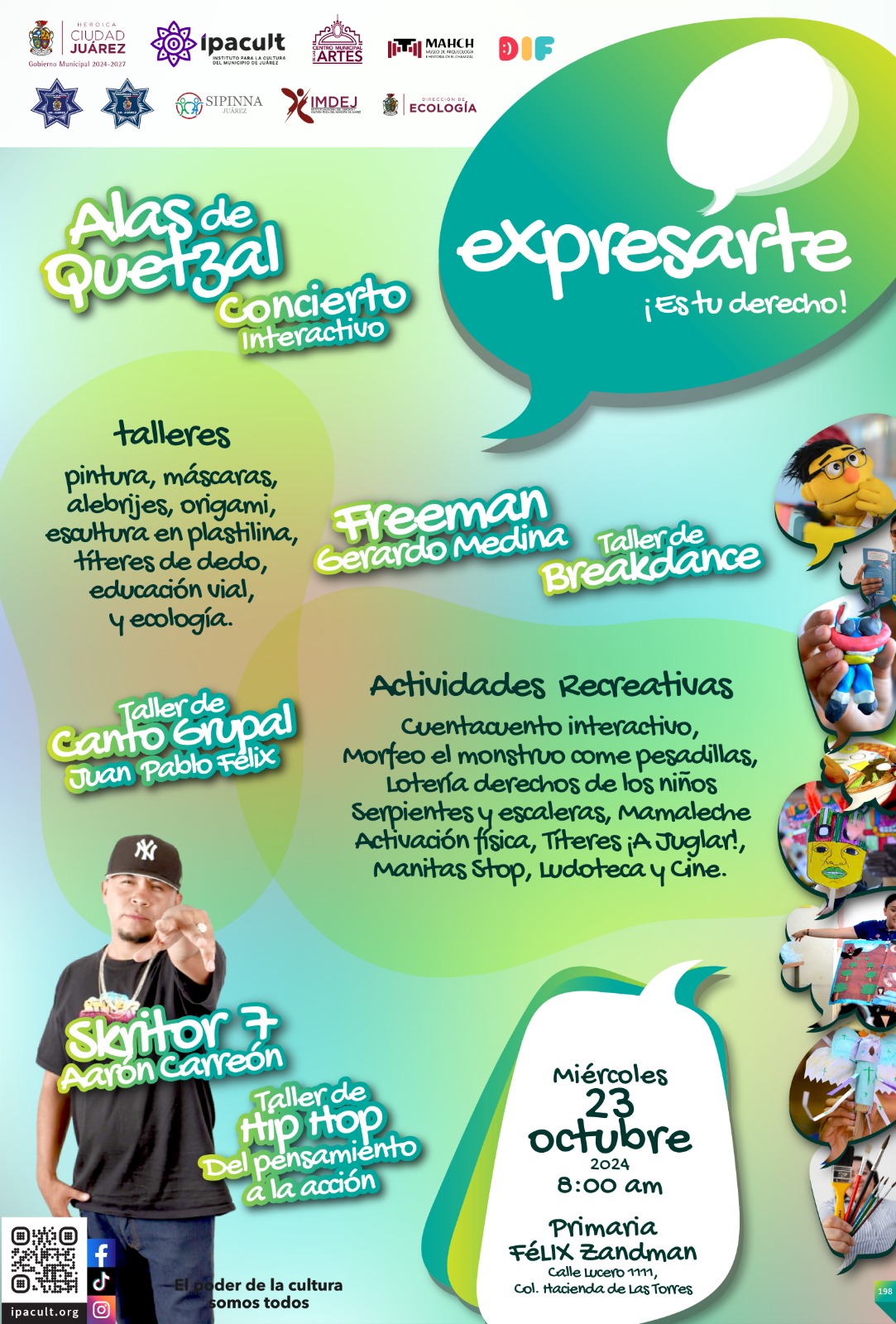 Con el objetivo de fomentar la creatividad y difundir los derechos de la niñez, el Instituto para la Cultura del Municipio de Juárez (IPACULT) llevará a cabo este miércoles su programa “ExpresArte es tu derecho” en la Escuela Primaria Félix Zandman.