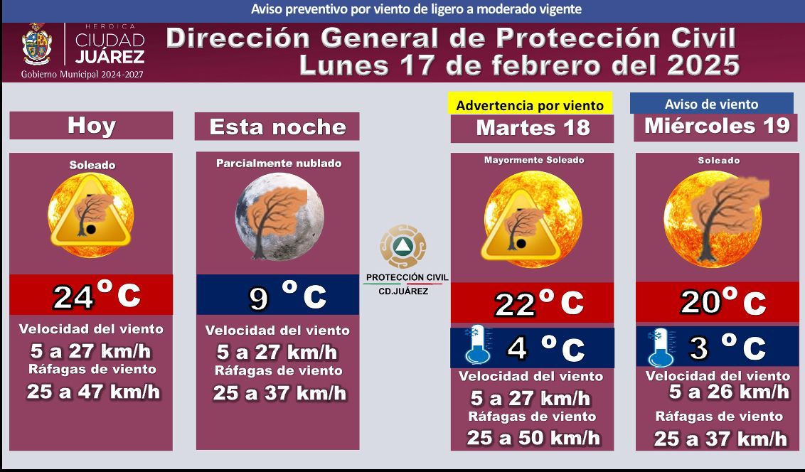 La Dirección General de Protección Civil de Ciudad Juárez informa sobre las condiciones climáticas para los próximos días y mantiene un aviso preventivo por viento de ligero a moderado, así como una advertencia por viento para el martes 18 de febrero.