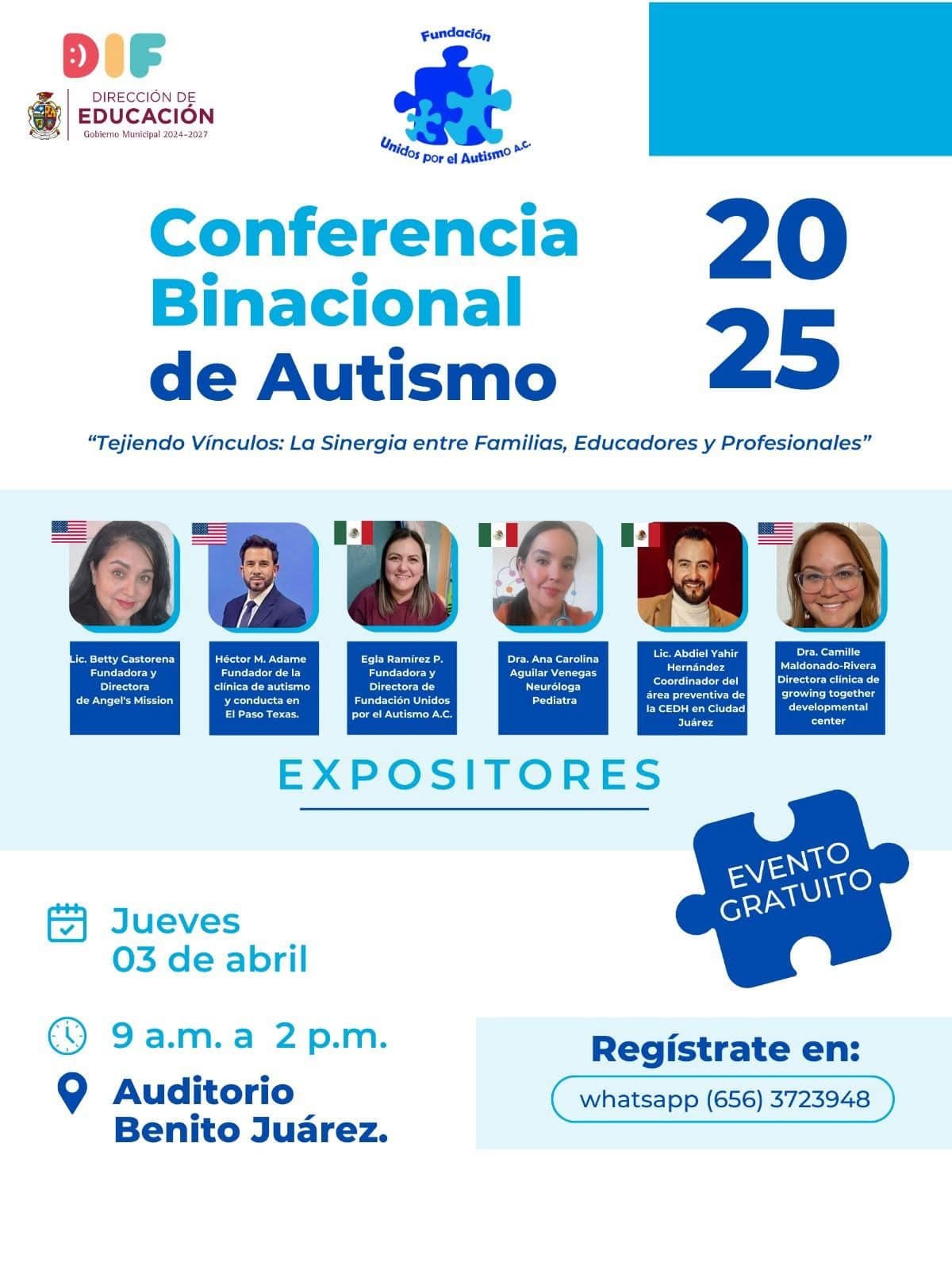 La Dirección de Educación Municipal abrió el registro a la población que desee acudir a la conferencia binacional de autismo 2025 “Tejiendo vínculos: la sinergia entre familias, educadores y profesionales”.
