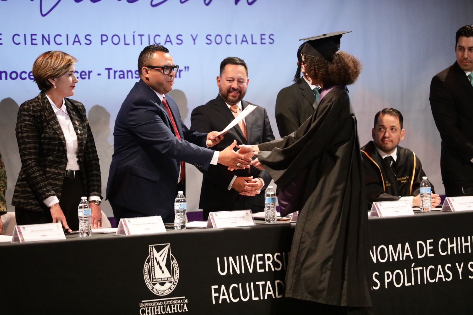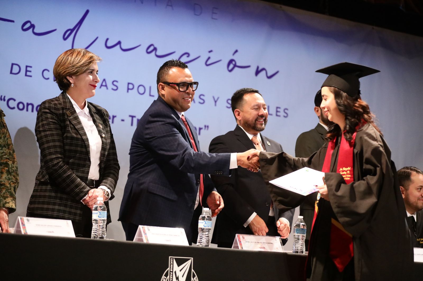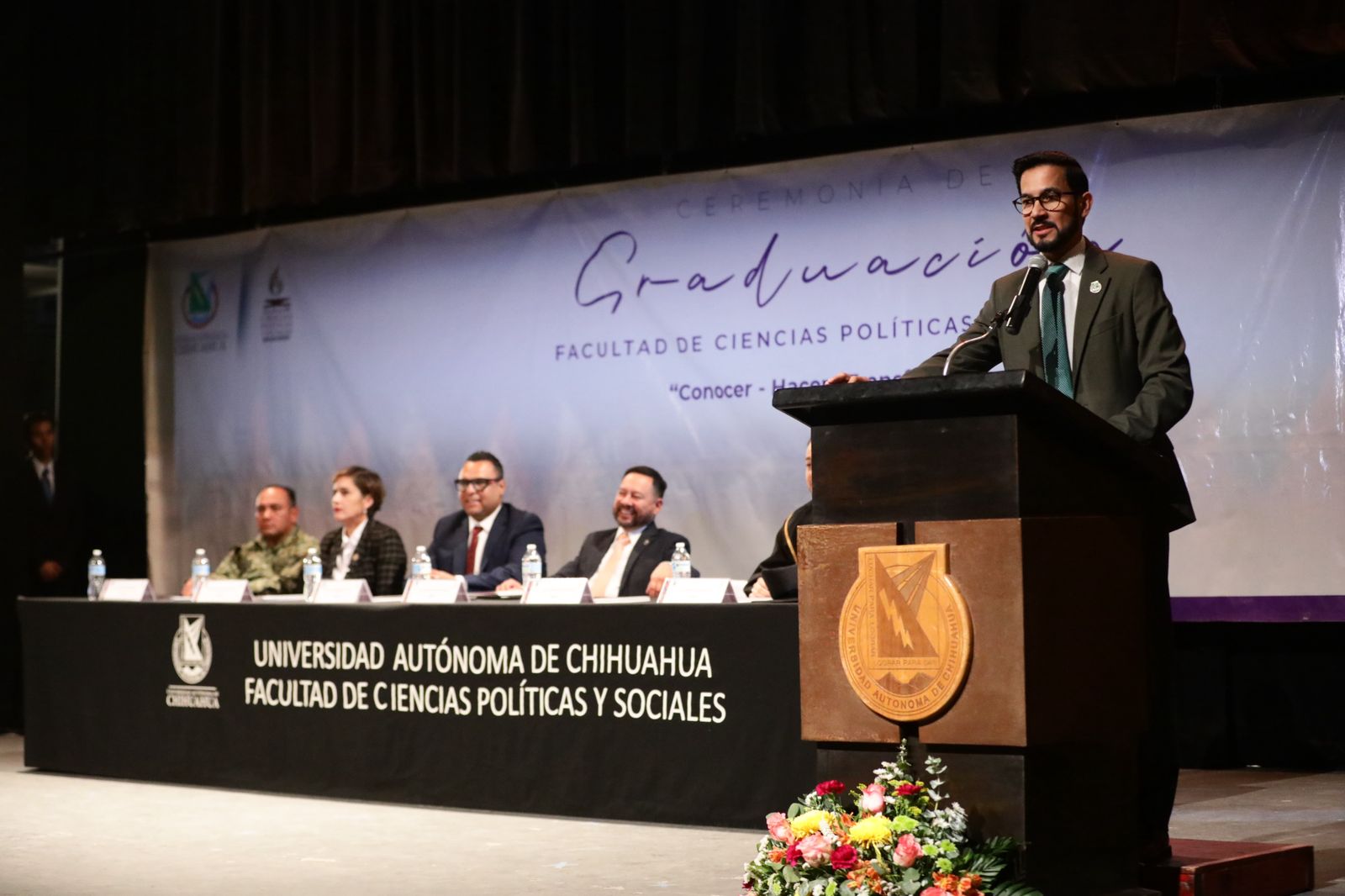 El director de Educación Municipal, Guillermo Enrique Alvídrez, acudió en representación del Presidente Municipal, Héctor Rafael Ortiz Orpinel, a la ceremonia de graduación de la Facultad de Ciencias Políticas y Sociales de la Universidad Autónoma de Chihuahua (UACH), Campus Juárez.