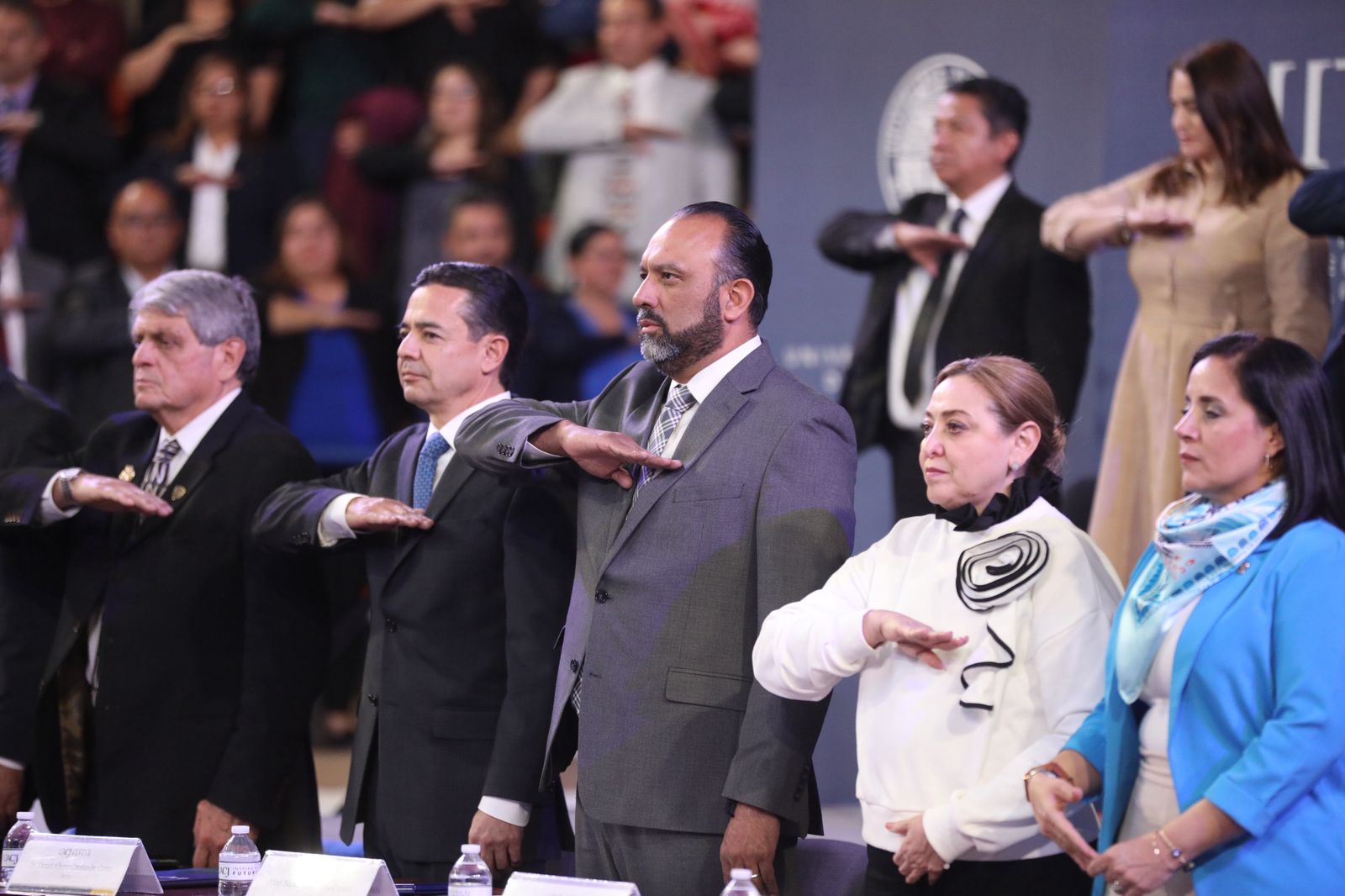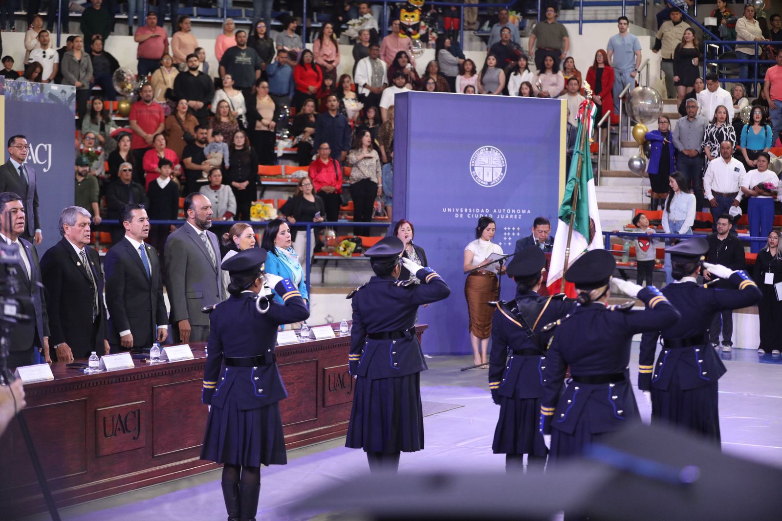 En el evento se realizaron honores a la bandera, además interpretaron el Himno Nacional, a cargo de la maestra Jessica Peña, así como el Himno del Estado de Chihuahua y el Himno Universitario.