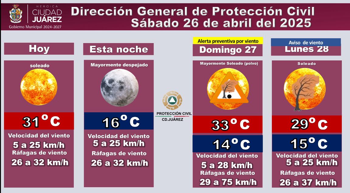 La Dirección General de Protección Civil de Ciudad Juárez emitió el pronóstico del clima correspondiente a este sábado 26 de abril.