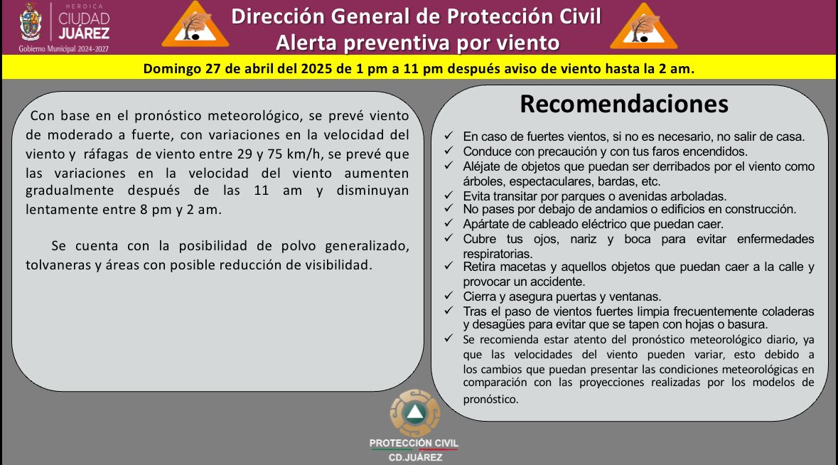 La Dirección de Protección Civil del Municipio, emitió una alerta preventiva por viento para mañana domingo.