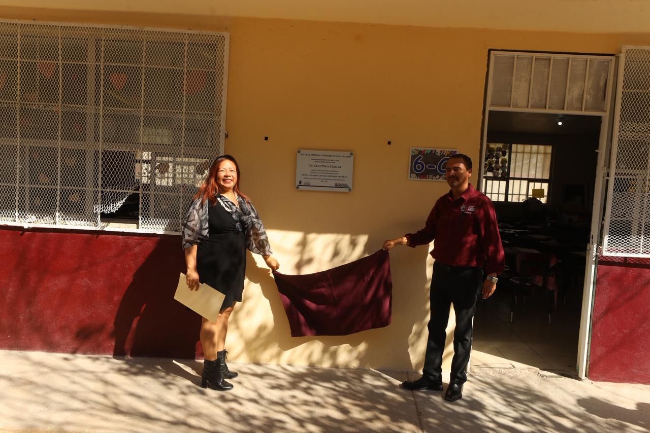 El Presidente Municipal, Cruz Pérez Cuéllar, entregó este día a los estudiantes de la Escuela Primaria Federal Leona Vicario, las obras de rehabilitación que se llevaron a cabo en el plantel.