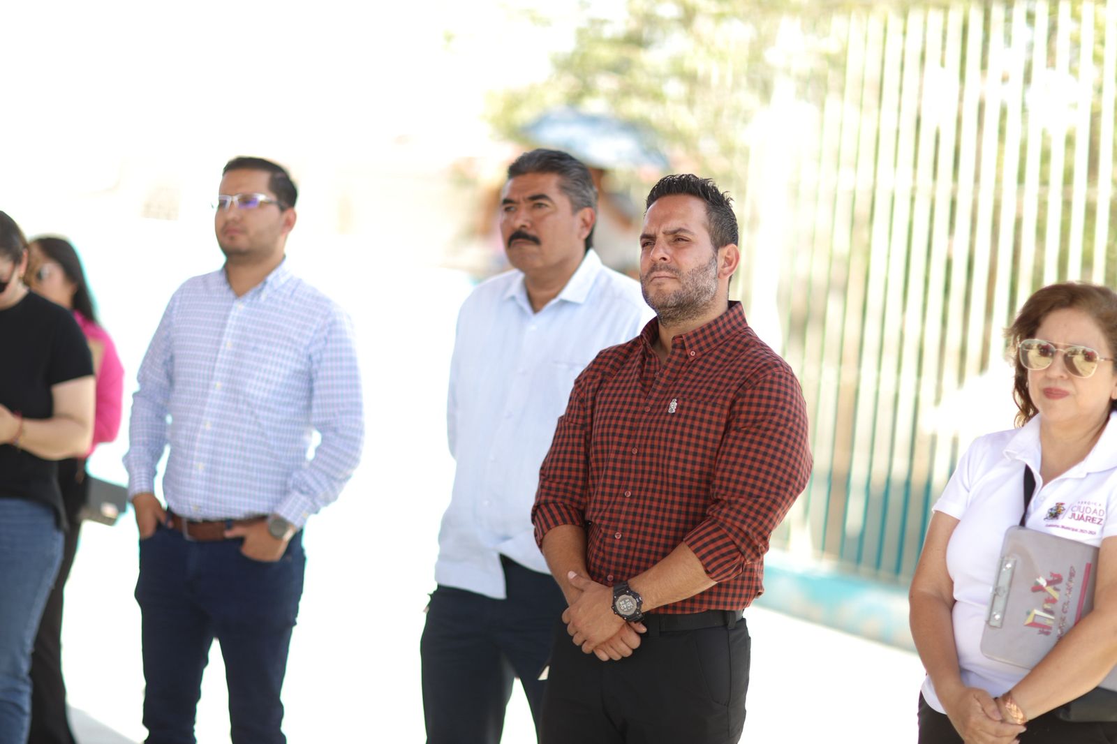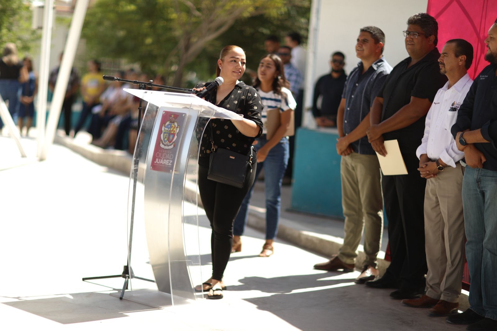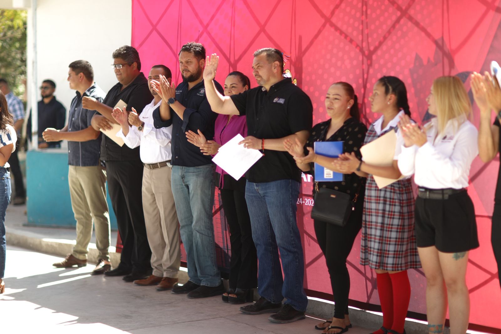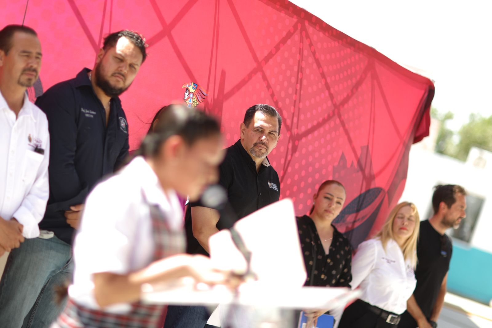 En la ceremonia de entrega estuvieron la estudiante Alison Román Enríquez; el director del turno matutino, Jesús José Quintana; el director del turno vespertino, José Antonio Paredes; el coordinador de Infraestructura Educativa del Municipio, Ismael Rueda; el director general de Obras Públicas, Daniel González García; el regidor Jorge Marcial Bueno Quiroz y la Sindica Municipal, Ana Carmen Estrada García.