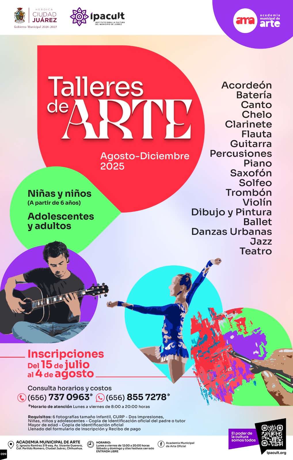 El Instituto para la Cultura del Municipio de Juárez (IPACULT) invita a la ciudadanía a inscribirse en los talleres culturales y artísticos que se impartirán en la Academia Municipal de Arte (AMA) durante el semestre agosto-diciembre.