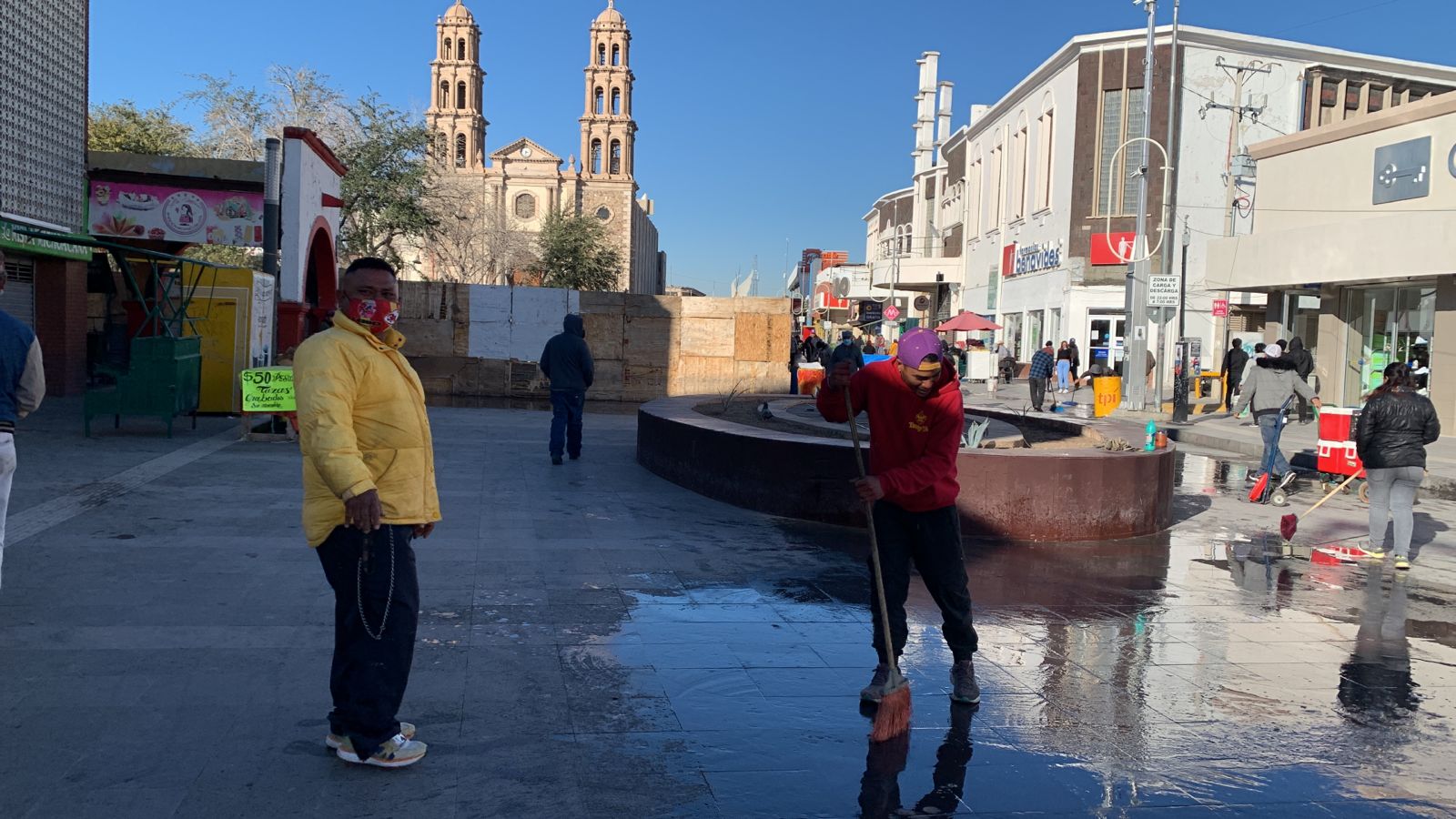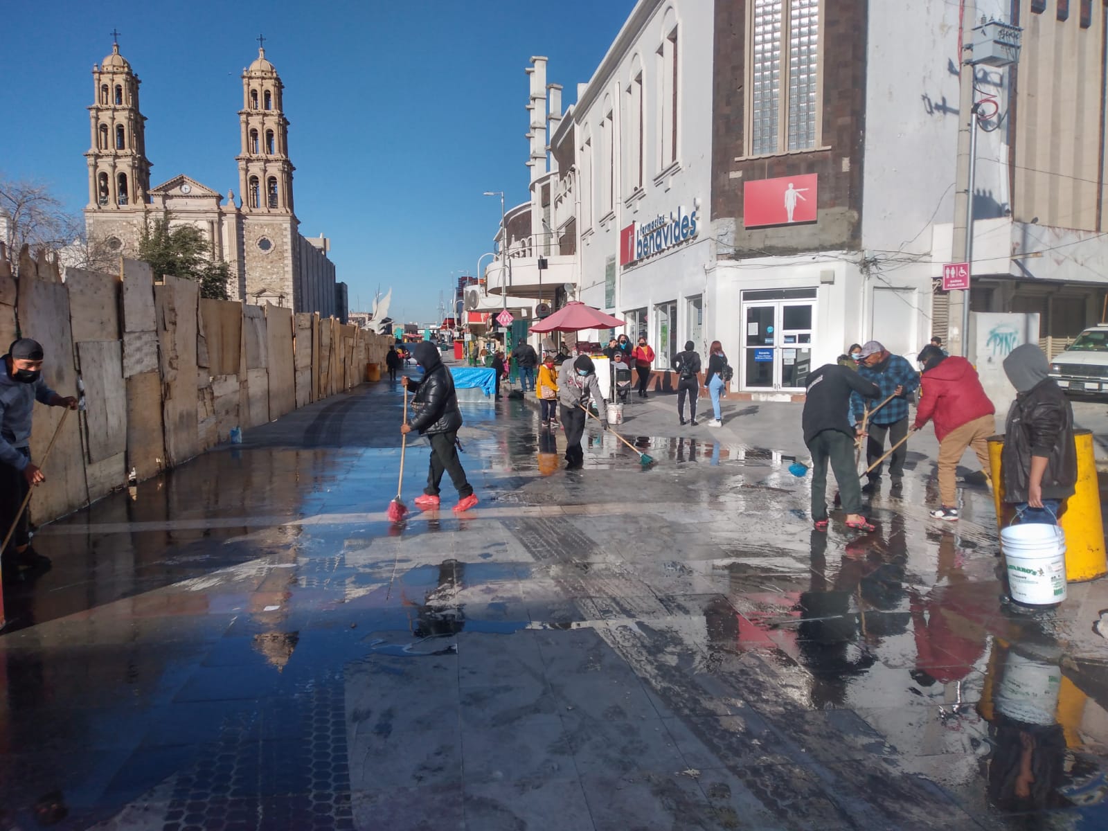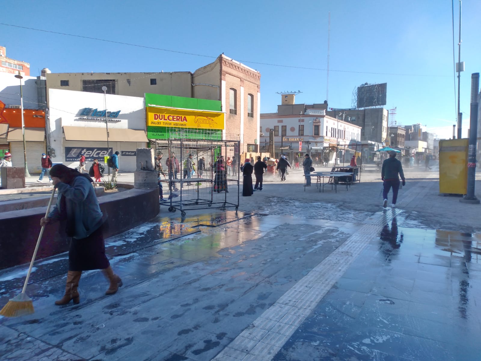 Con agua, jabón y escobas, los comerciantes semifijos se dieron a la tarea de limpiar la avenida antes de ofrecer sus productos a la ciudadanía.