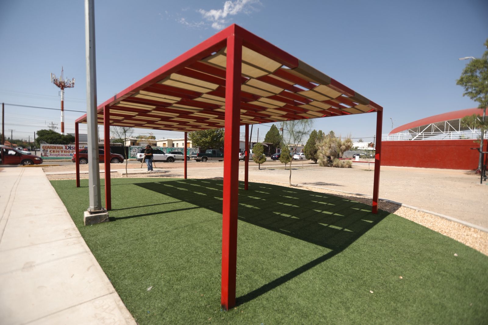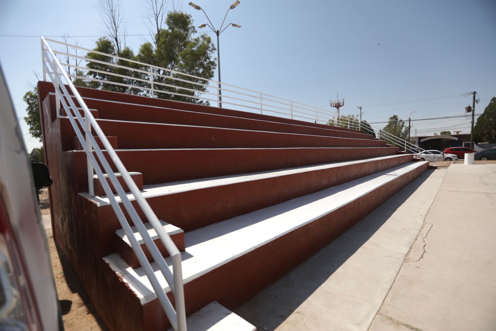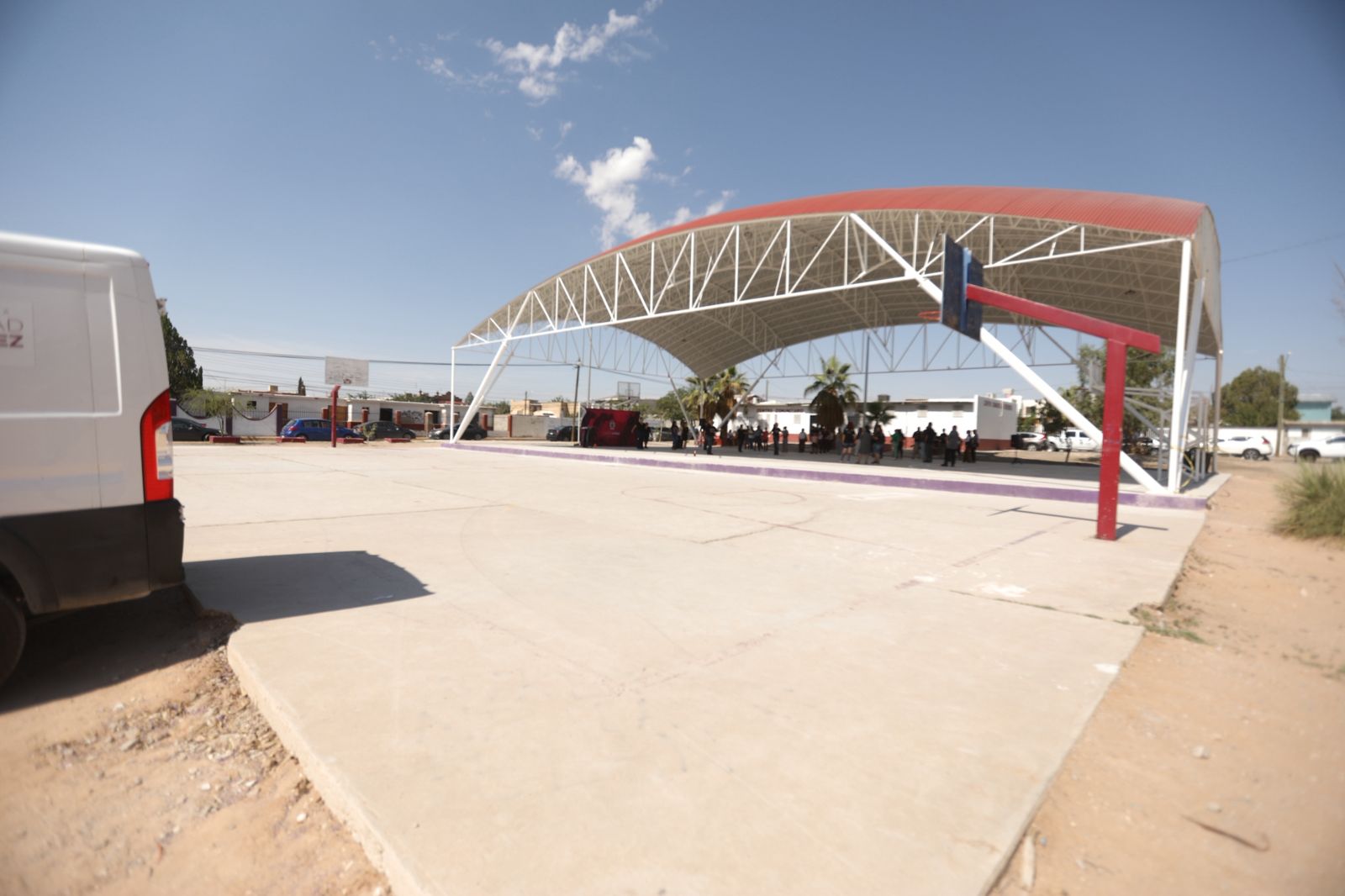 El proyecto incluyó la construcción de un domo de 20 por 30 metros con estructura metálica y sistema de iluminación, la rehabilitación de canchas con colocación de aros y tableros, la edificación de gradas con pintura y barandales, instalación de andadores, colocación de pasto sintético y áreas con grava, así como la habilitación de dos zonas de pérgolas, módulo de juegos infantiles, bancas, áreas verdes y andador de arcilla.