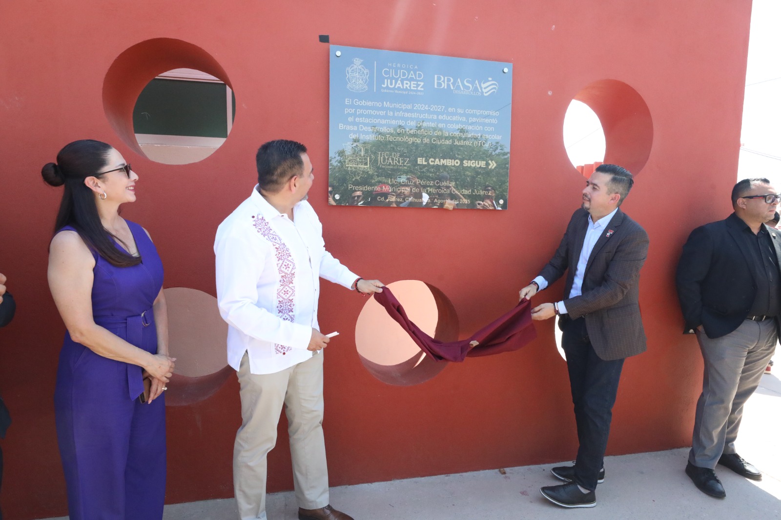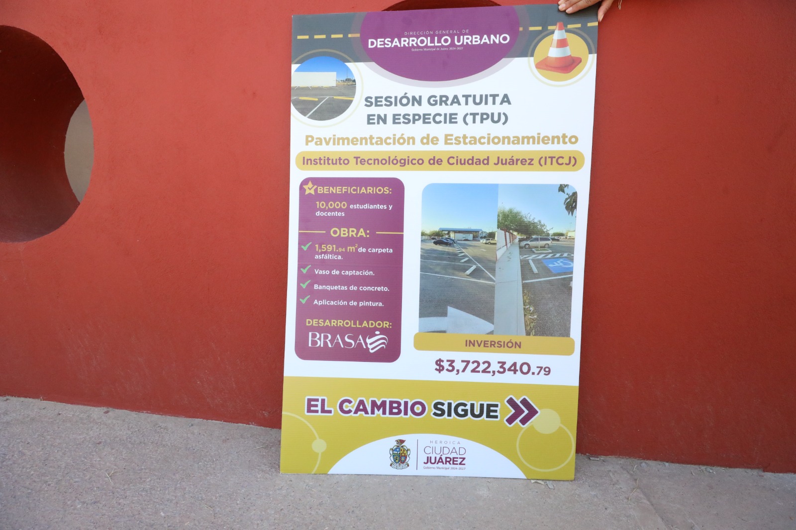 El Presidente Municipal, Cruz Pérez Cuéllar, encabezó este día la ceremonia en la que se inauguró la pavimentación del estacionamiento del Tecnológico Nacional de México, campus Instituto Tecnológico de Ciudad Juárez 8TecNM-ITCJ), obra que antes era de terracería y ahora cuenta con carpeta asfáltica, banquetas de concreto, señalización y pintura.