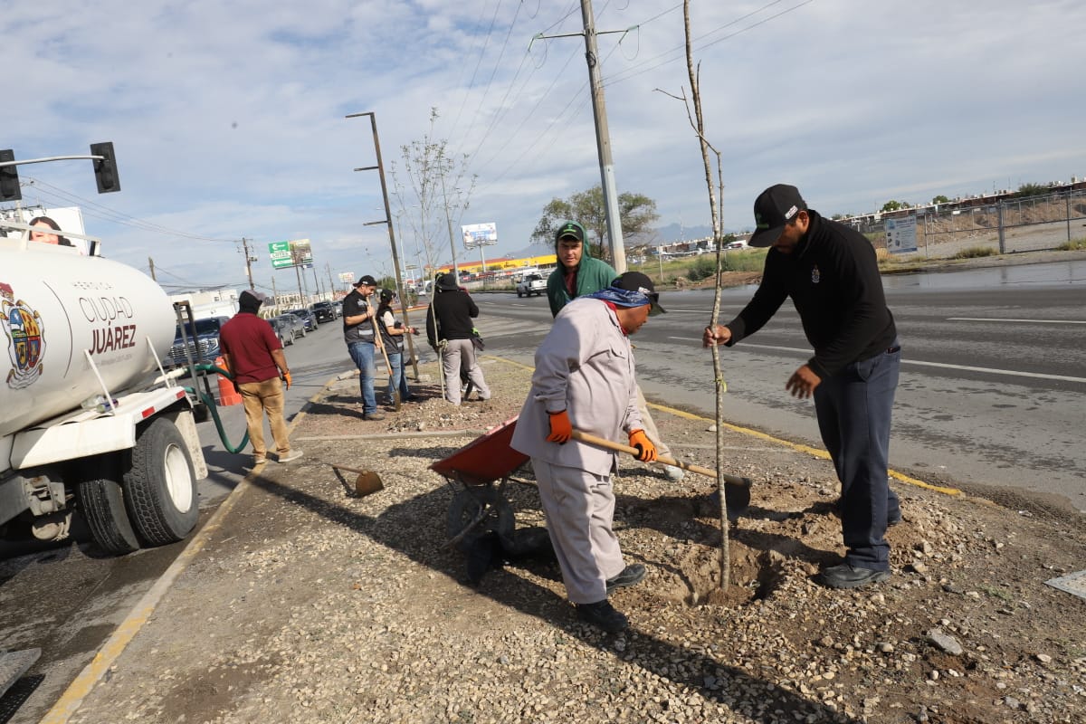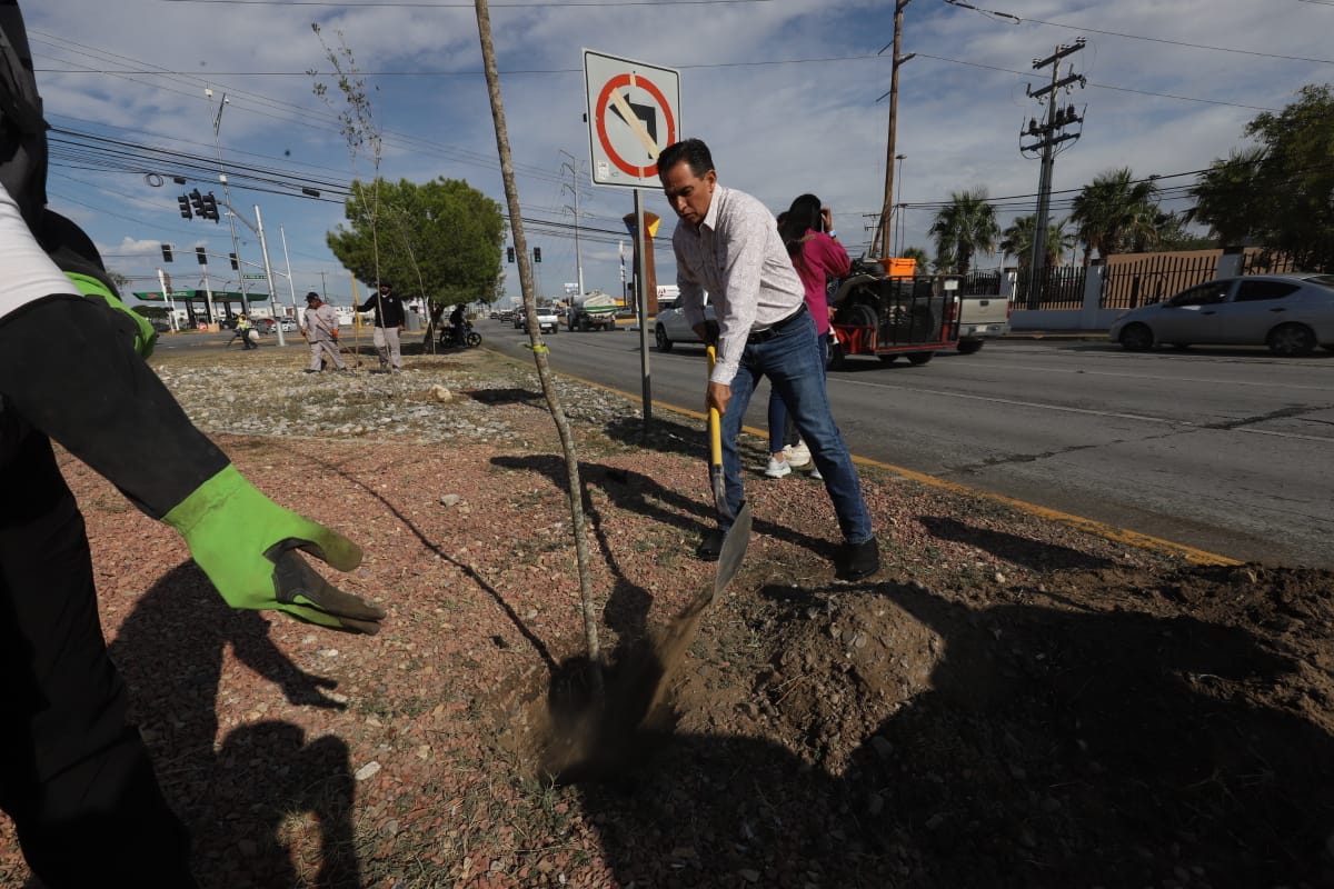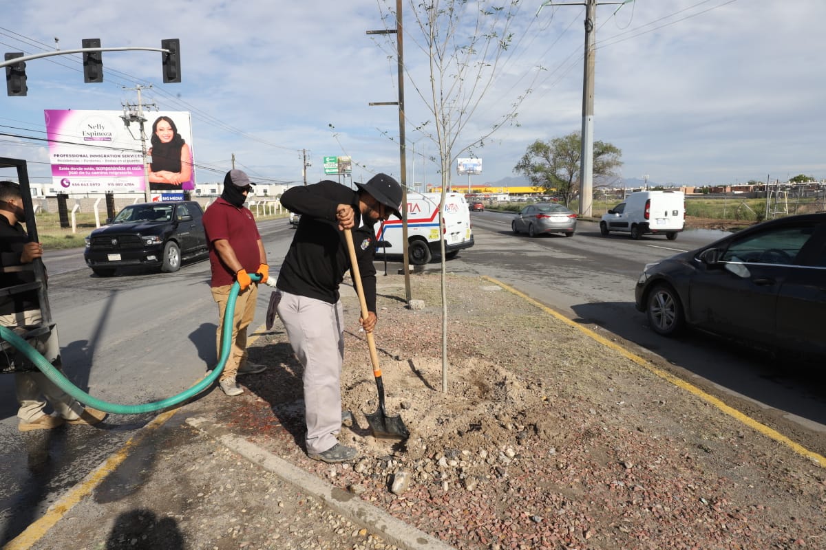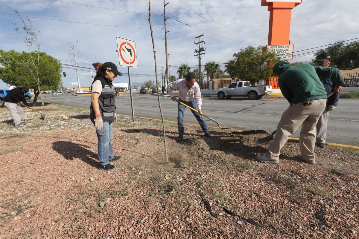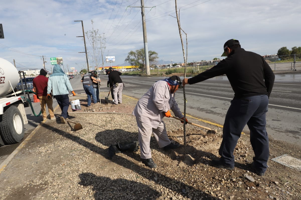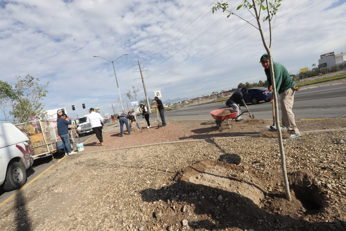 La Dirección de Parques y Jardines llevó a cabo la plantación de 45 árboles más en el camellón de la avenida Ejército Nacional, en el tramo comprendido entre Rancho Mesteñas y Paseo de la Victoria, con la finalidad de fortalecer las áreas verdes y embellecer la imagen urbana, con estas acciones suman ya 345 árboles plantados en dicho sector de la ciudad.