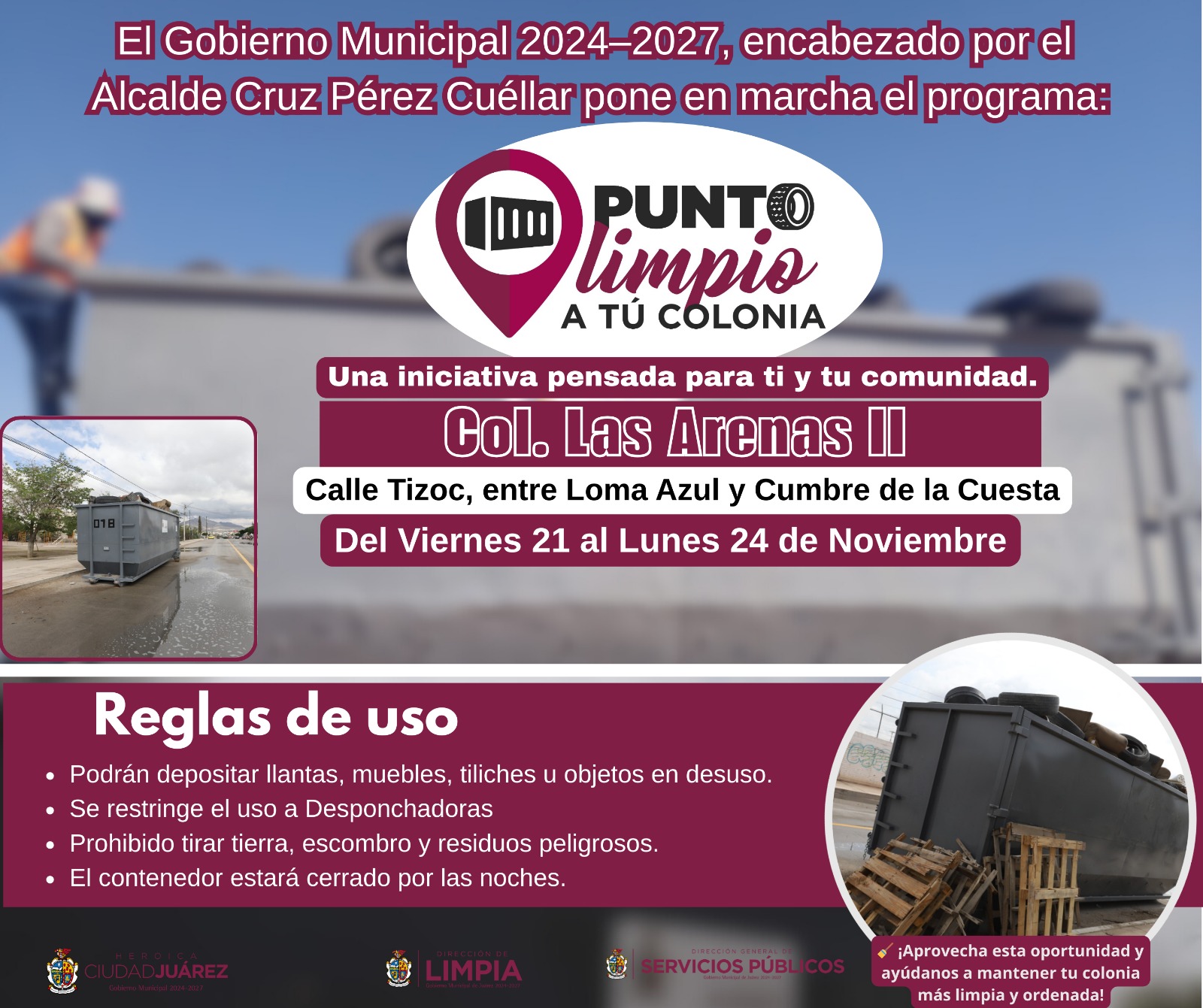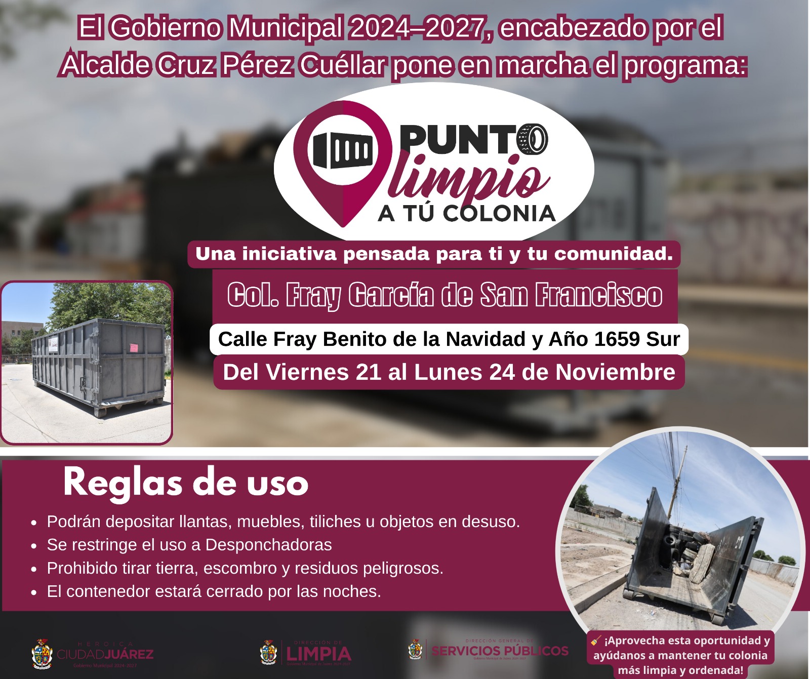 Gibran Solís Kanahan, director de Limpia, dijo que el objetivo de estas acciones es acercar más alternativas a los juarenses para el manejo responsable de la basura, pues al instalar los Puntos se ofrece a la ciudadanía lugares seguros y accesibles para el depósito de los residuos.