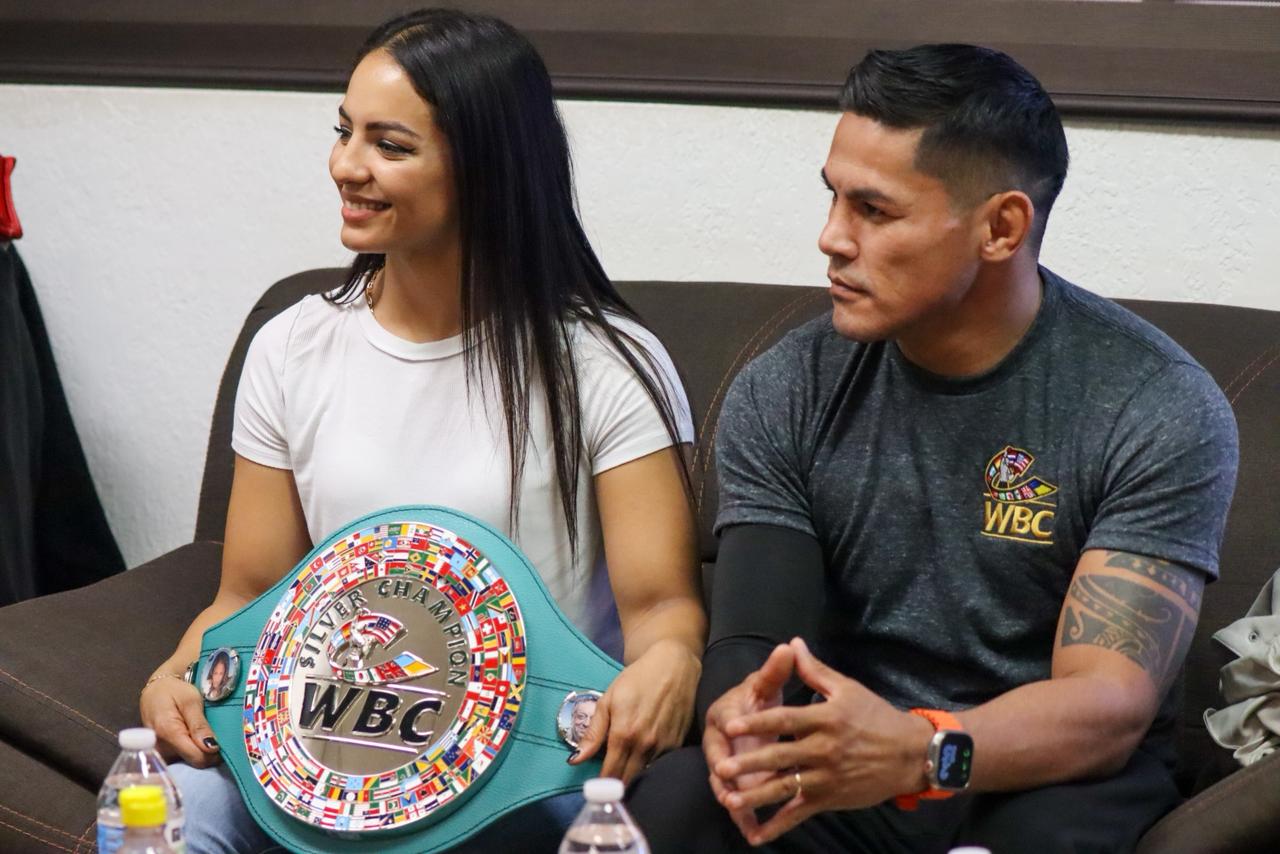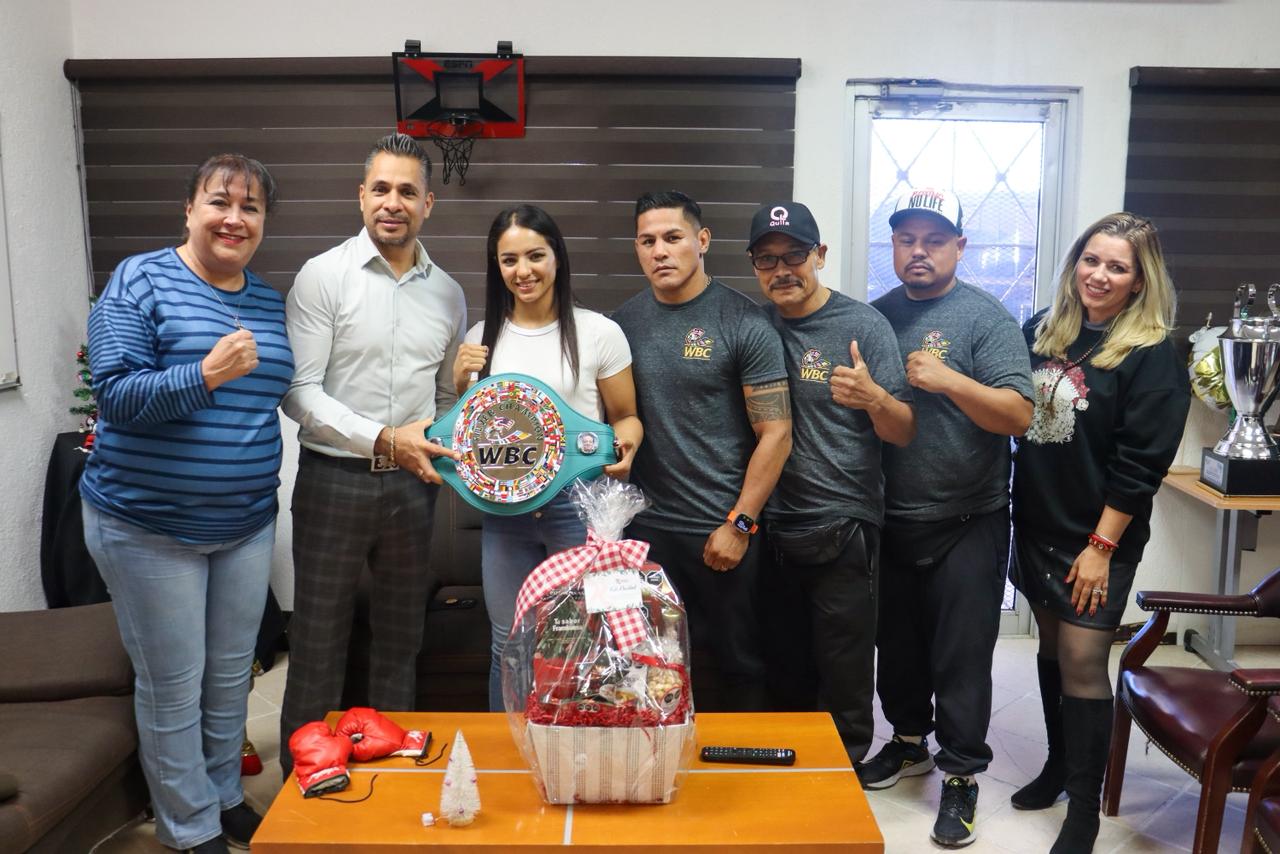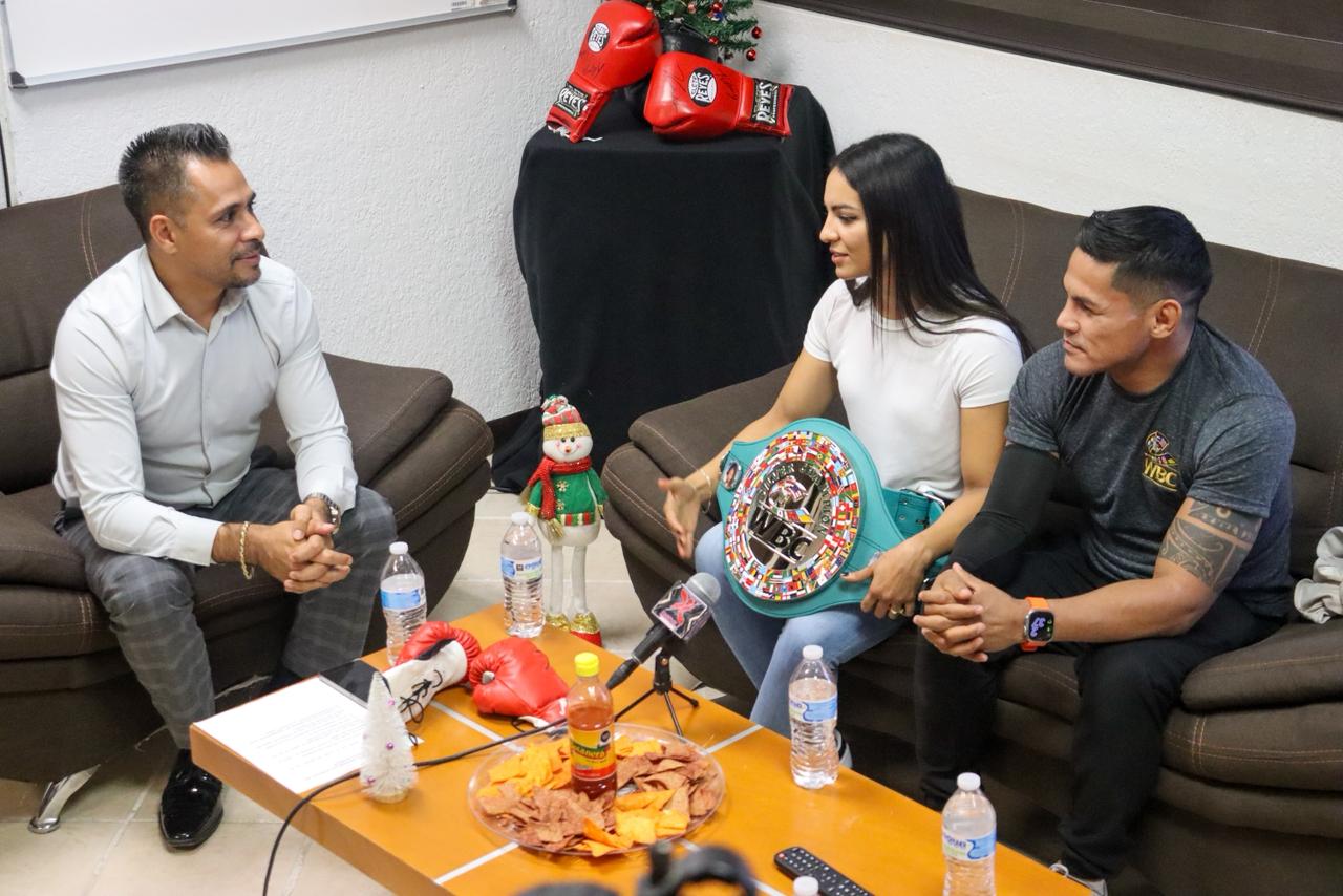 El director del IMDEJ, Juan Escalante, platicó con la nueva monarca del boxeo femenil del Consejo Mundial de Boxeo (CMB), quien llegó acompañada de su esposo, el pugilista Miguel "Micky" Román y su equipo de trabajo.