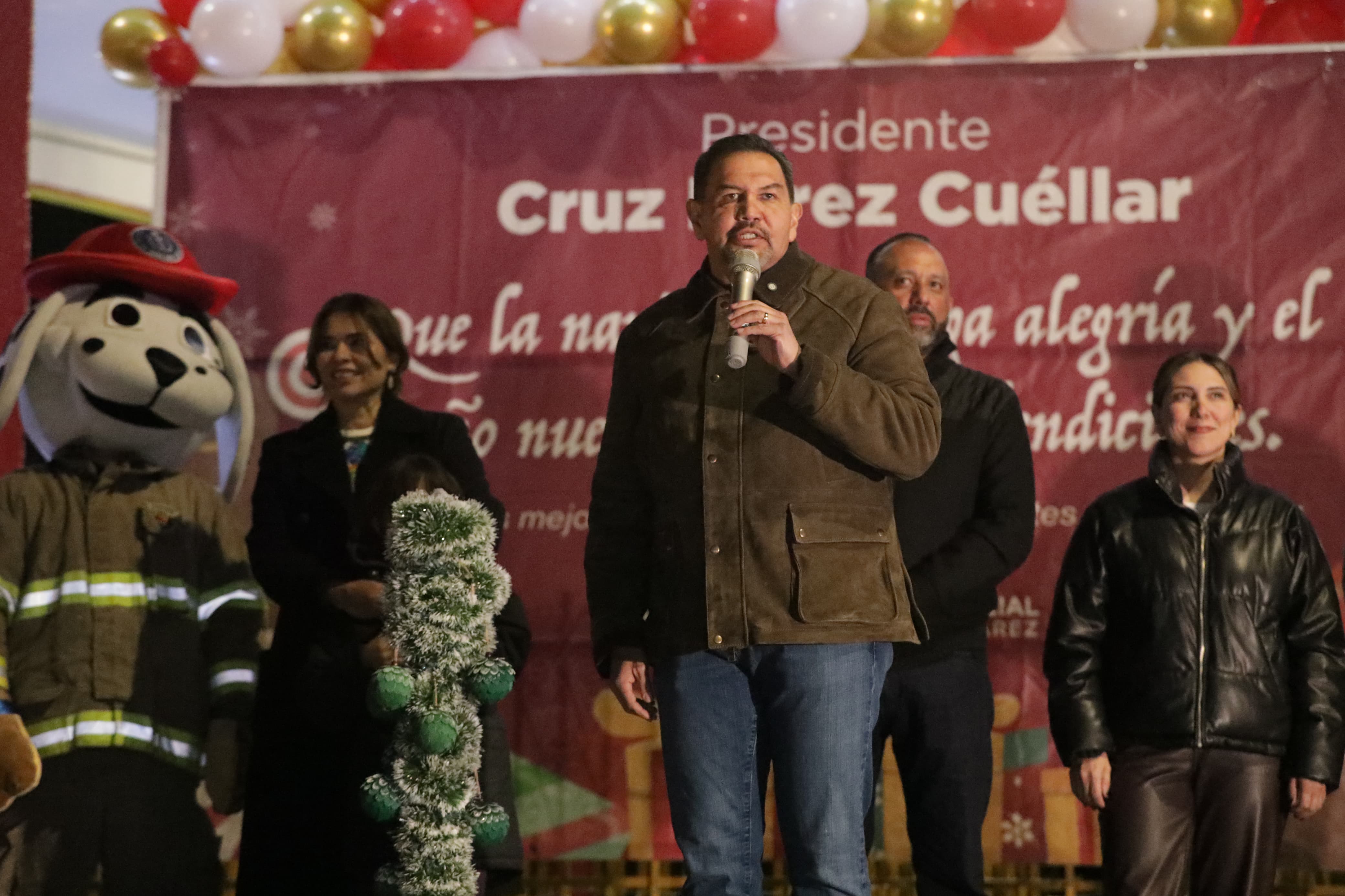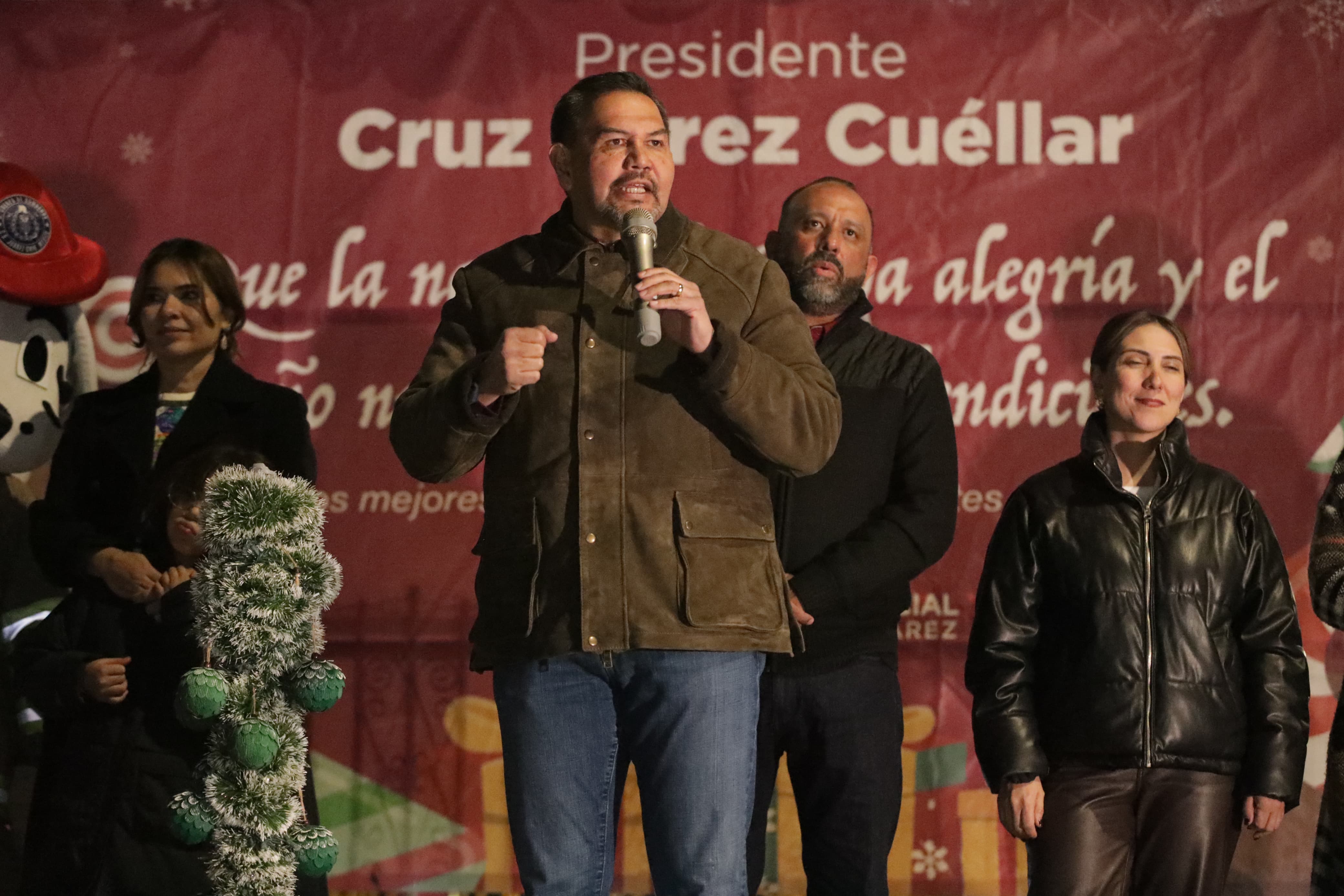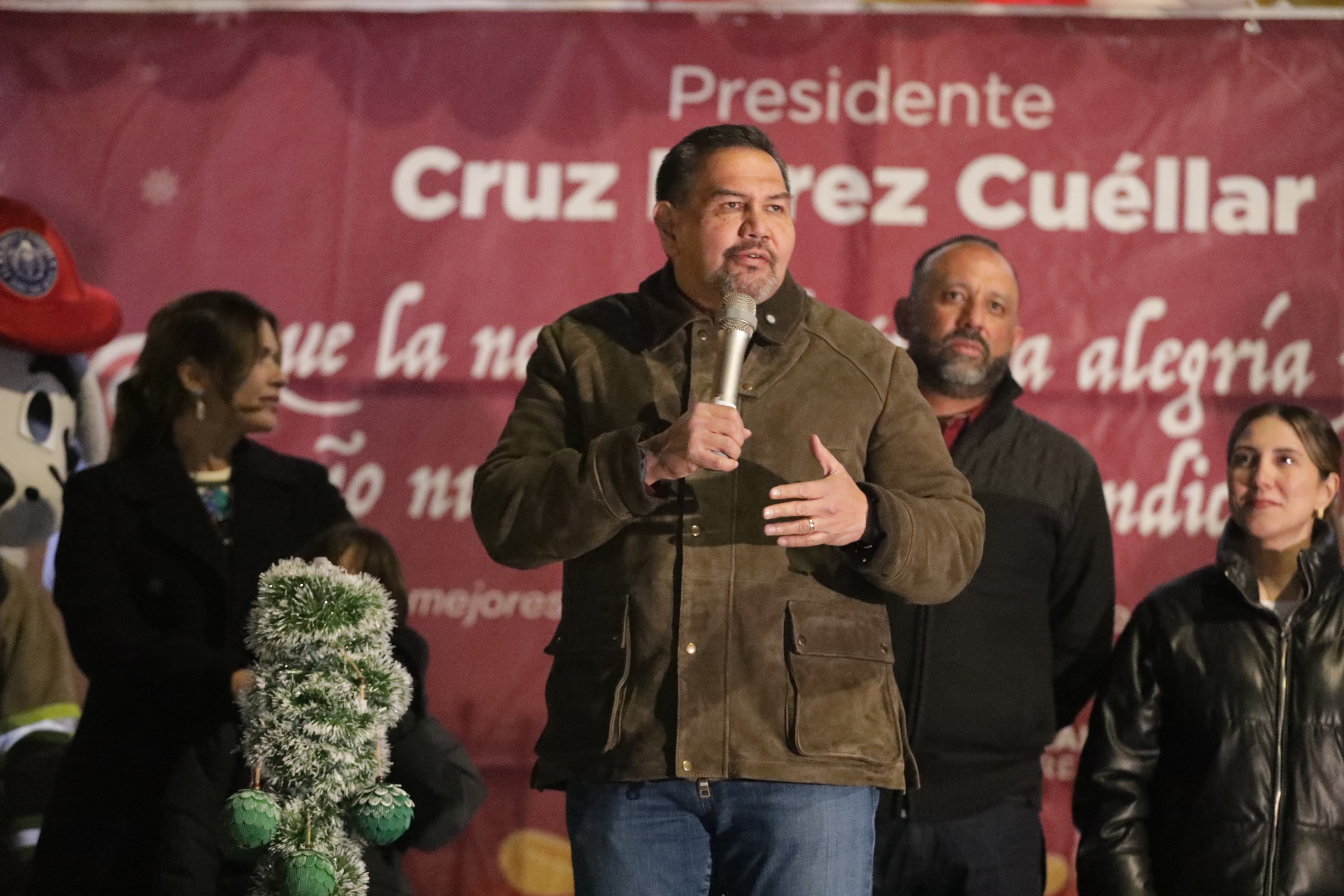 En un ambiente familiar y festivo, el Presidente Municipal, Cruz Pérez Cuéllar, encabezó el tradicional encendido de luces y del árbol navideño en el Parque Borunda, además realizó una entrega simbólica de juguetes.