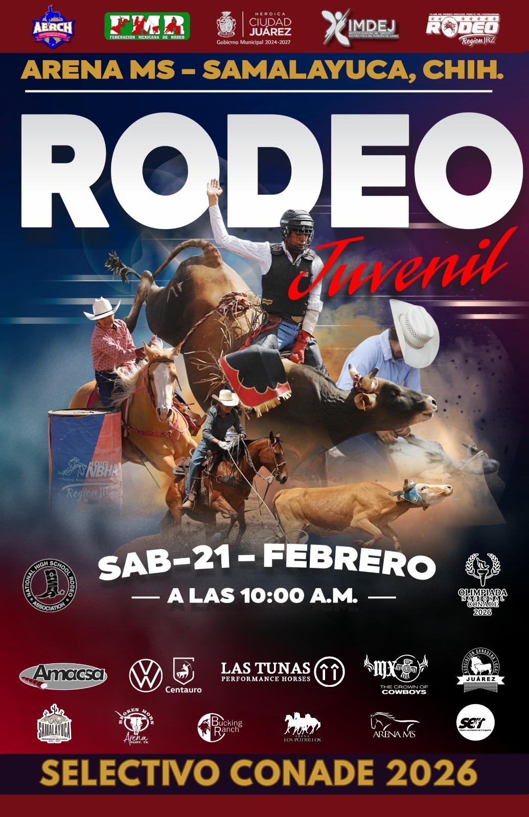 También mañana sábado habrá emoción con las etapas estatales CONADE 2026, en la segunda fecha del Selectivo Estatal de Rodeo, que será en la Arena MS en el ejido Samalayuca, a las 10:00 de la mañana.