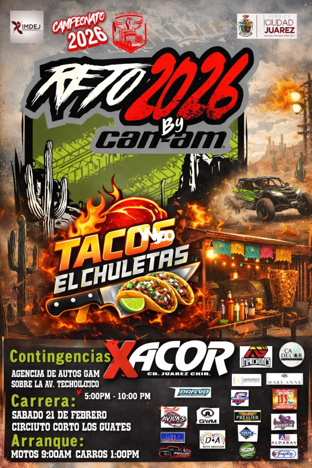 La actividad comienza con el Off Road, la primera fecha del campeonato Xacor Juárez arranca este viernes con la contingencia en la agencia de autos GWM, de 5:00 de la tarde a 10:00 de la noche; las carreras inician mañana sábado en el Circuito Corto “Los Guates”, con arranque de las motocicletas a las 9:00 de la mañana y los autos a la 1:00 de la tarde.