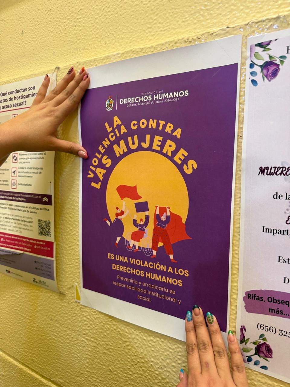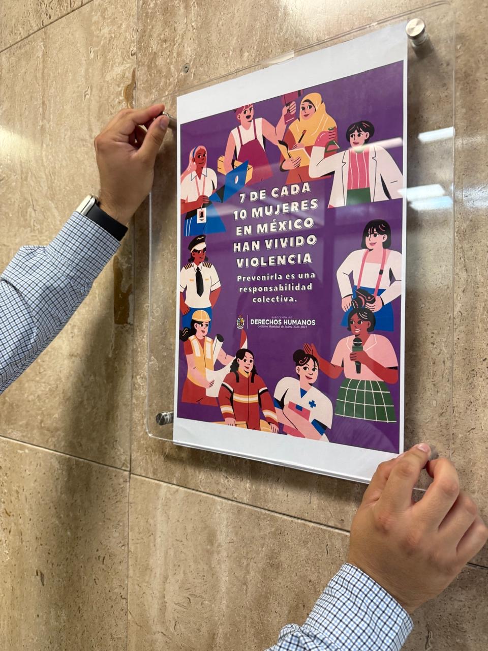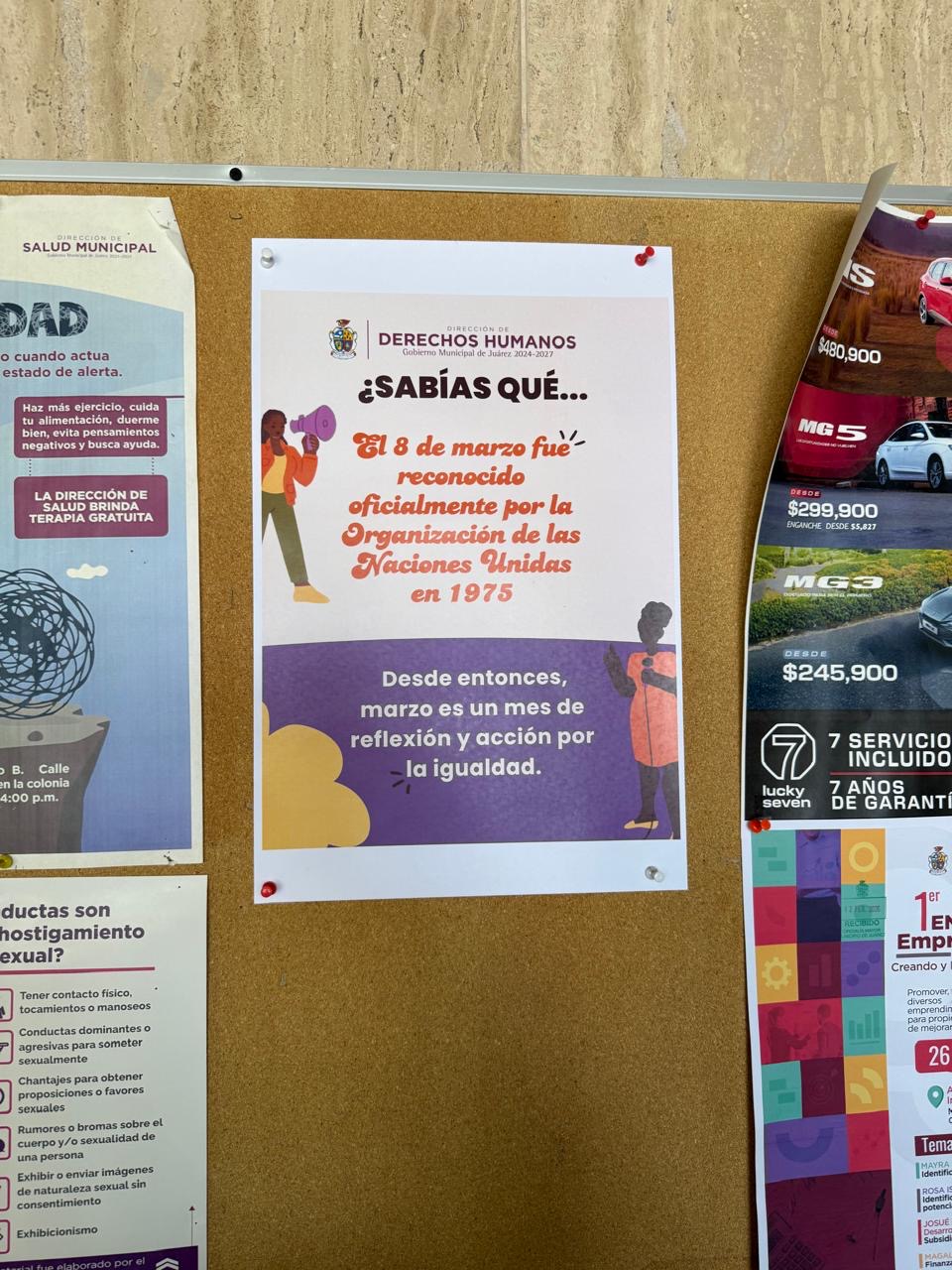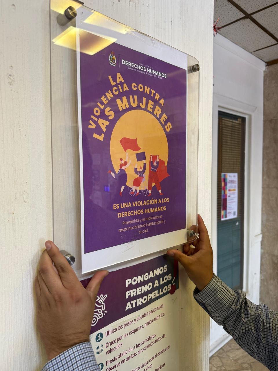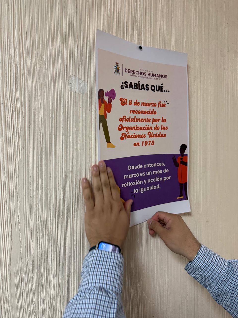 En el marco del mes de la mujer, la Dirección de Derechos Humanos llevó a cabo la colocación de posters informativos en distintas áreas de Presidencia Municipal, con el objetivo de sensibilizar a los y las servidoras públicas, así como a la ciudadanía en general, sobre la importancia de esta fecha.