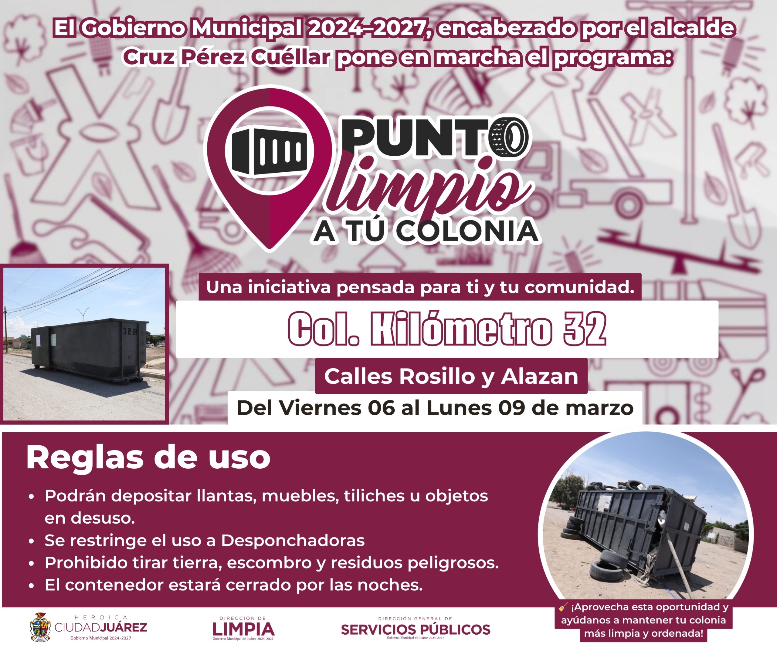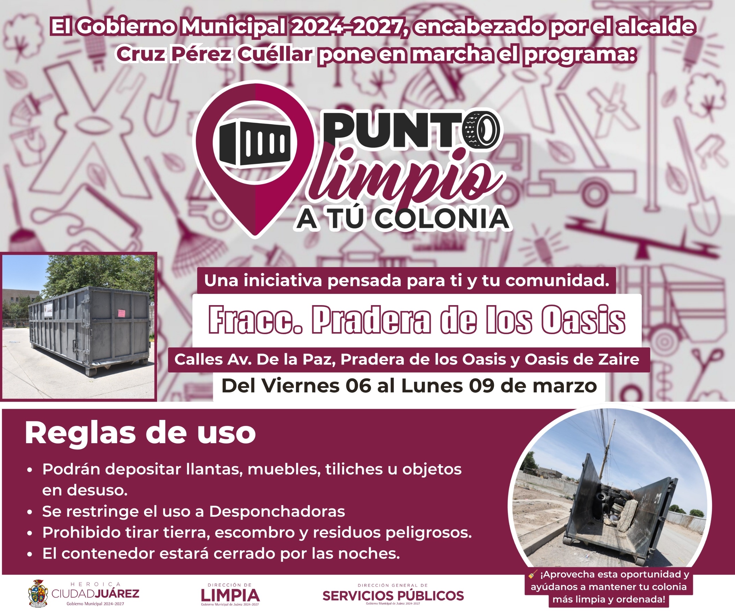 “Invitamos a todos los juarenses de estas colonias y sectores cercanos a que aprovechen la herramienta. Es un contenedor grande de 30 metros cúbicos, donde podrán depositar de manera práctica, gratuita y responsable tiliches, colchones, muebles dañados, tapetes, algunas llantas y otros objetos que ya no utilicen”, señaló.