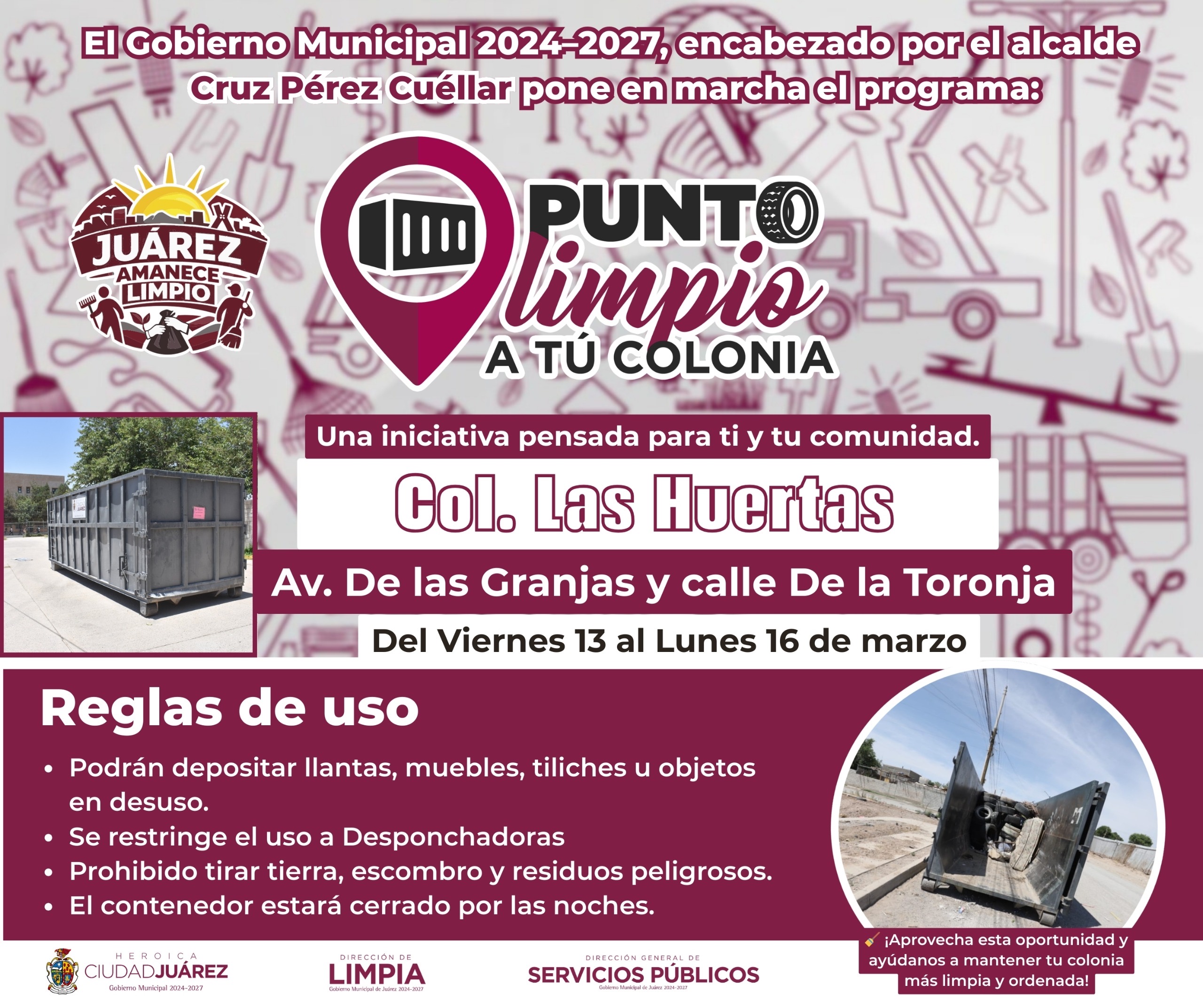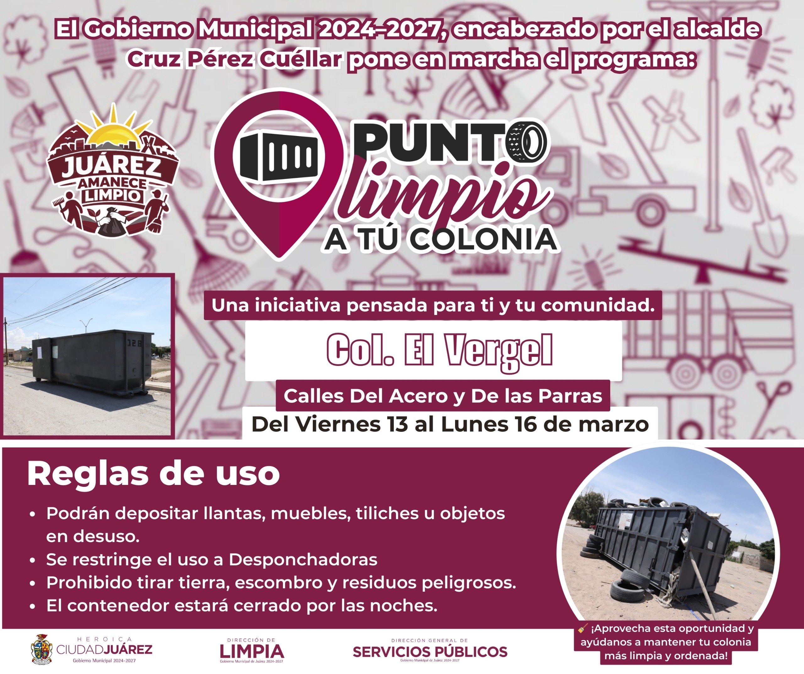 La Dirección General de Servicios Públicos Municipales, a través de la Dirección de Limpia, instaló Puntos Limpios a tu Colonia en zonas donde se lleva a cabo el programa Juárez Amanece Limpio, con el objetivo de fortalecer la limpieza urbana y fomentar la correcta disposición de residuos entre la ciudadanía.