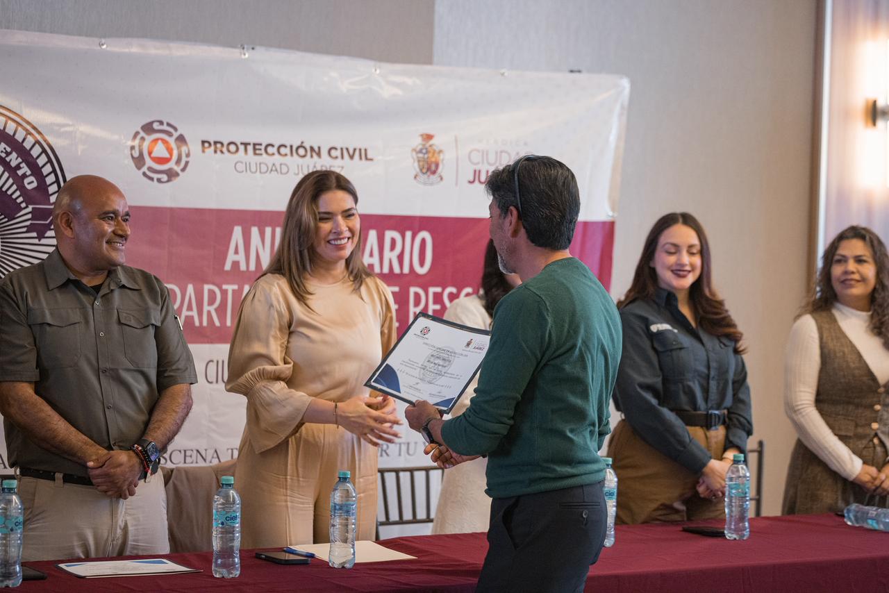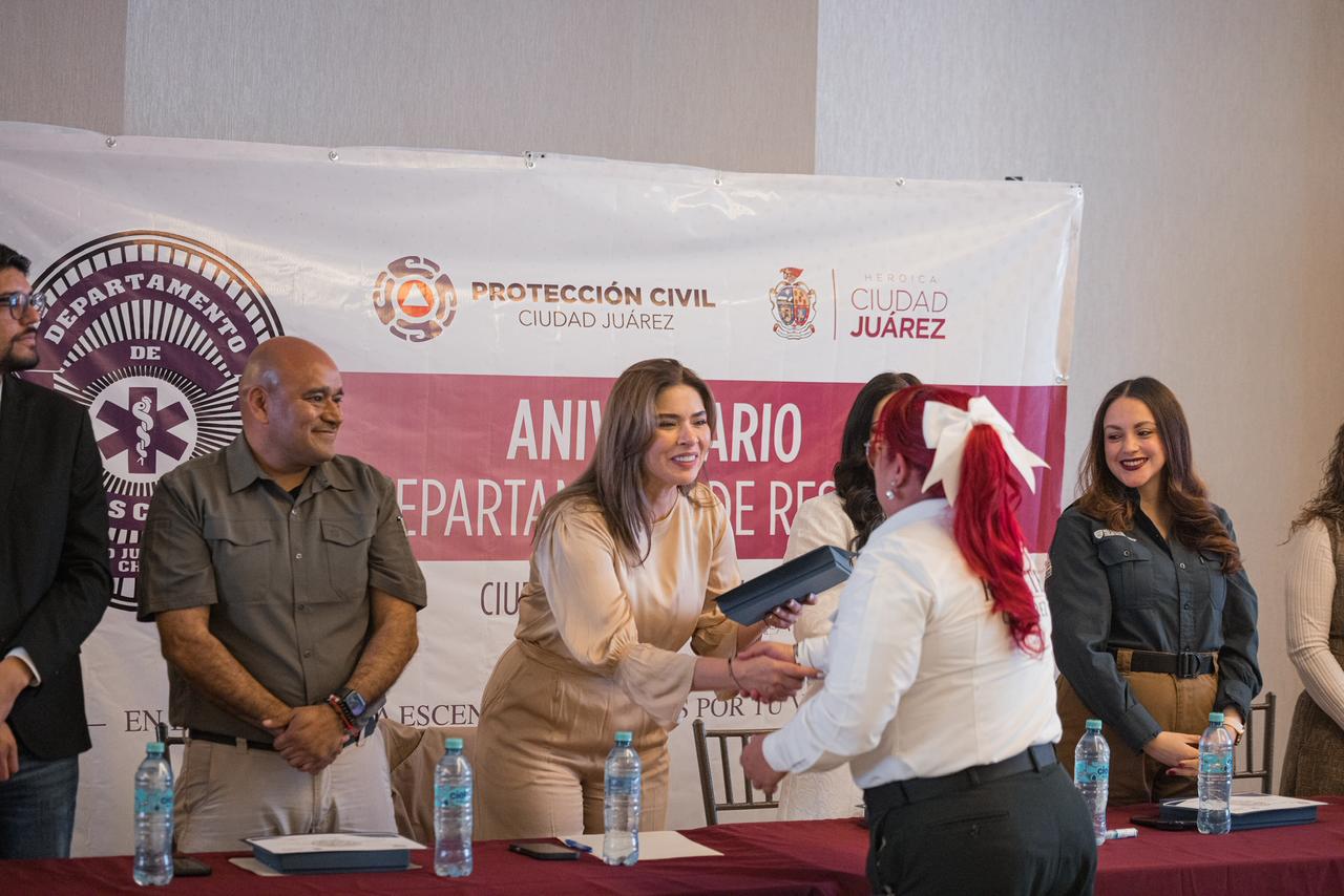 En representación del alcalde Cruz Pérez Cuéllar, la presidenta del DIF Municipal, Rubí Enríquez Parada, expresó el reconocimiento del Gobierno Municipal hacia los rescatistas, señalando que su labor es ejemplo de solidaridad, vocación y amor por Ciudad Juárez.