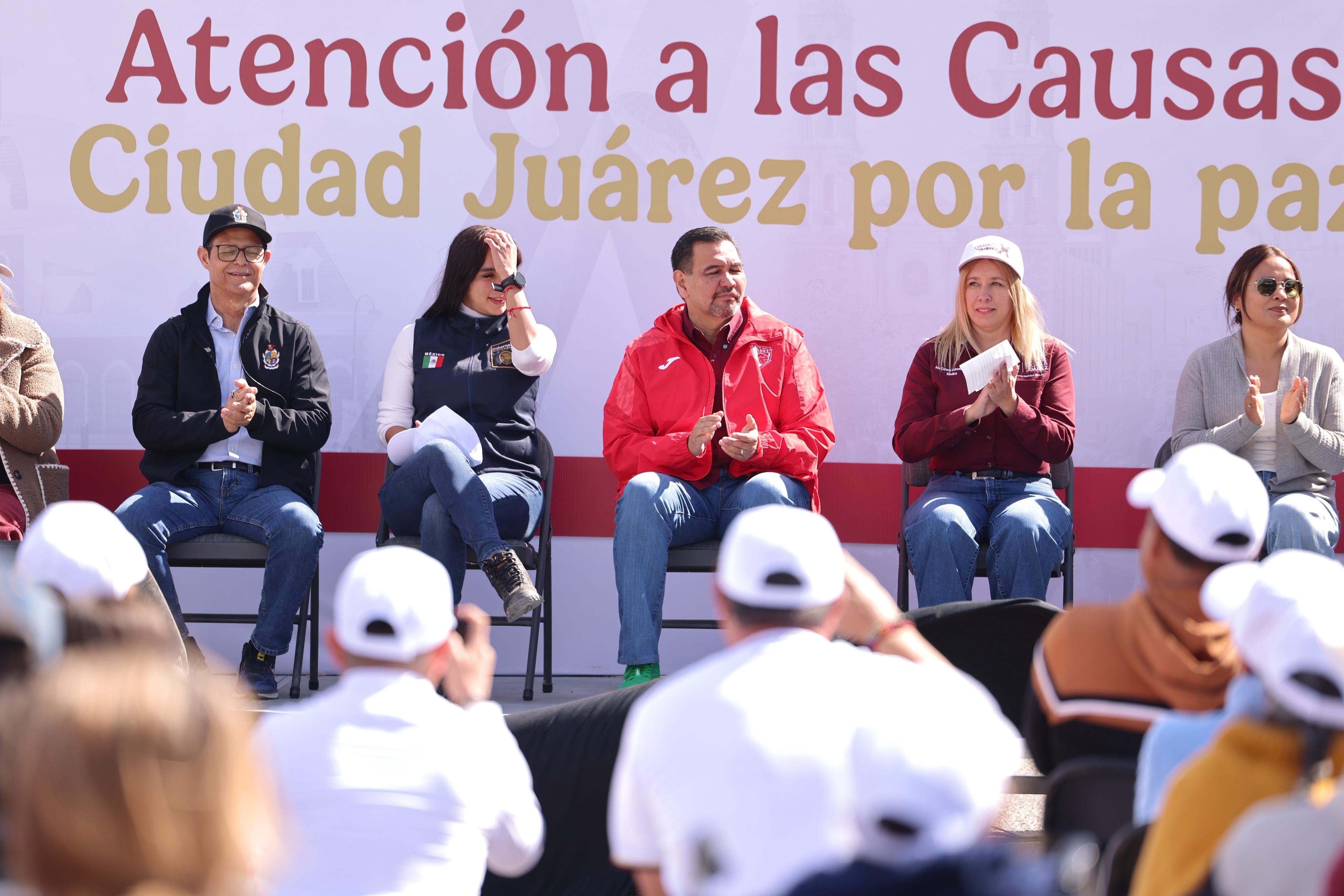 Por su parte, Arely Zarai Rojas Rivera, coordinadora de Estrategia y Análisis para la Prevención Social del Delito y Reconstrucción del Tejido Social del Gobierno Federal, explicó que la estrategia Atención a las Causas forma parte del eje uno de la estrategia nacional de seguridad que impulsa la presidenta Claudia Sheinbaum Pardo, coordinada por la Secretaría de Gobernación, y señaló que en Juárez se han conformado más de 43 comités de paz en distintas colonias.