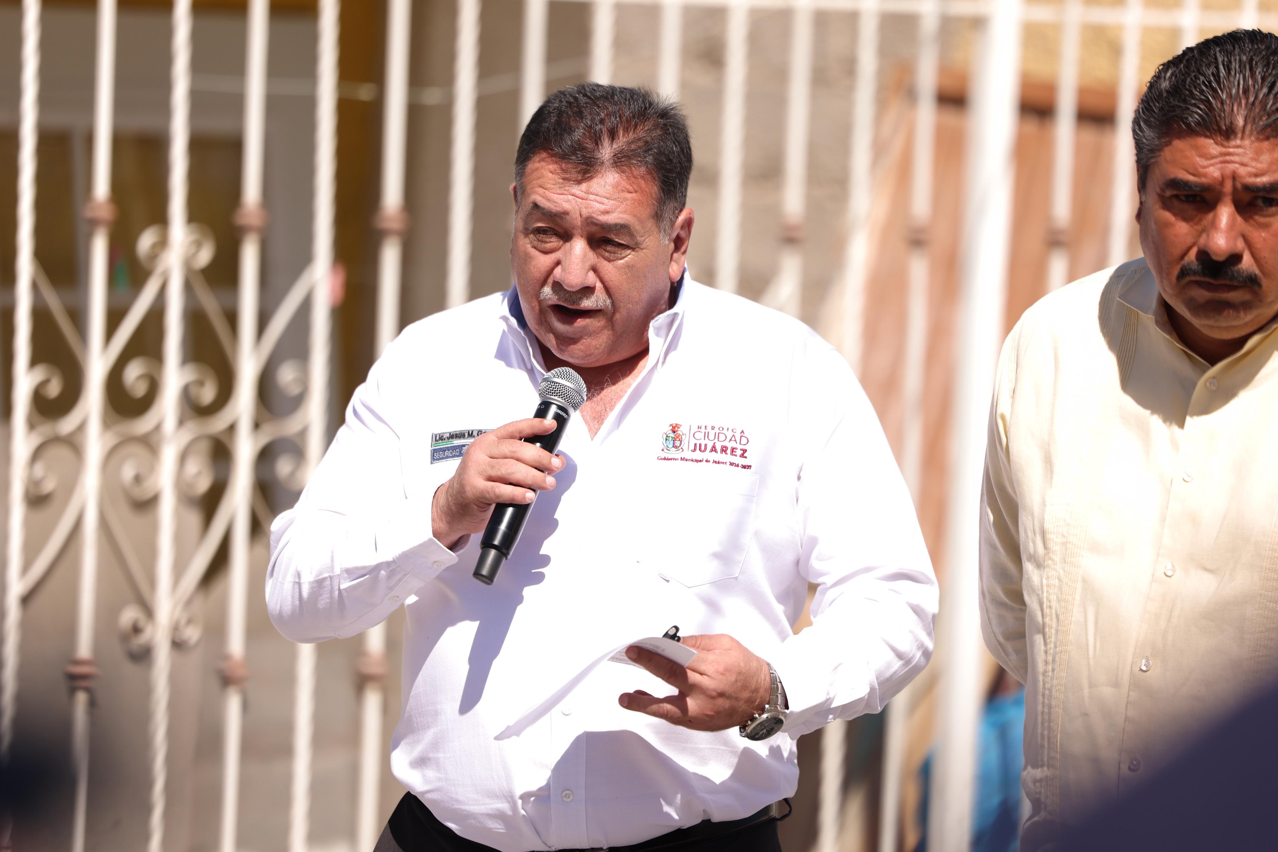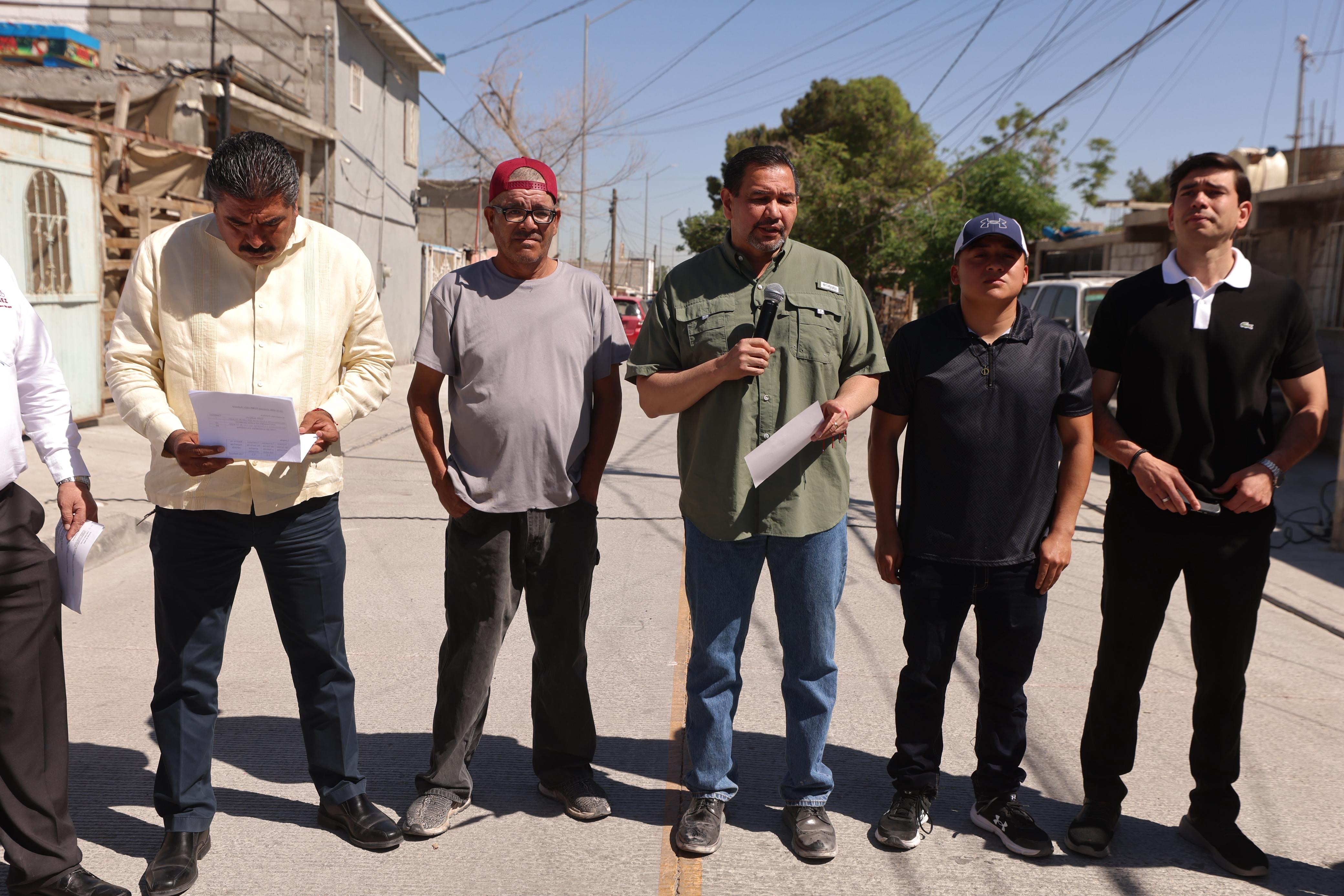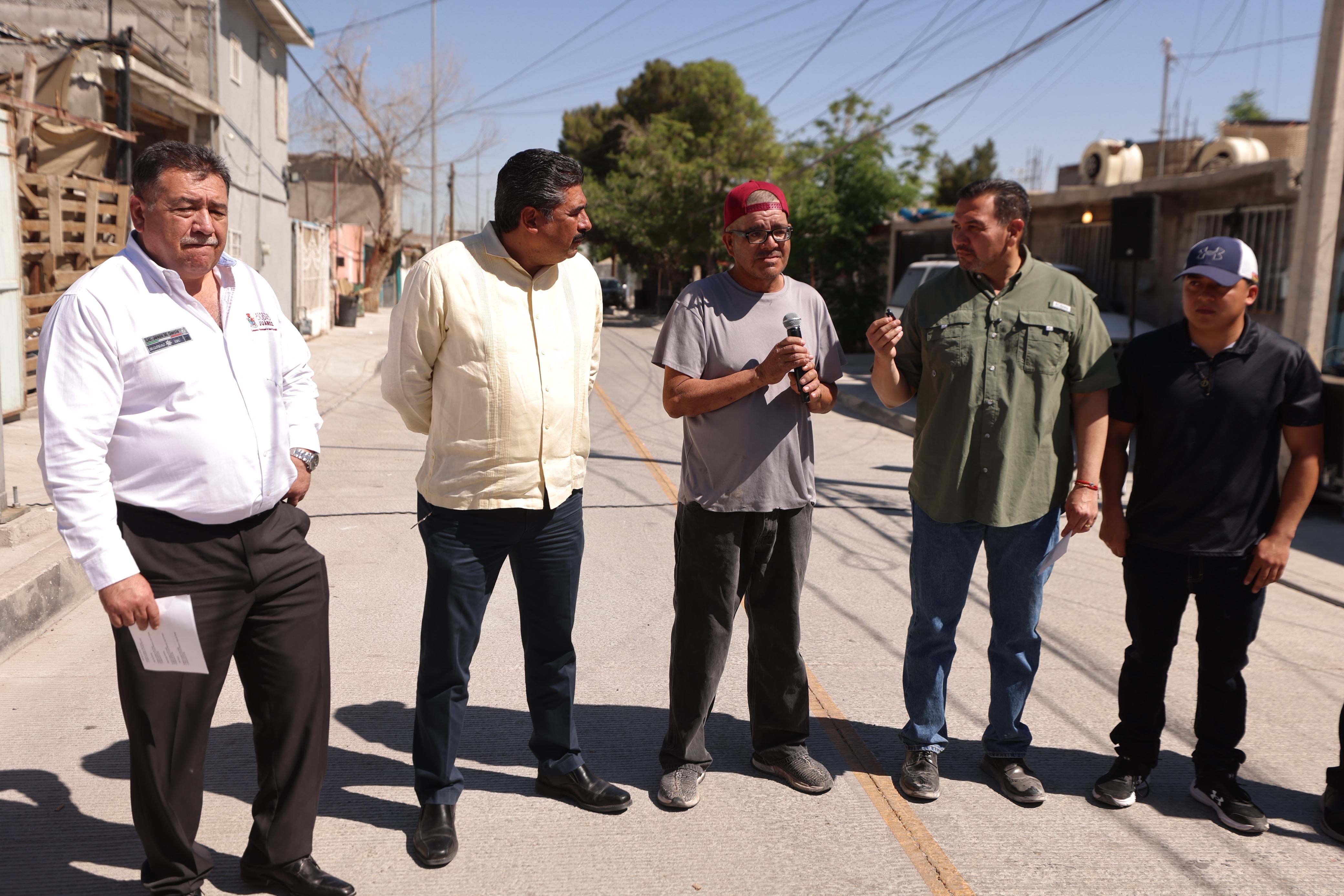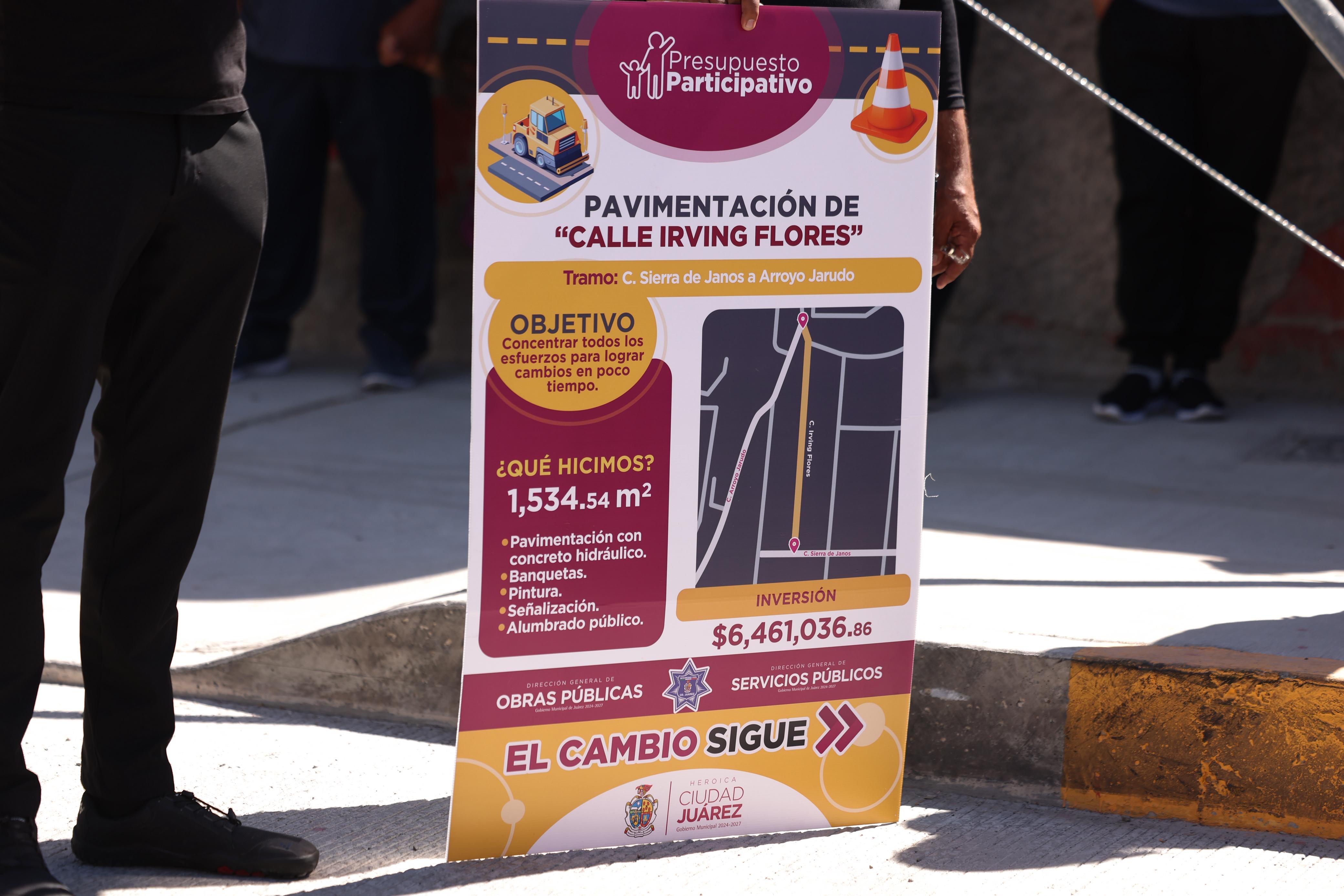 El Presidente Municipal, Cruz Pérez Cuéllar, entregó este fin de semana la pavimentación de la calle Irving Flores, obra realizada a través del esquema de Presupuesto Participativo y que beneficiará directamente a residentes del sector.
