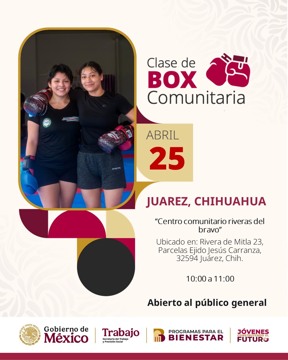 La Dirección General de Centros Comunitarios invita a la ciudadanía a participar en la “Clase de Box Comunitaria”, que se llevará a cabo este sábado 25 de abril en el Centro Comunitario Riberas del Bravo, en un horario de 10:00 a 11:00 de la mañana.
