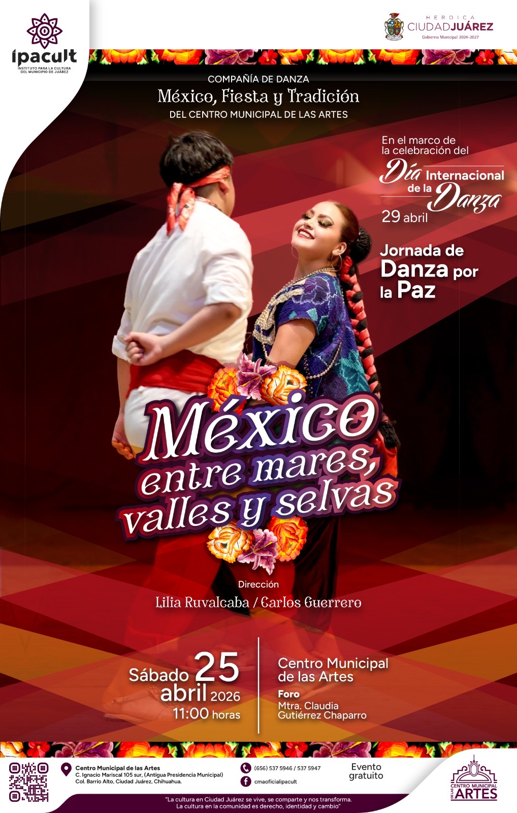 En el marco del Día Internacional de la Danza y como parte de las acciones del programa nacional Jornadas por la Paz, impulsado por el Gobierno de México, el Instituto para la Cultura del Municipio de Juárez (IPACULT) invita a la comunidad a disfrutar del espectáculo dancístico “México: Entre Mares, Valles y Selvas”.