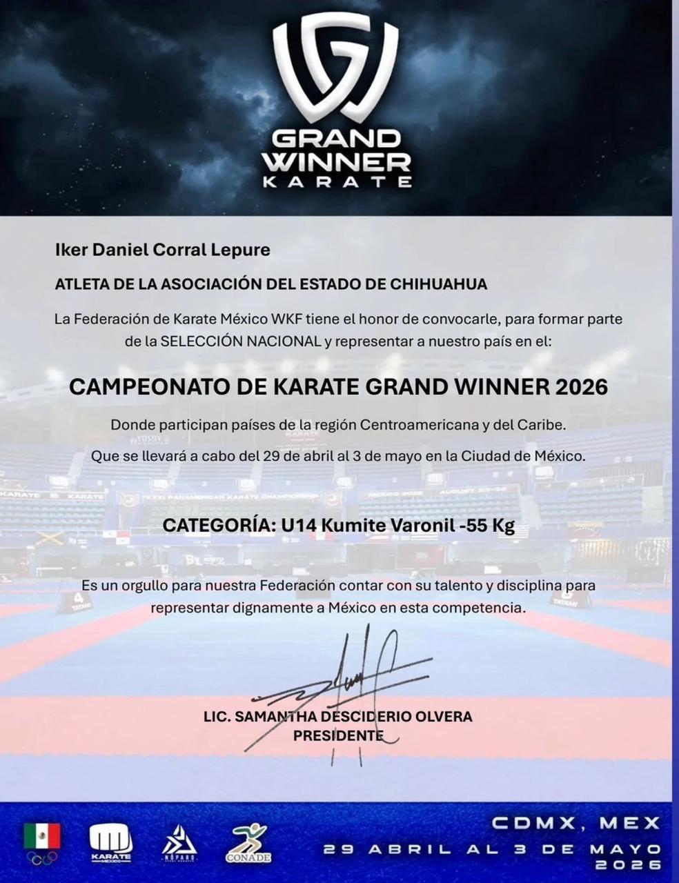 El Campeonato de Karate Grand Winner 2026, se llevará a cabo en la Ciudad de México del 29 de abril al 3 de mayo de 2026, Iker competirá en la categoría U14 Kumite (combate) varonil -55 kilos.